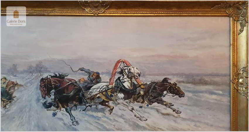 Wspaniały, ogromny (185cmx70cm) stary obraz olejny. Przedstawia niezwykle dynamiczną scenę wyścigu trojki. Znakomite ukazanie koni w pędzie ukazane w niebywałej ekspresji. Wysmakowana paleta barw oraz subtelne efekty światłocieniowe przepięknie oddają plastyczność zimowego pejzażu stepowego. Obraz cechuje świetna technika malarska, struktura farby wyraźnie wyczuwalna pod palcami. Artysta notowany na zachodnich aukcjach.