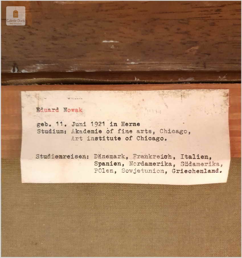 Jego wyjazdy studyjne zabrały go kiedyś do Ameryki Północnej, Afryki Północnej, przez Europę do jeziora Starnberg. Eduard Nowak stworzył kilkaset obrazów olejnych podczas swojego życia artystycznego. Artysta urodził się w Herne 11 czerwca 1921 r., a później wraz z rodzicami wyemigrował do Stanów Zjednoczonych. Mieszkał tam do około 1970 r. Od 1950 r. Pochodzący z Herne studiował sztukę i malarstwo w Chicago i Illinois. Dużo podróżował w swoim życiu, malował martwe natury, krajobrazy i figuratywne malarstwo ekspresyjne. Jedna z jego europejskich podróży studyjnych poprowadziła Eduarda Nowaka na Majorkę w latach siedemdziesiątych. Prawdopodobnie również osiedlił się tam tymczasowo. Jest jednym z wielkich międzynarodowych ekspresjonistów, którzy stali się znani dopiero w ostatnich latach.