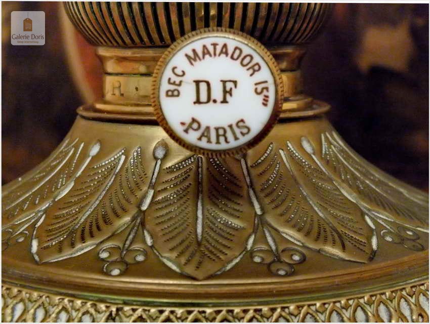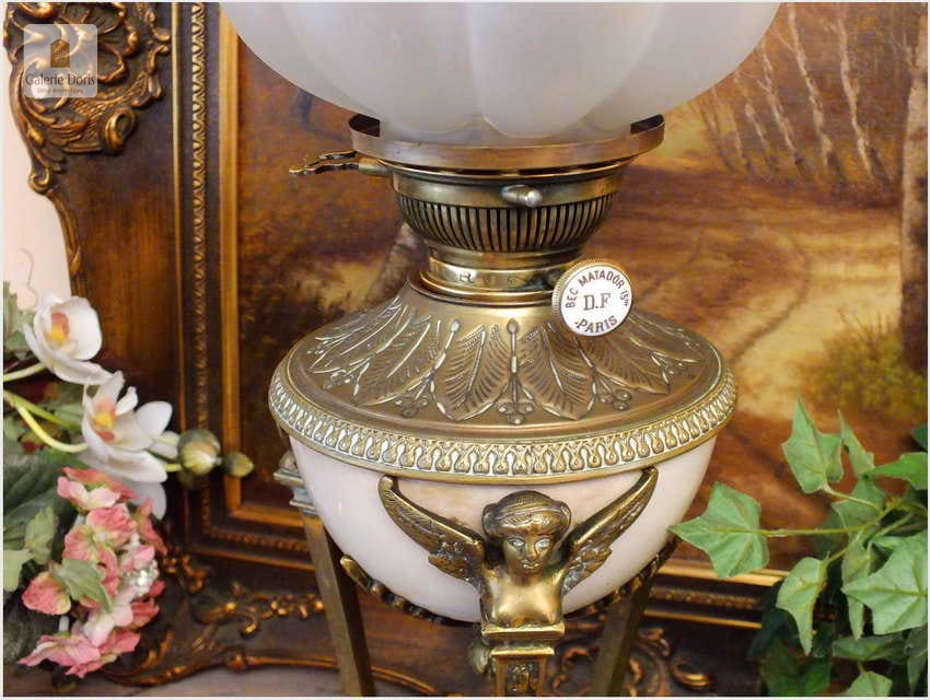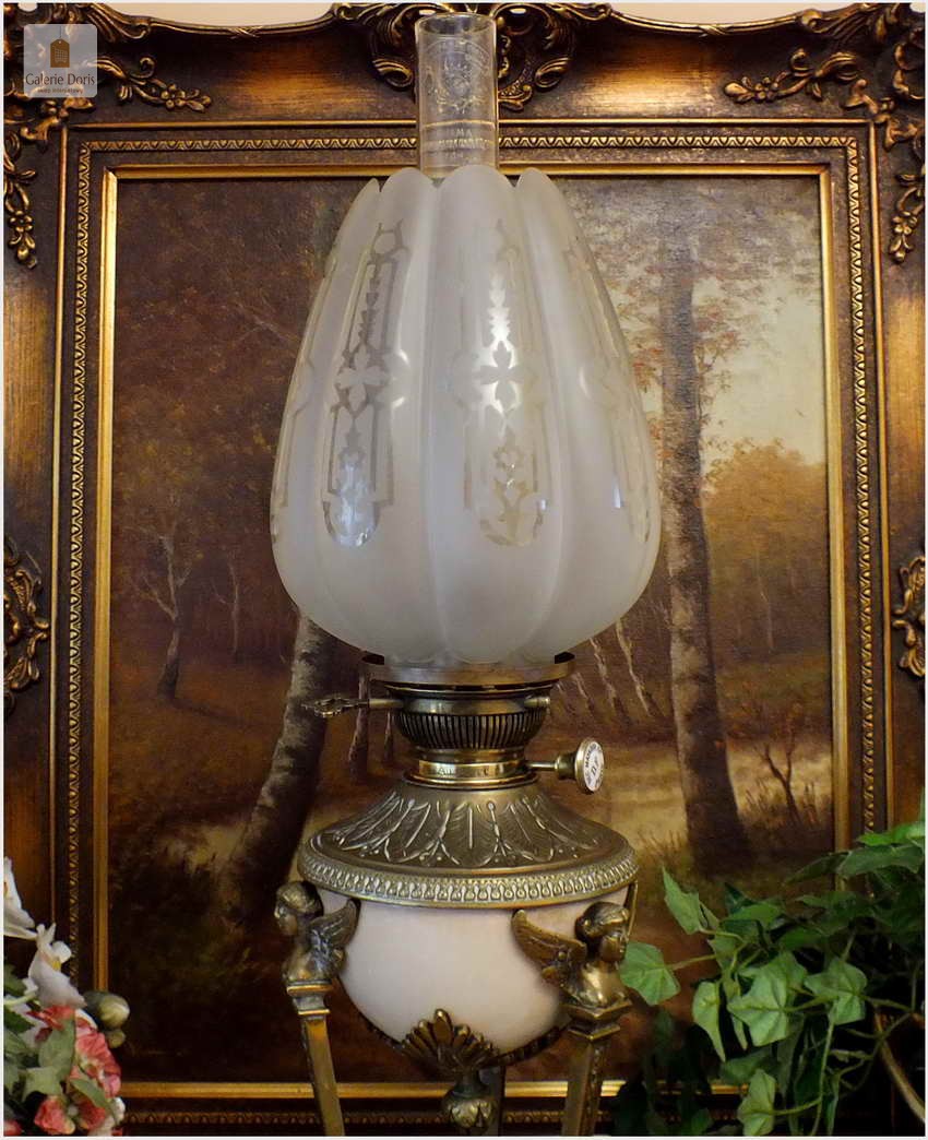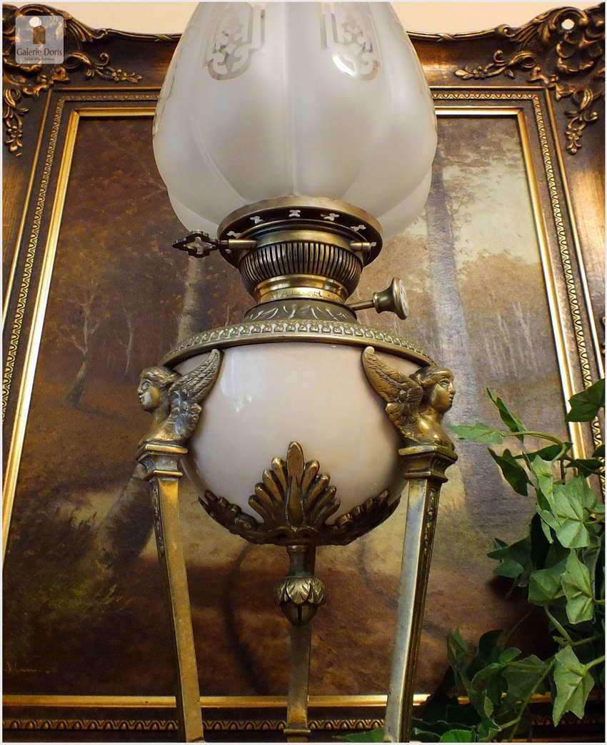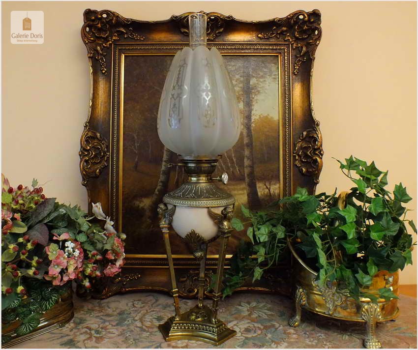Piękna stara Lampa naftowa Styl Empire - oryginał!. Lampa wykonana z brązu o typowych ornamentach w epoki. Brenner 15' sygnowany na pokrętle. Kominek kryształowy sygnowany, klosz bez uszkodzeń. Podstawa oryginalna z epoki, szkła bez uszkodzeń. Całość po profesjonalnej konserwacji, wymieniony knot - lampa gotowa do natychmiastowego użytkowania. Ponad stuletnia lampa jest w pełni sprawna, czeka tylko na zalanie nafty oraz nowego właściciela.