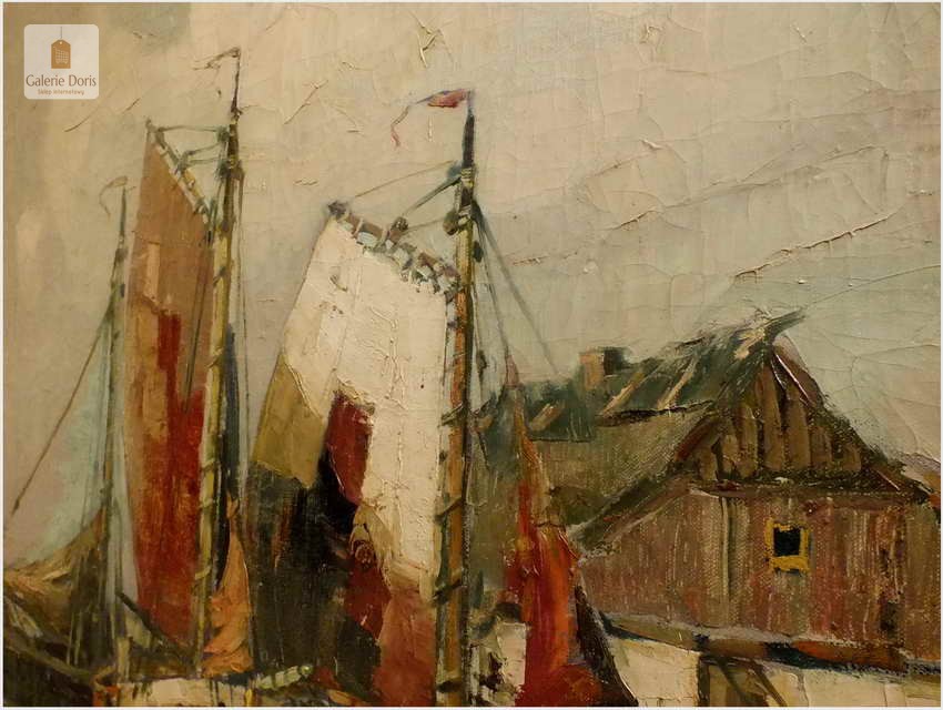 Typowy dla artysty motyw kutrów żaglowych ukazywanych przy brzegu, na redzie i w morzu. W tym przypadku przedstawiono powrót rybaków z połowów. Jest to bardzo barwne przedstawienie specyfiki rybołówstwa. W pracy pojawił się rzadko spotykany w twórczości tego malarza motyw postaci ludzkich. Obraz malowany mocnymi, odważnymi pociągnięciami pędzla. Minimalna klakelura na płótnie, bardzo dekoracyjny pejzaż morski.