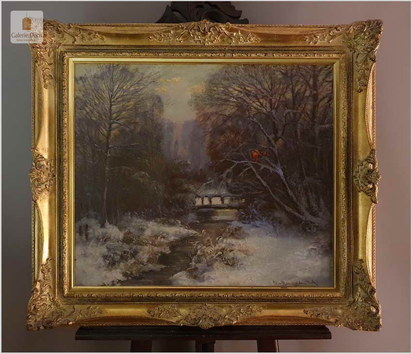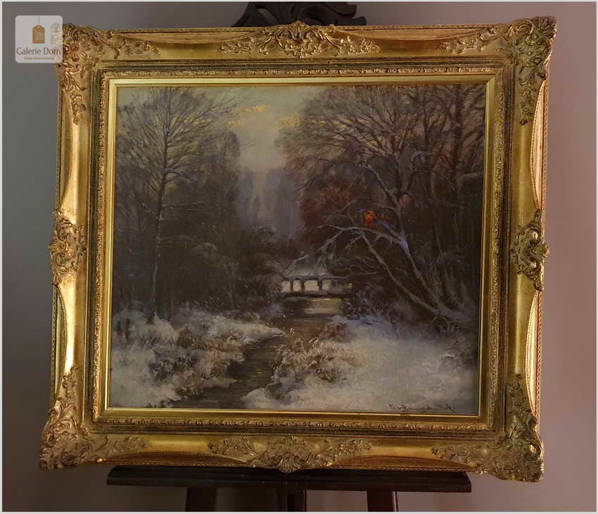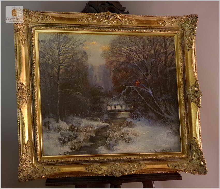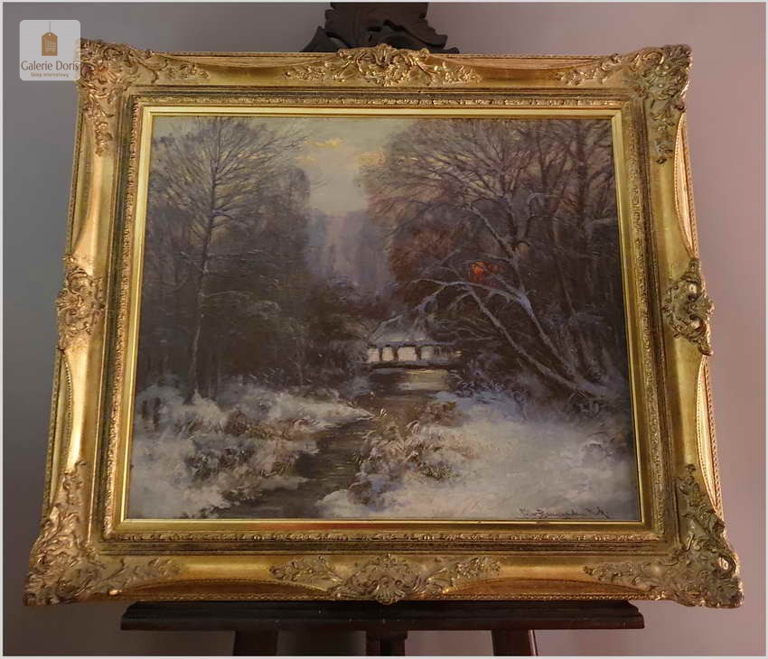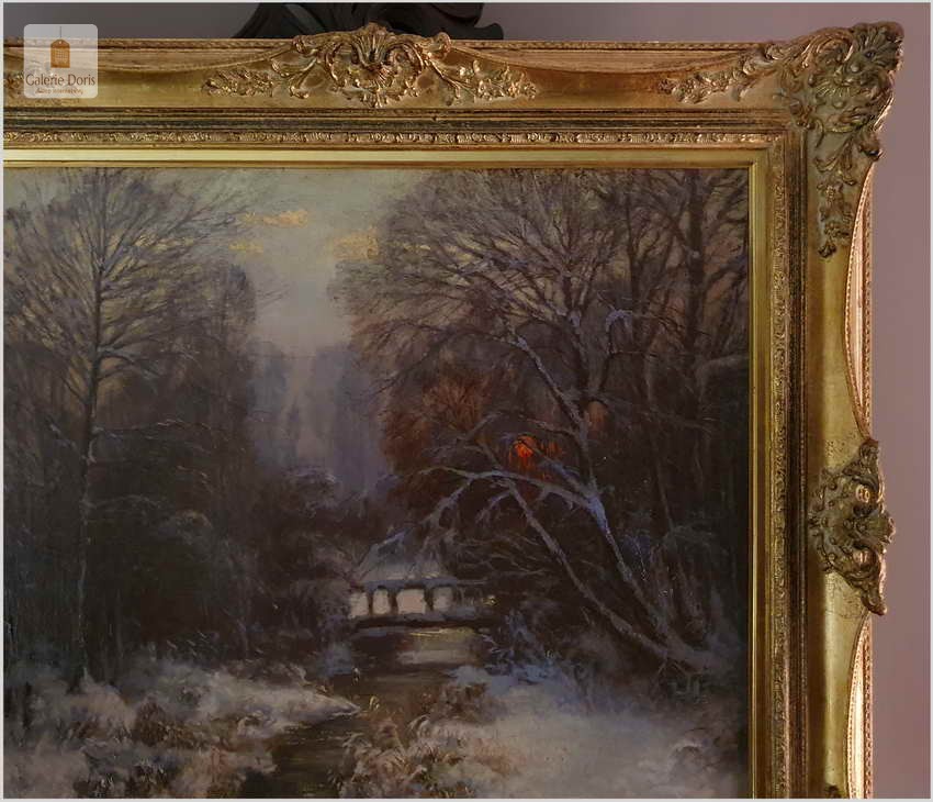 Carl Müller-Baumgarten, zimowy wieczór. Klimatyczny zimowy krajobraz leśny, ze strumieniem i mostem w gasnącym wieczornym świetle dniem, pięknie uchwycony ostrym pędzlem, olej na płótnie, ok. 1910 r., sygnowany u dołu po prawej Müller-Baumgarten Mnch. W misternie zdobionej złotej ramie z ozdobnymi paskami, motywami rocailles i muszli, kontrastowa ramka passe-partout, złocona i polerowana wewnątrz. Widoczne małe spękania płótna. Malarz posiada wysokie średnie notowania – Polecamy!