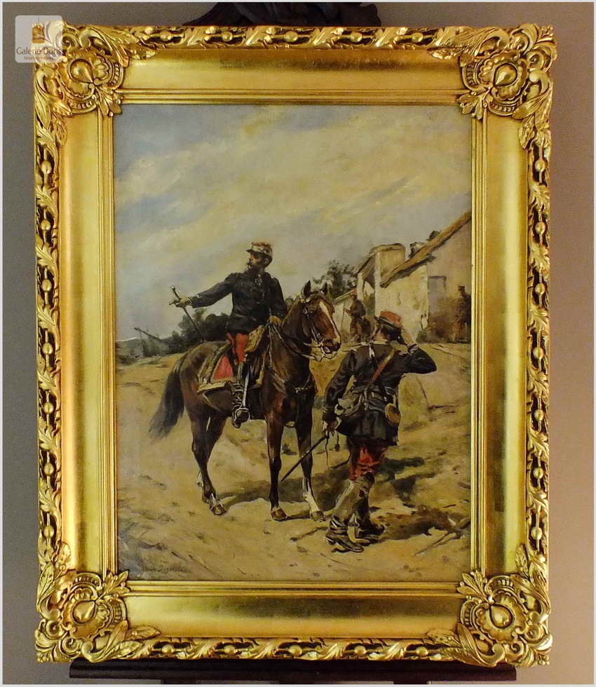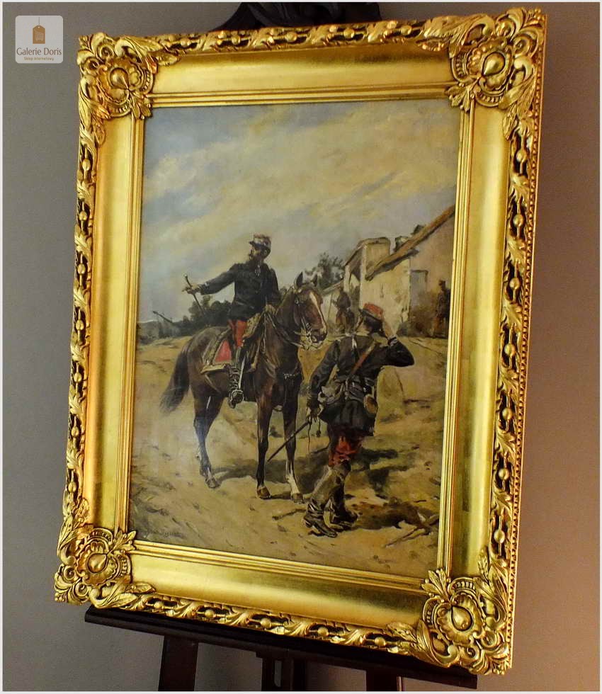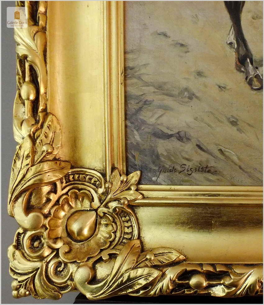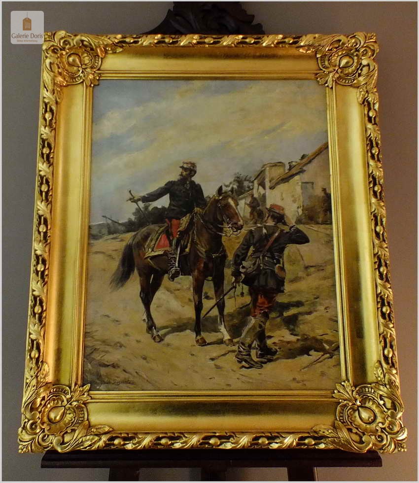 Guido Sigriste (Aarau - Switzerland, 1864 - Pau, 1915). Był uczniem Gustave'a Boulanger'a i Julesa Lefebvre'a w Paryżu. Wystawiał na Salonie Artystów Francuskich w 1905 roku i otrzymał wyróżnienie. Poświęcił znaczną część swoich prac na tematykę wojen i okresu napoleońskiego. Guido Sigriste, urodzony w roku 1864 w Szwajcarii, należał do pokolenia, którego ojcowie walczyli w wojnie Napoleońskiej przetoczącej się po całej Europie, naznaczonym pośrednio doświadczeniem wojen napoleońskich, tematyka napoleońska stała się jednym z głównych nurtów jego twórczości. Obraz sygnowany p.d Guido Sigriste, rama orygnialna XIXw po profesjonalnej renowacji złocona płatkiem złota.