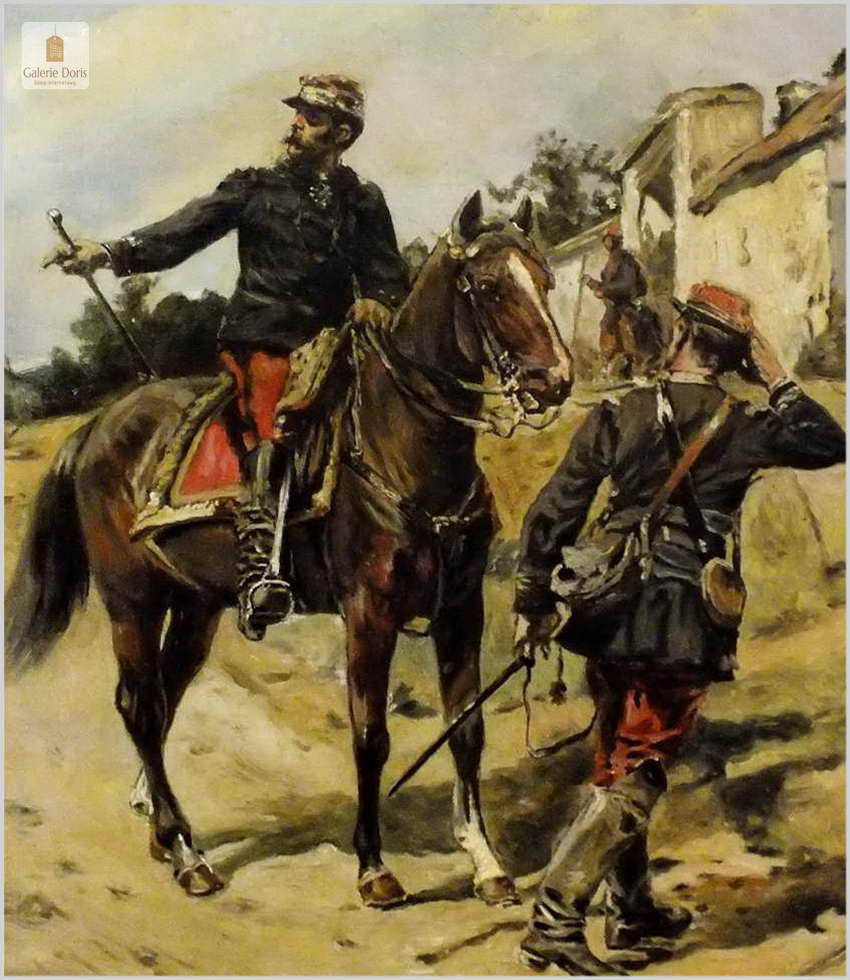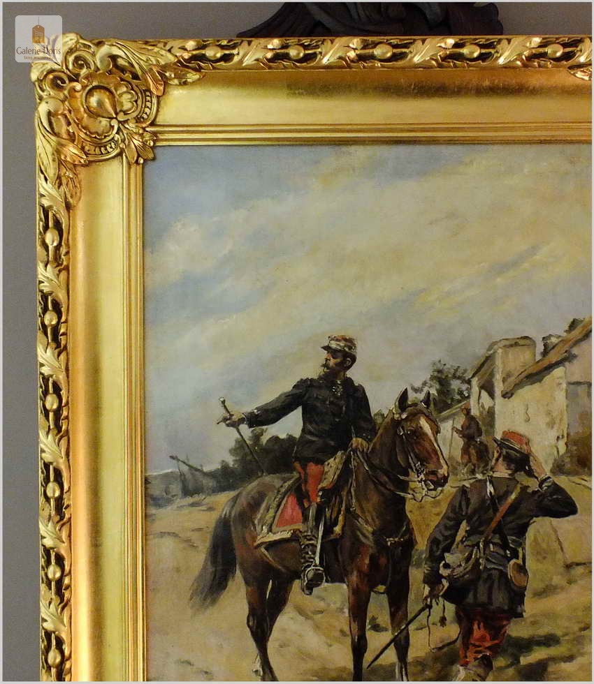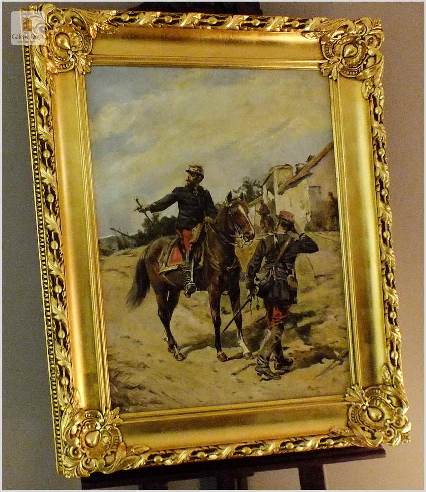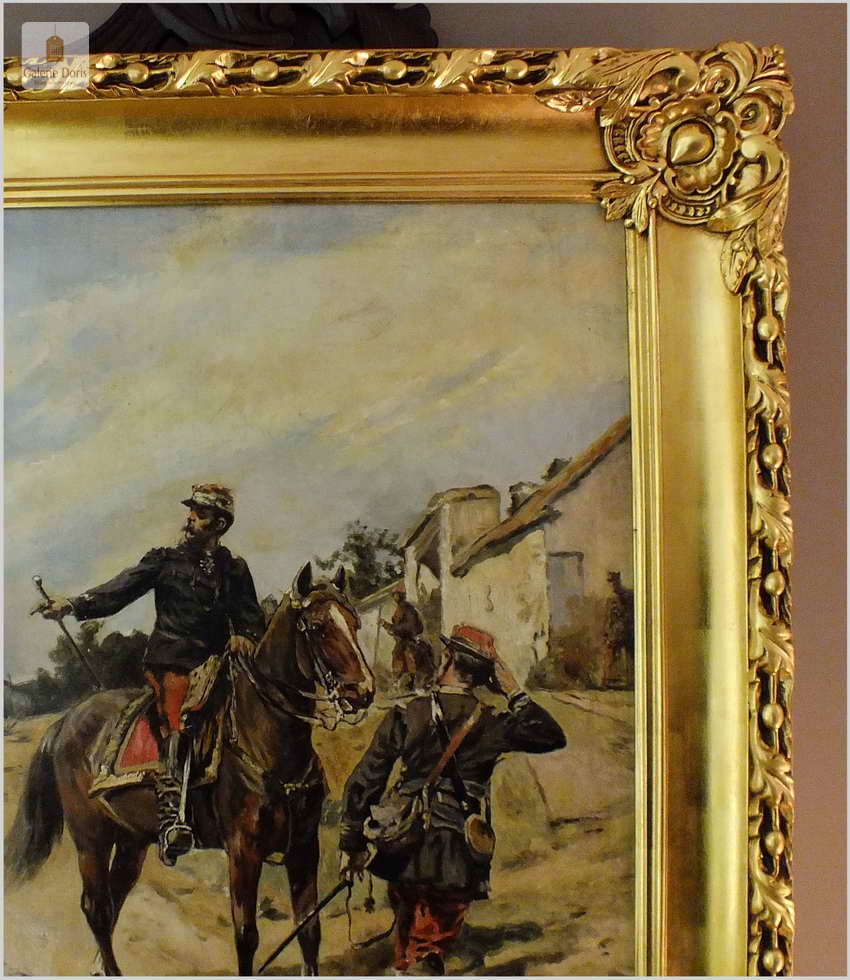 Guido Sigriste (Aarau - Switzerland, 1864 - Pau, 1915). Był uczniem Gustave'a Boulanger'a i Julesa Lefebvre'a w Paryżu. Wystawiał na Salonie Artystów Francuskich w 1905 roku i otrzymał wyróżnienie. Poświęcił znaczną część swoich prac na tematykę wojen i okresu napoleońskiego. Guido Sigriste, urodzony w roku 1864 w Szwajcarii, należał do pokolenia, którego ojcowie walczyli w wojnie Napoleońskiej przetoczącej się po całej Europie, naznaczonym pośrednio doświadczeniem wojen napoleońskich, tematyka napoleońska stała się jednym z głównych nurtów jego twórczości. Obraz sygnowany p.d Guido Sigriste, rama orygnialna XIXw po profesjonalnej renowacji złocona płatkiem złota.
