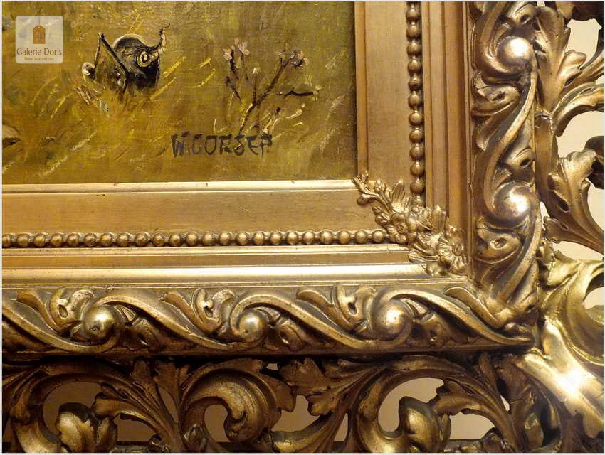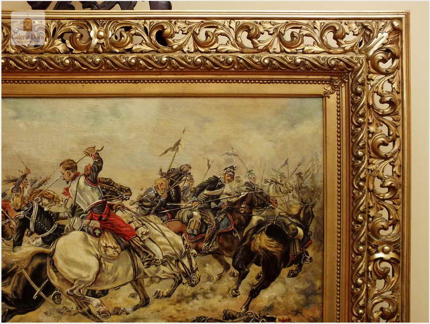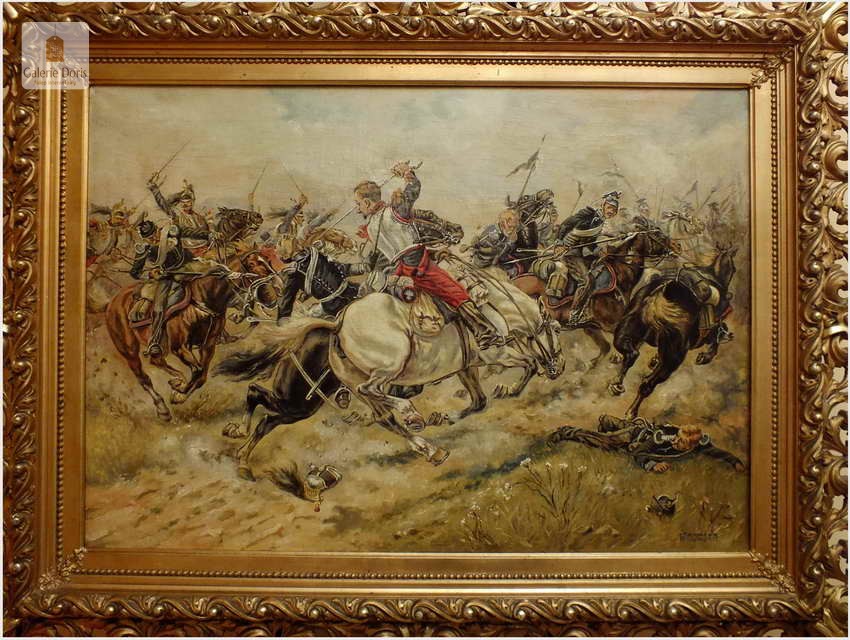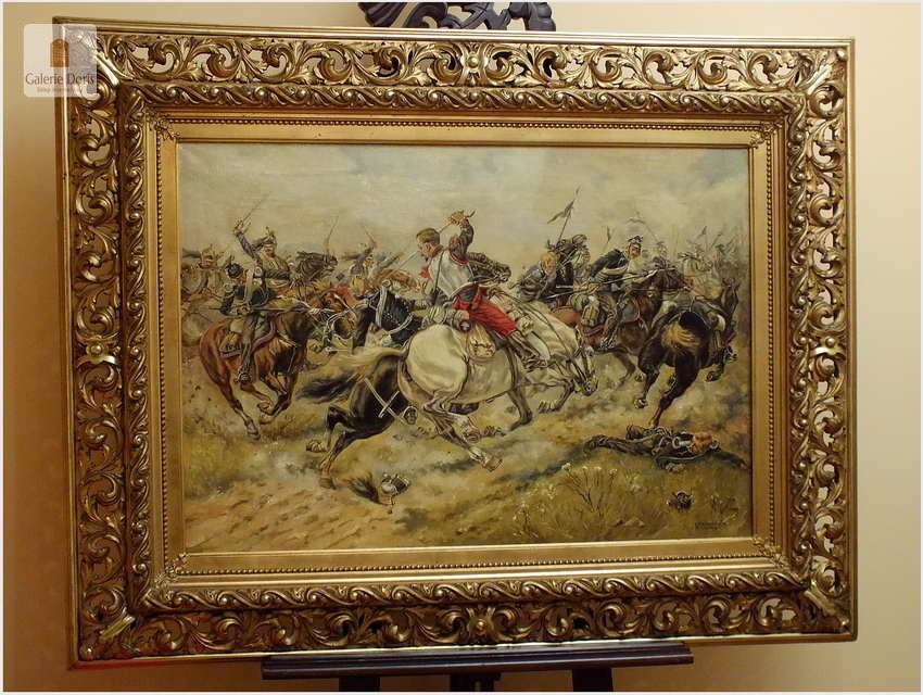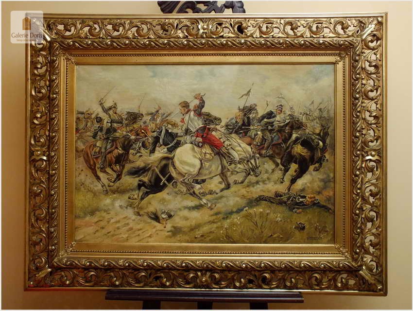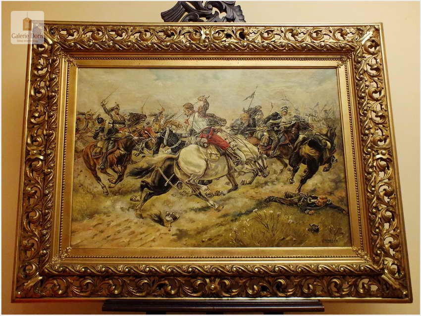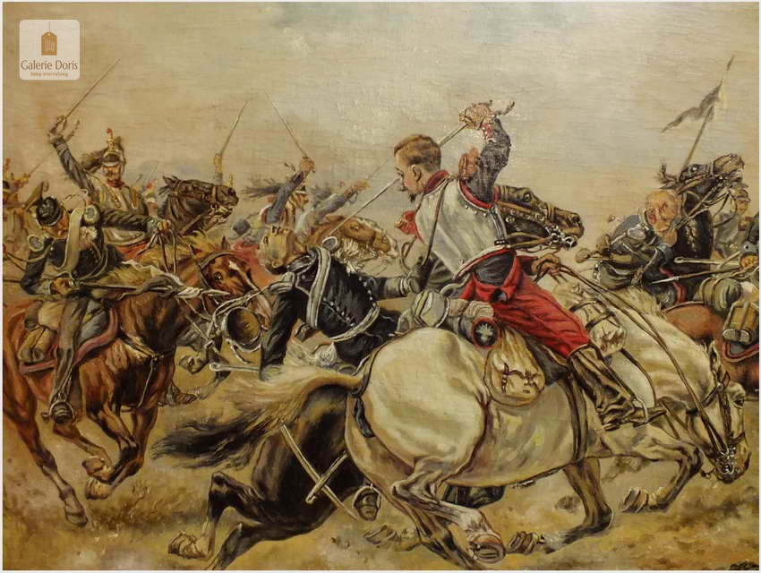 (niem. Völkerschlacht bei Leipzig) W horyzontalnej kompozycji autor ujął fragment pola bitwy. Fragment ten odnosi się do bitwy pod Lipskiem, która miała miejsce w dniach 16-19 października 1813 roku, zwanej inaczej „bitwą narodów”, gdyż brało w niej udział aż 16 nacji. Konflikt dotyczył wojsk francuskich Napoleona Bonaparte z antyfrancuską koalicją (armia austriacka, pruska, rosyjska i szwedzka). Była to największa bitwa w kampaniach napoleońskich, ale też jego najcięższa porażka. Bitwa miała także tragiczne skutki dla Polaków- zabitych i rannych zostało siedem tysięcy Polaków, Książę Józef Poniatowski, mianowany w czasie jej trwania przez Napoleona marszałkiem Francji, utonął w Elsterze, wcześniej kilkakrotnie postrzelony. Z piechoty ocalało tak niewielu, że z niedobitków utworzono później tylko pułk pieszy. Nastąpił oficjalny koniec Księstwa Warszawskiego i losy Polaków przeszły w ręce cara Aleksandra I i jego sojuszników. Praca sygnowana w prawym, dolnym rogu: "W. CORSEP" (sygnatura oryginalna, autorska). Na odwrocie znajduje się nalepka z domu aukcyjnego z Hamburga.