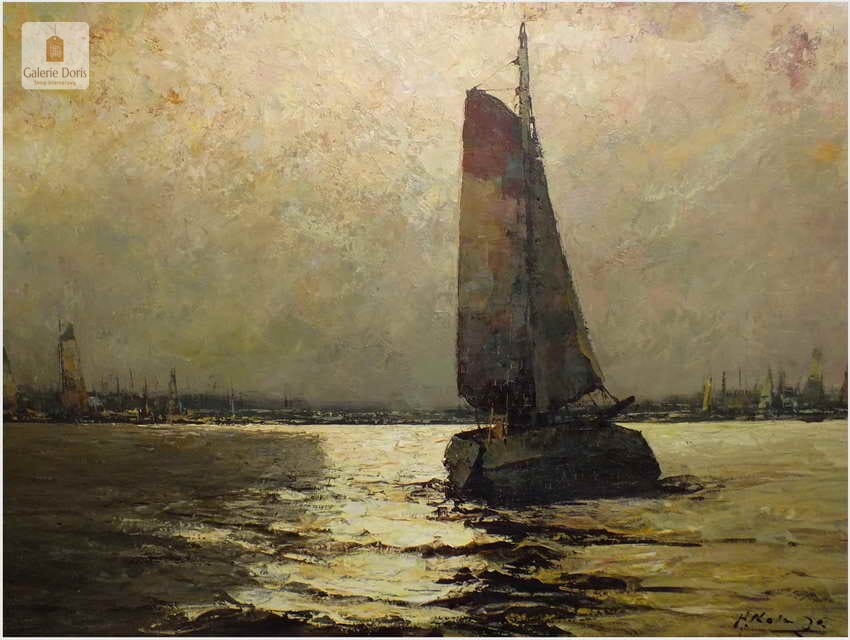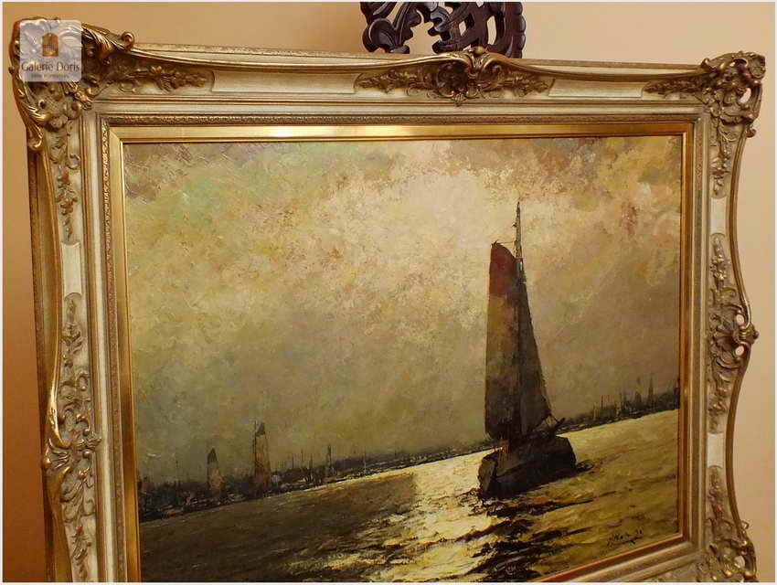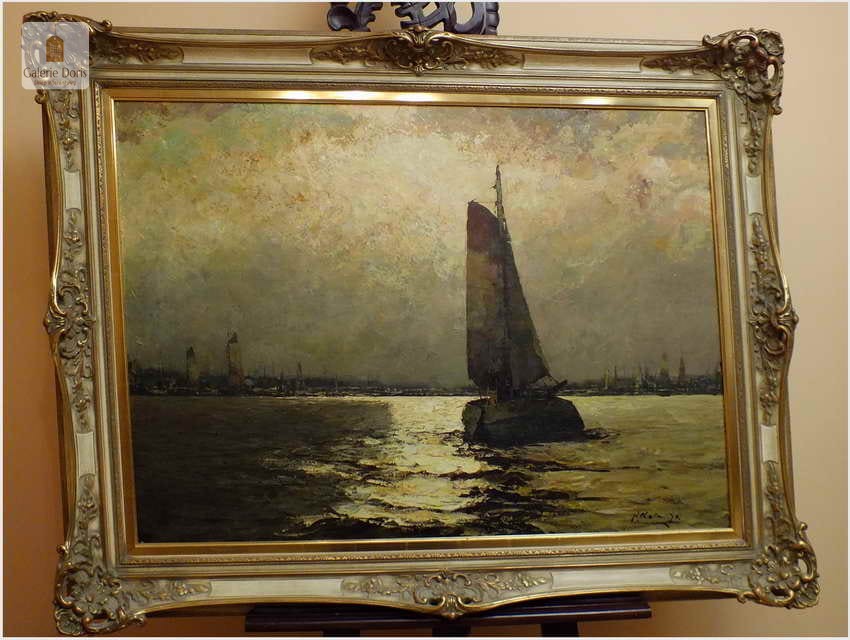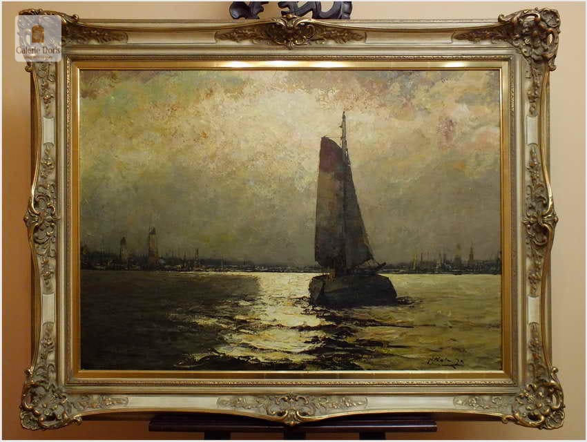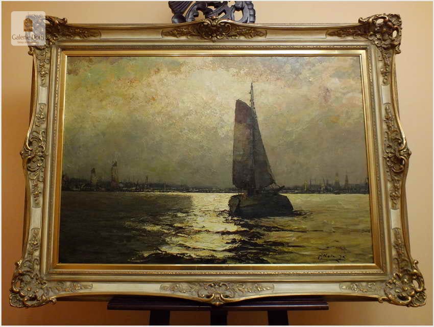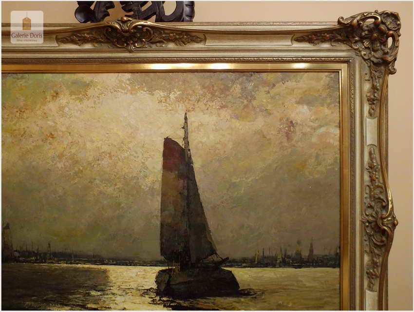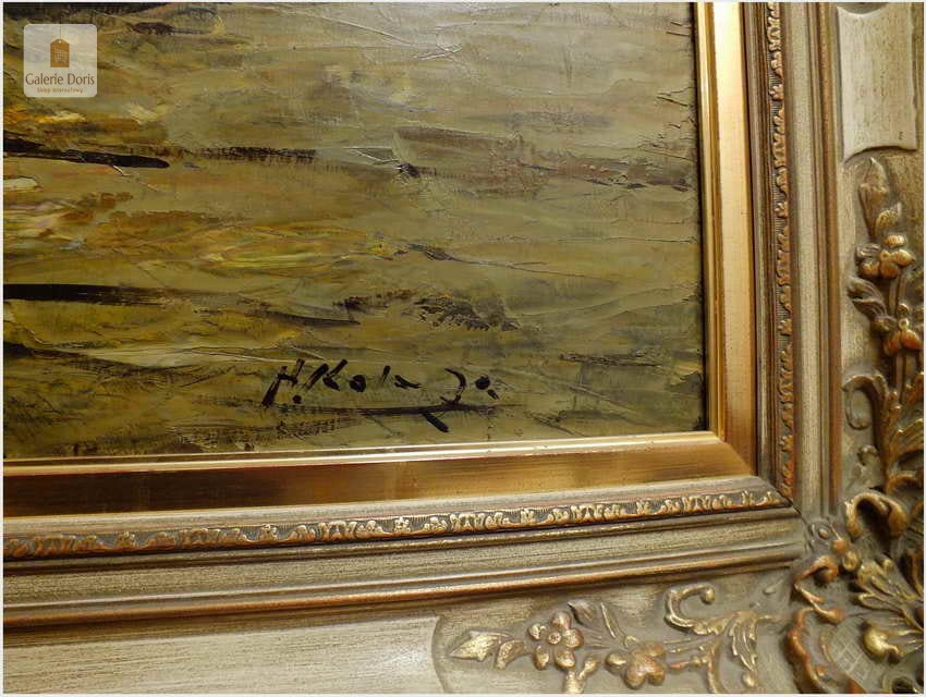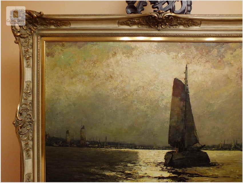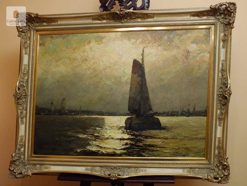 Duży obraz o tematyce marynistycznej znanego i cenionego malarza niemieckiego Helmut Kaluza, notowany na Artprice. Widoczny obraz to olej na płótnie o imponujących wymiarach, malarstwo fakturalne. Stan dobry, płótno bez uszkodzeń, Obraz sygnowany w rogu nazwiskiem malarza: H.Kaluza - Polecamy, świetna inwestycja, cudowna ozdoba! Całość prezentuje się wspaniale. Mistrzowskie posunięcia pędzla oraz doborowa kolorystyka odbicia na wodzie blasku księżyca, czyni obraz wielce dekoracyjnym. Należy tu wspomnieć, że obrazy z rodzaju nokturnu - Nokturn (z łac. nocturnus – nocny, od nox, noctis – noc) – obraz przedstawiający scenę nocną (...), zazwyczaj malowane są w ubogiej tonacji kolorystycznej, dlatego po tę tematykę sięgają tylko bardziej utalentowani malarze. Oferowany obraz będzie z pewnością pięknym eksponatem w Państwa kolekcji, domu.
