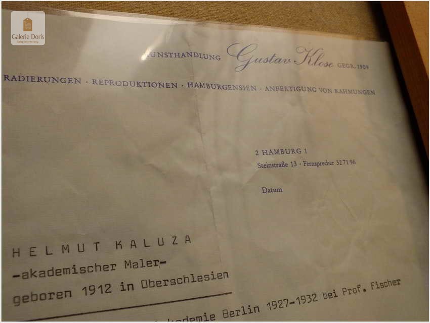 Helmuth Kaluza urodzony 5 stycznia 1912 w Rotensol (Baden-Württemberg). W latach 1927-1932 studia w Preußischen Akademie der Künste w Berlinie. Uczeń profesorów Fischera i Reimanna. Główne tematy to widoki portów rybackich z połowy XX w. i pejzaże z okolic Bremerhafen i Hamburga. Miał wiele indywidualnych wystaw w Berlinie ,Dreźnie ,Lipsku ,Dusseldorfie, Frankfurcie i Hanowerze. Wystawiał również w USA. Stosował malarstwo fakturalne (spachteltechnik).