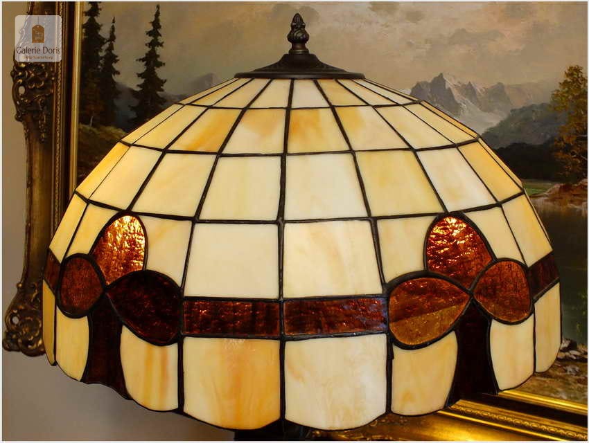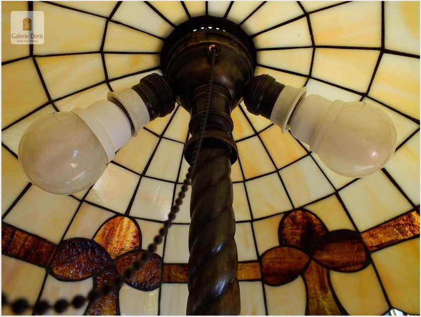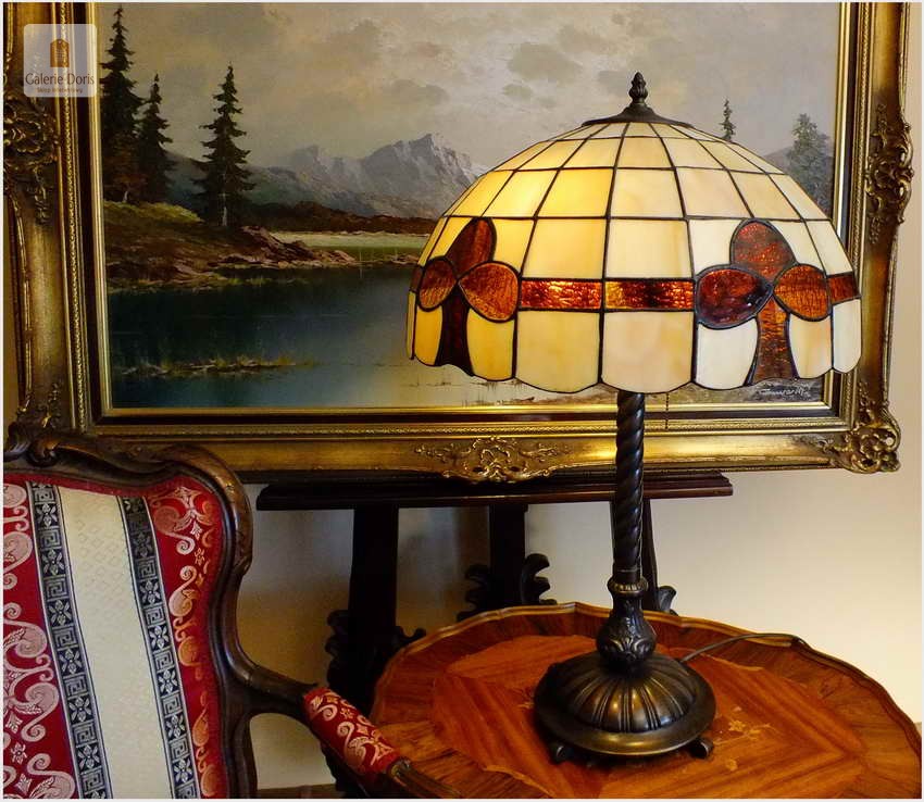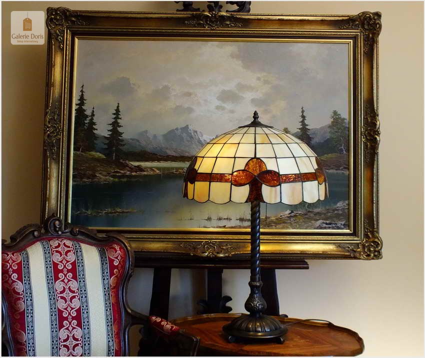 Typ Lampy przeznaczony jest do oświetlenia miejscowego dużego salonu, gabinetu, biura i powinno się ja wyeksponować na meblu średniej wielkości. Lampa sprawna z wygodnym włącznikiem oświetlenia w oprawie żarówek. Poniżej zamieszczamy fotki tej uroczej lampy. W komplecie duży witrażowy szklany klosz Tiffany. Wysyłka lampy w dwóch paczkach (osobno podstawa i klosz Tiffany) - Polecamy.