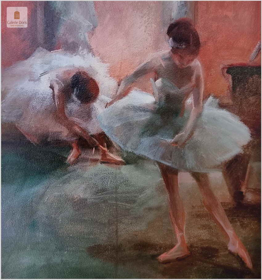 Obraz olejny malowany na płycie pilśniowej, przedstawiający balet z młodymi dziewczętami. Obok ulubionych tancerek, scen baletowych i portretów malowała także pejzaże i miejskie motywy z Pragi, sceny religijne, martwe natury i kwiaty. W jej obrazach dostrzega się fascynację sztuką E. Degasa i inspiracje czerpane z malarstwa francuskich postimpresjonistów. Obraz bez uszkodzeń!