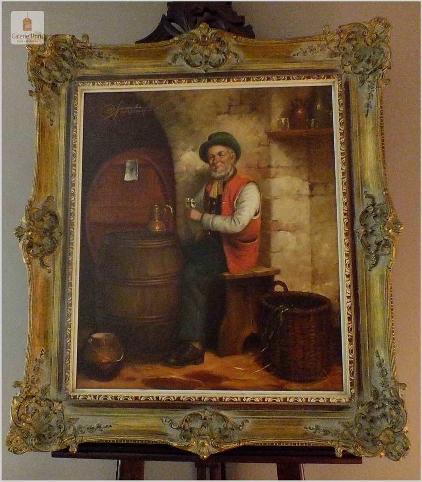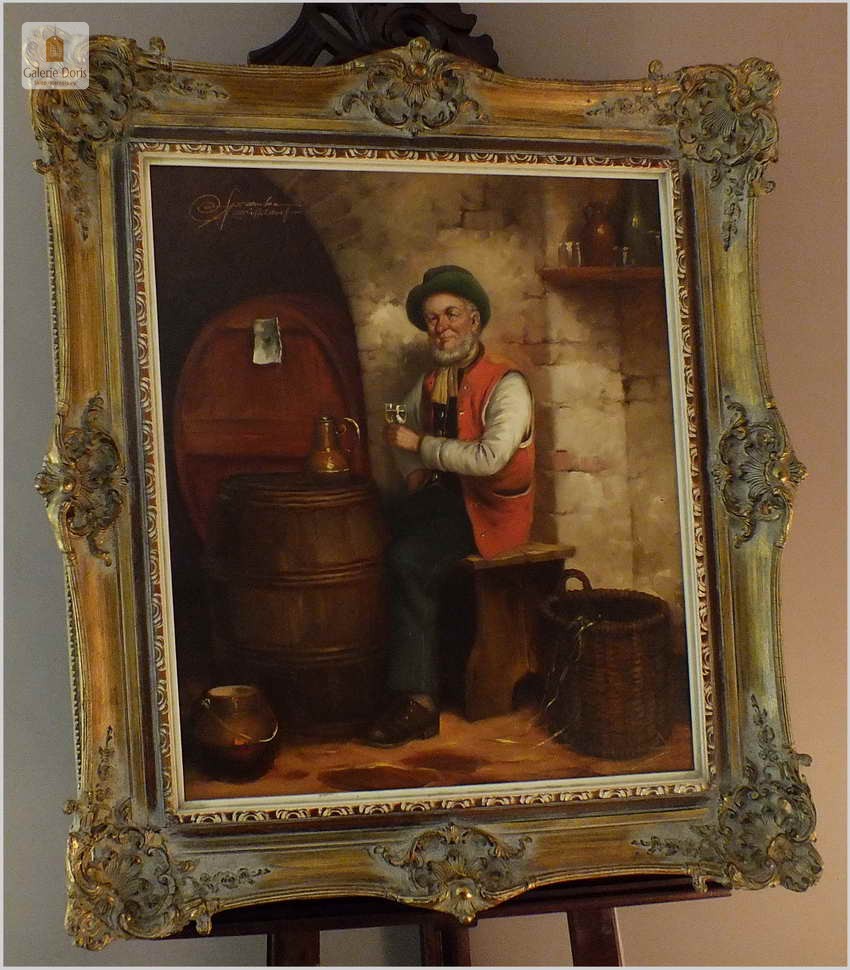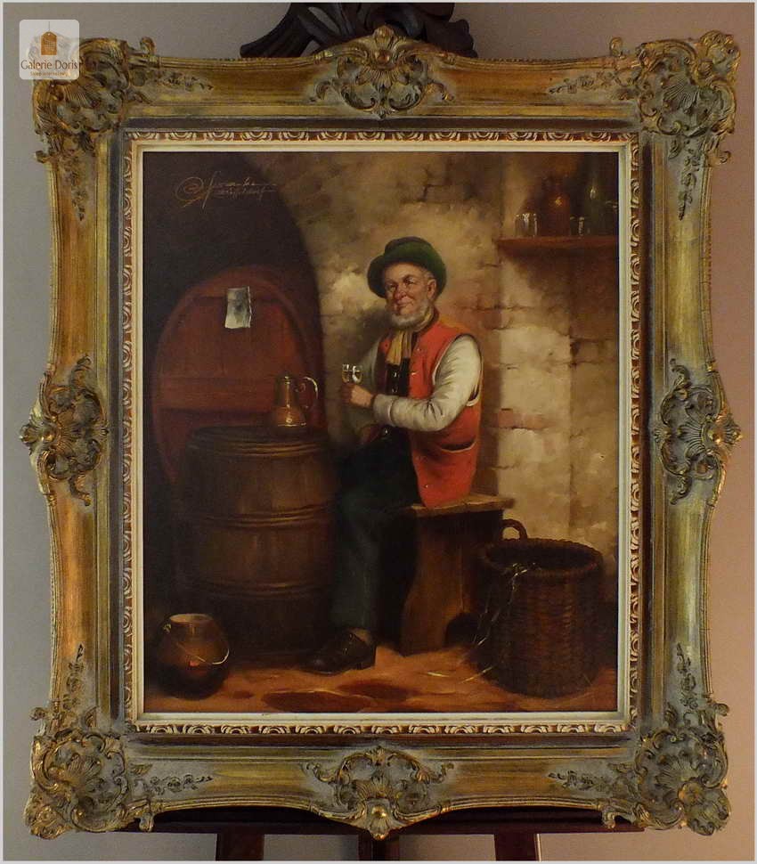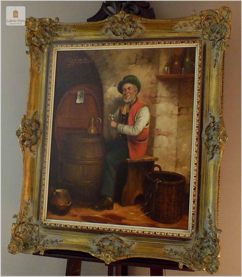 Niezwykle dekoracyjny, oryginalny, namalowany na płótnie obraz. Przedstawiający próbę wina, Autorem tej pracy jest Rudolf Otto Franke. Obraz malowany w technice pędzla. Nałożona farba jest wyczuwalna pod palcami. Sygnowany lewa góra Franke Dusseldorf. Całość oprawiona w oryginalną przestrzenną ramę. Obrazy artysty cieszą się dużym powodzeniem i są pożądane na aukcjach sztuki. Obraz do powieszenia na ścianie.