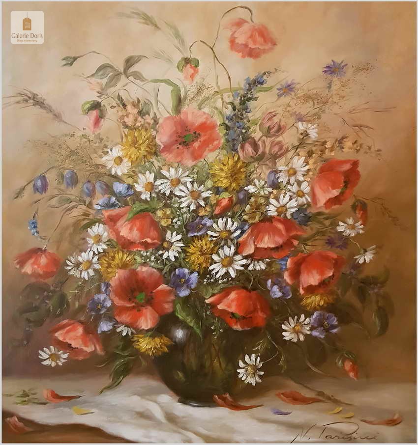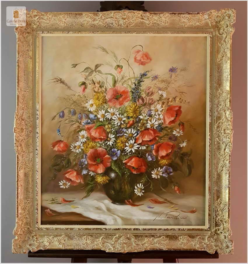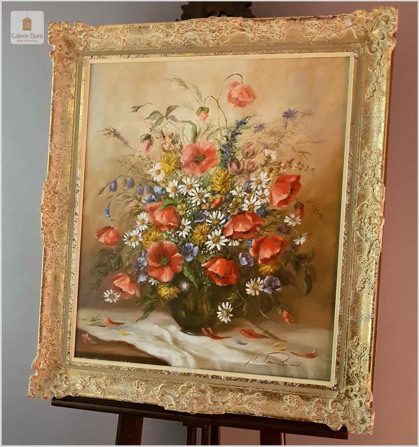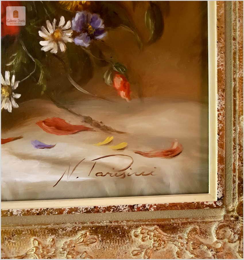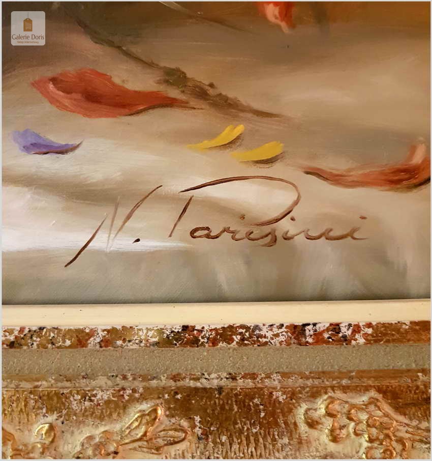 Polecamy niezwykle piękny obraz olejny przedstawiający bukiet kwiatów w szklanym wazonie, namalowany olejem na płótnie. Struktura farby wyraźnie wyczuwalna pod palcami. Obraz oprawiony jest w przestrzenną, grubą ramę wykonaną z drewna. Całość jest sygnowana w prawym dolnym rogu ramy. Malarstwo Parisini było zawsze ozdobą i wzbudzało ogromne zainteresowanie szerokiej publiczności.