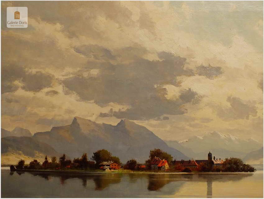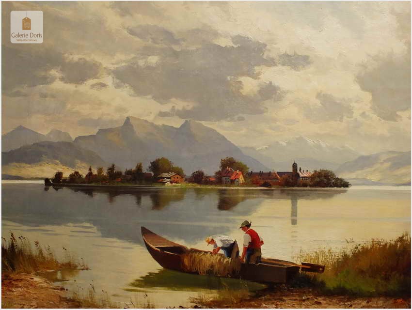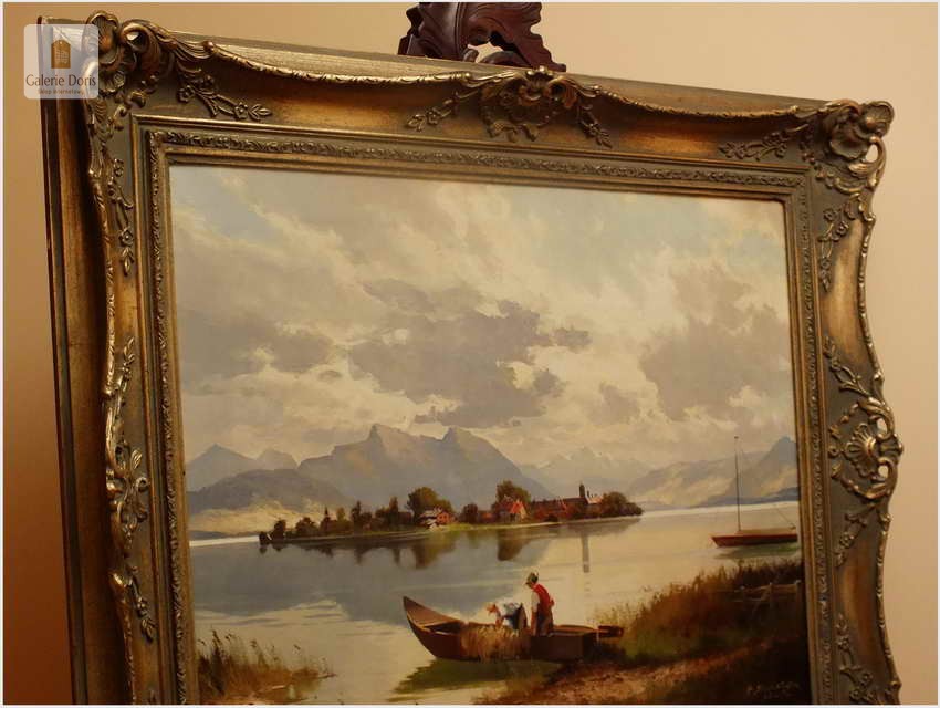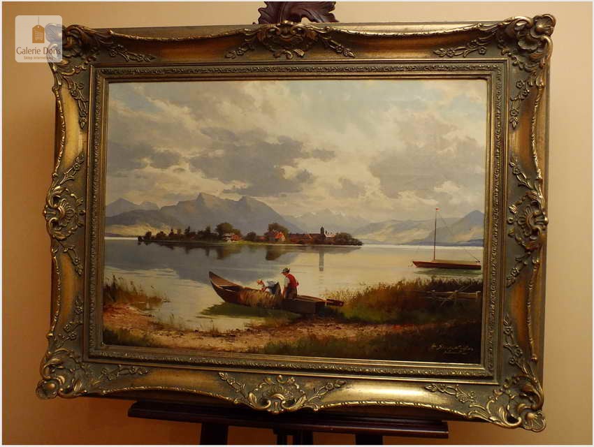 Polecamy niezwykle piękny stary obraz olejny przedstawiający rybaka w łodzi przycumowanej nad brzegiem jeziora Chiemsee,  z wyspą  Fraueninsel w tle. Jest to jedna z późniejszych prac, typowa dla malarza. Struktura farby wyraźnie wyczuwalna pod palcami. Obraz oprawiony jest w przestrzenną, grubą ramę wykonaną z drewna. Całość jest sygnowana u dołu obrazu. Obraz malowany na grubym płótnie malarskim. Malarstwo wysoko notowane w Artprice, Artnet, . Do obrazu dołączamy zaświadczenie Galerii z zawartym opisem z aukcji - Gwarantujemy profesjonalnie zabezpieczoną przesyłkę kurierem. Pragniemy zaznaczyć, że prace Helmuta Stadelhofera z rybakiem na tle jeziora Chiemsee są pracami najbardziej poszukiwanymi. Polecamy!