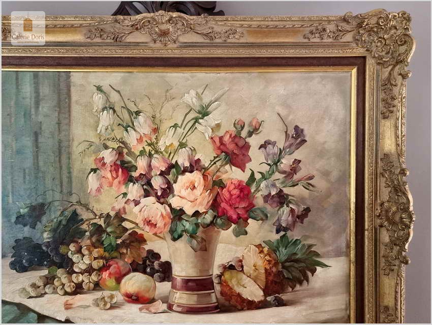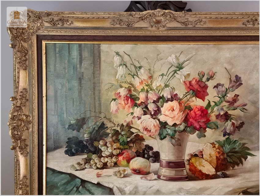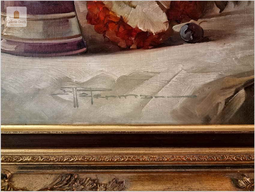 Proponujemy Państwu dobrą pracę olejną, niemieckiej malarki martwych natur. Hedwig Petermann to malarka, która głównym tematem malarskim jaki uprawiała były subtelne a zarazem piękne kompozycje kwiatowe. Uczennica Wilhelma Ecksteina w Düsseldorfie. Malowała martwe natury z owocami i kwiatami, które wyróżniają się dobrą kompozycją, szlachetnym kolorytem, miękkością modelunku i łagodnym nastrojem.