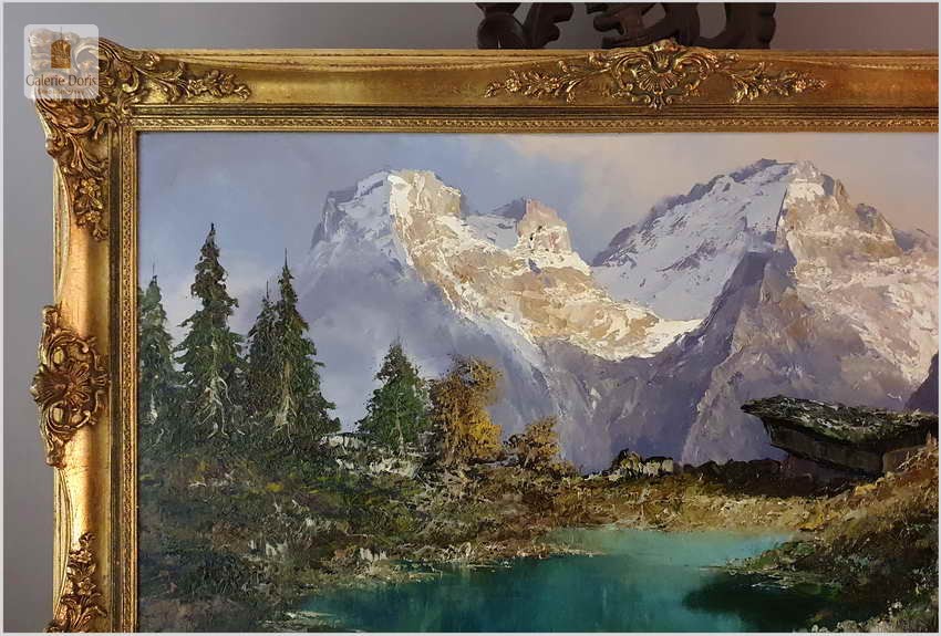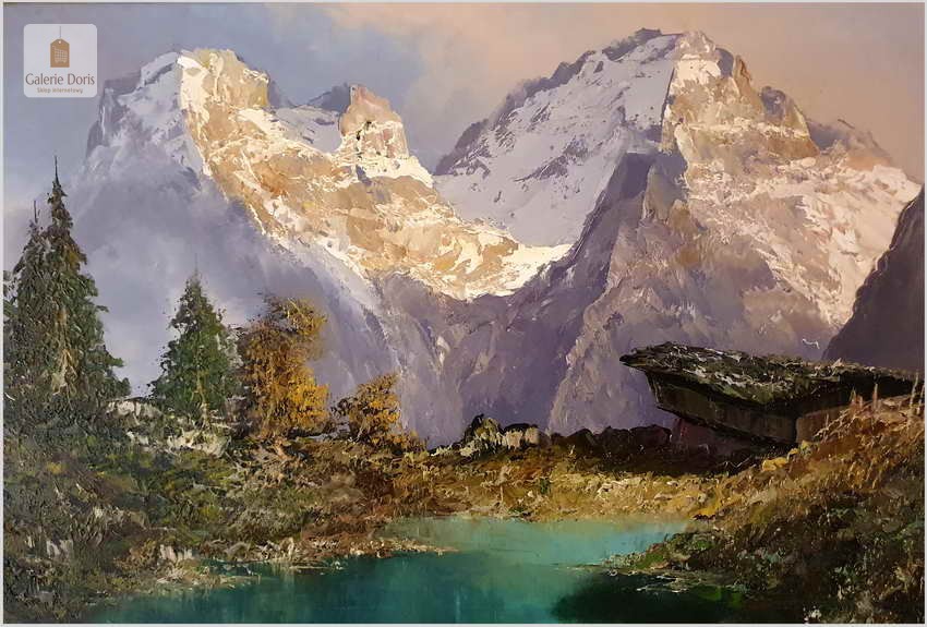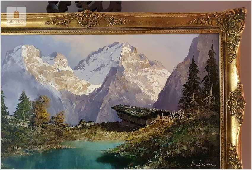 Polecamy obraz malowany techniką szpachlową olejem na płótnie znanego malarza niemieckiego Uerpmanna, obraz sygnowany w dolnym rogu. Po jakości i ruchach pędzla widać kunszt i profesjonalizm dzieła. Urodził się w Wuppertal-Bremen studiował w szkole artystycznej Barmen Wiethüchter u profesorów: Gustav i Ludwig Fahrenkrog, wiele wyjazdów studyjnych w całej Europie, Wielokrotnie katalogowany i wymieniony w odpowiednich prestiżowych katalogach o malarstwie. Malarz na obrazie ukazuje swoją fascynację do krajobrazów alpejskich. Wyraża to naturalnym kolorem, światłem oraz wirtuozerią szpachli i pędzla. Polecamy!