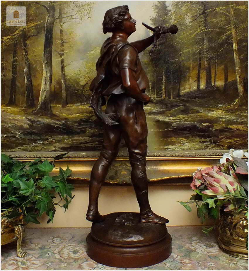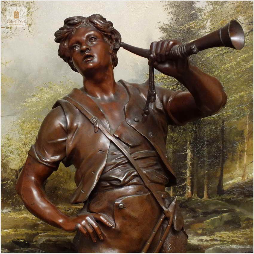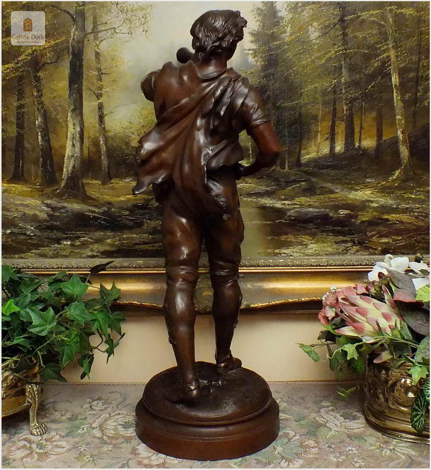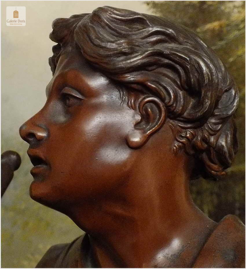 W ciągu całego XIX wieku tylko nieliczni, samotni artyści próbowali przeciwstawić się klasycyzującej, eklektycznej sztuce i starali się szukać nowych dróg. Niewątpliwie w pewnej mierze na taki stan rzeczy wpłynął Émile Louis Picault. Mitologia ze swoimi bogami i herosami była głównym źródłem tematów pozwalających rzeźbiarzowi ukazywać piękno cielesne oraz sceny miłosne i sentymentalne. Figura odlana ze stopów cynkalu brązowiona. Wykonana w XIXw. Polecamy