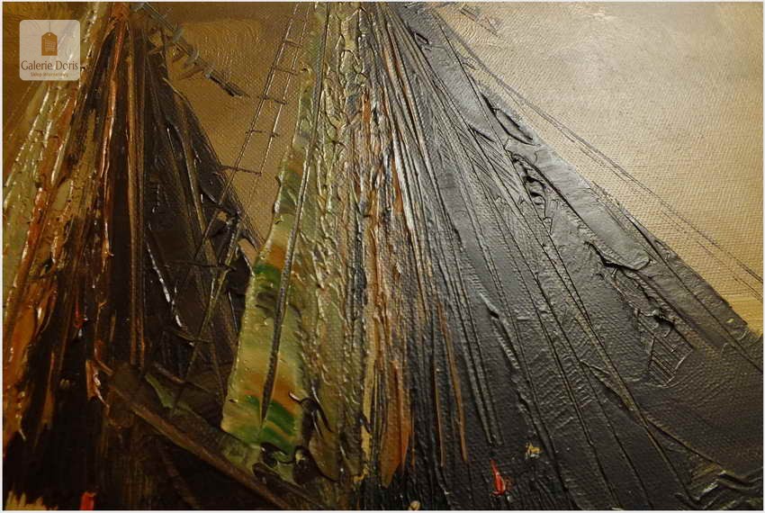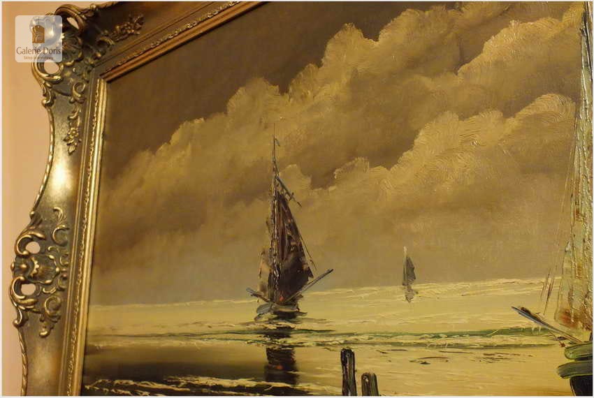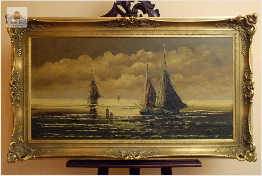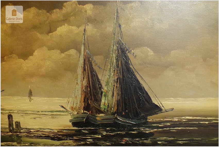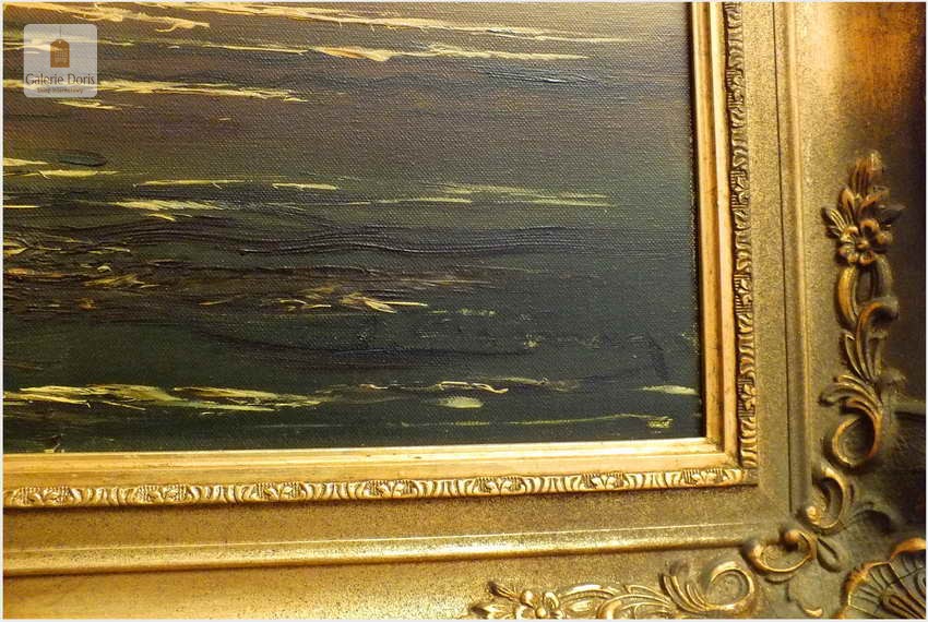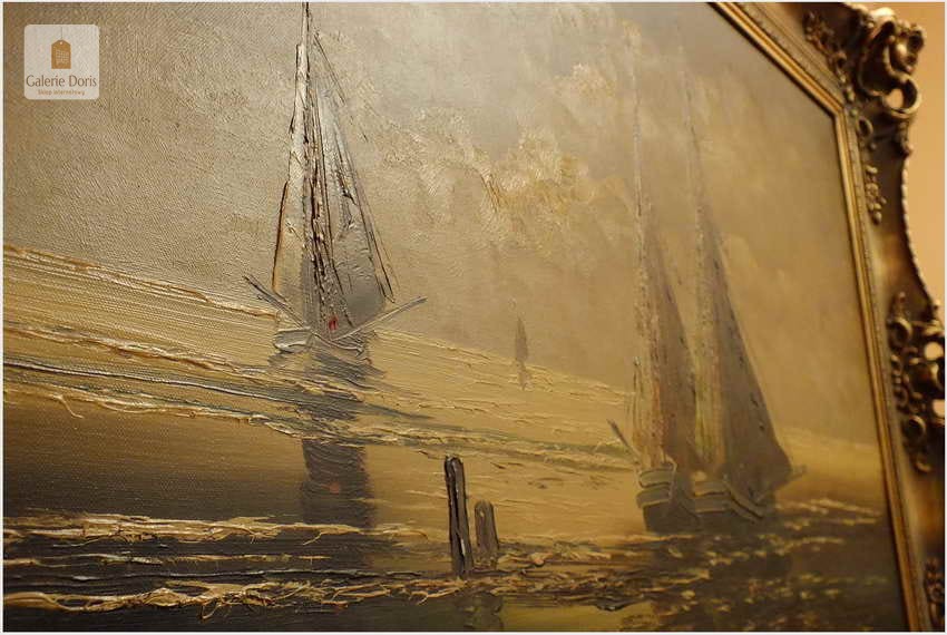 Jean Coune malował różnego rodzaju motywy. W jego twórczości przeważają jednak motywy marynistyczne. Jean Coune, uczeń prof. Helmuta Lieseganga, technika malarska pędzel, szpachla. Jego styl malarski wyróżnia się przede wszystkim zastosowaniem techniki szpachlowej, którą uwypukla bardzo grubo kładzioną fakturę płótna. Jego prace często są spotykane na europejskich aukcjach. Ten obraz jest jego bardzo dobrą pracą z późniejszych lat jego twórczości. Piękną dodatkową ozdobą jest bardzo bogata rama o konstrukcji drewnianej zdobiona sztukaterią w stanie perfekcyjnym. Całość prezentuje się wspaniale. Będzie z pewnością pięknym eksponatem w Państwa kolekcji, domu. Wraz z obrazem idzie gratis ta piękna rama i świadectwo naszej Galerii. Obraz z ramą w stanie bardzo dobrym, bez uszkodzeń!