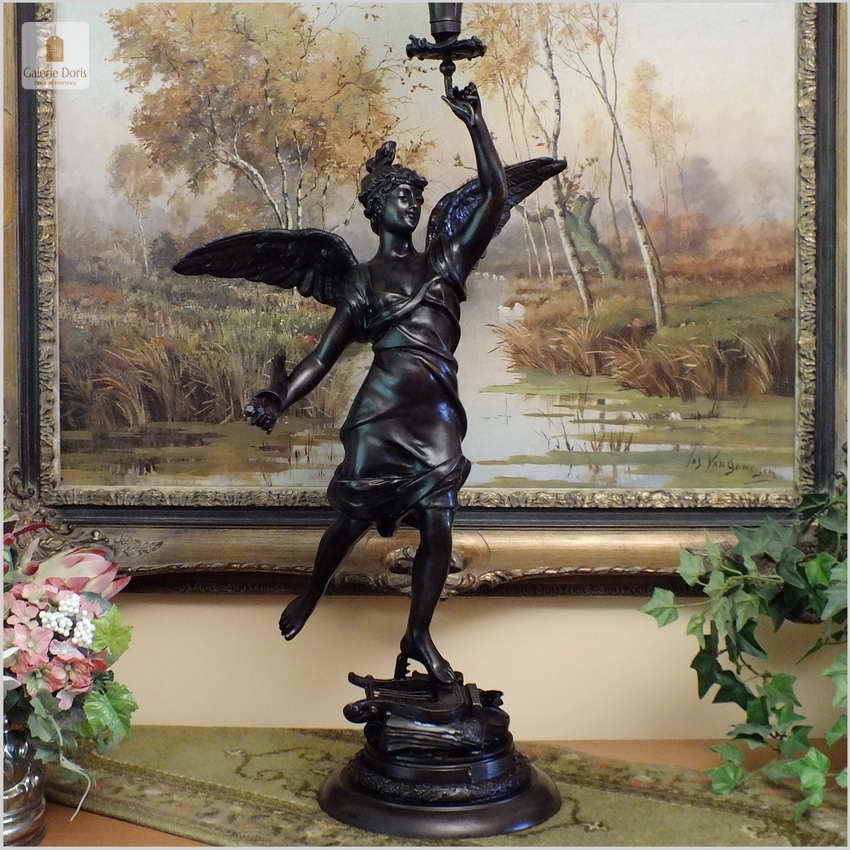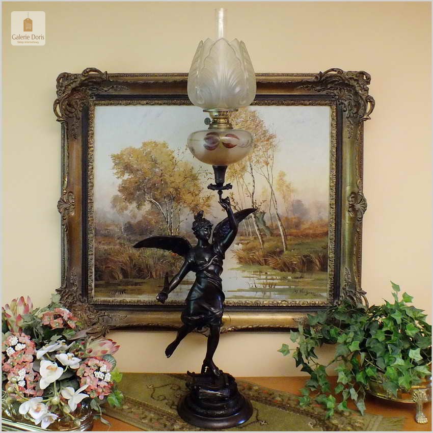 Polecamy bogato zdobione lampy naftowe, które były wówczas obowiązkowym wyposażeniem domów mieszczańskich, pałaców i dworów. W tle obraz o wymiarach około 100cm x 80 cm, który powinien obrazować skalę wielkości lampy! Lampa sprawna technicznie gotowa do natychmiastowego użytkowania po zalaniu nafty. Polecamy zjawiskową boginię bogactwa z rogiem obfitości!