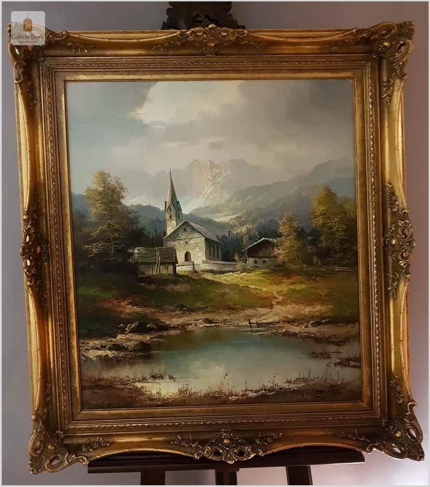 Duże malarstwo górskie z kościołem przed masywem. Podpis po lewej dolnej stronie: H. Wagner (patrz zdjęcie szczegółowe). Prawdopodobnie Hans Wagner *1924. Olej na płycie, w przybliżeniu 80cm x 70cm szczegóły obrazu i około 102cm x 92cm szerokość ramy. Oczyściliśmy profesjonalnie obraz w galerii i zawerniksowaliśmy utrwalając kolory. Obraz gotowy do zawieszenia, stan wręcz idealny. Dobrze zachowana i bogato zdobiona stiukowa rama dopełnia całości. Proszę zobaczyć jakie bije z obrazu pozytywne światło, mistrz pędzla. Polecamy!