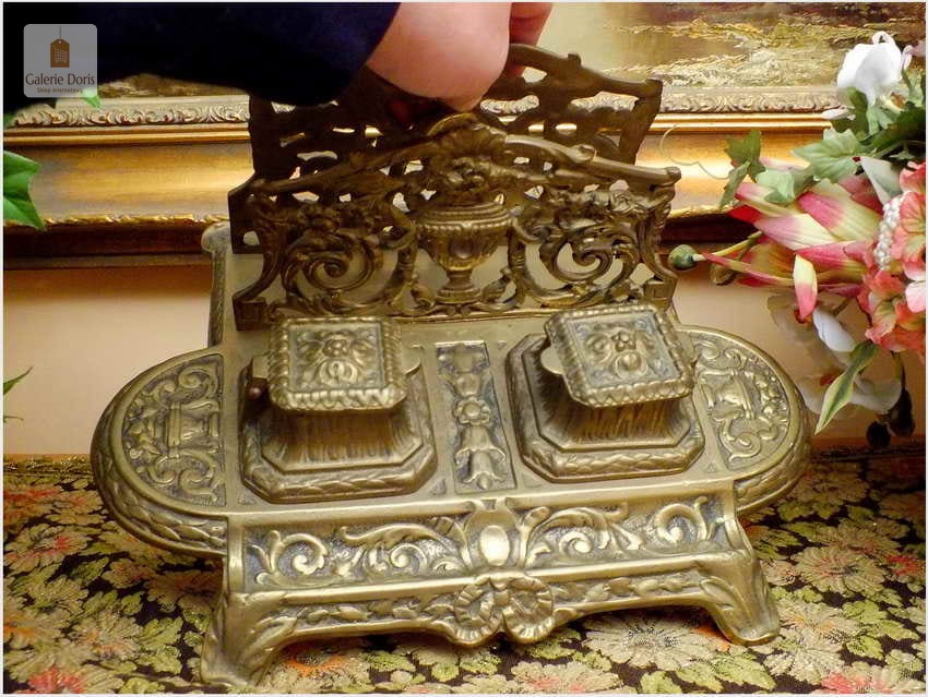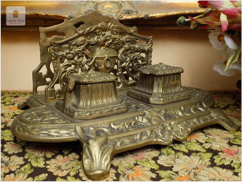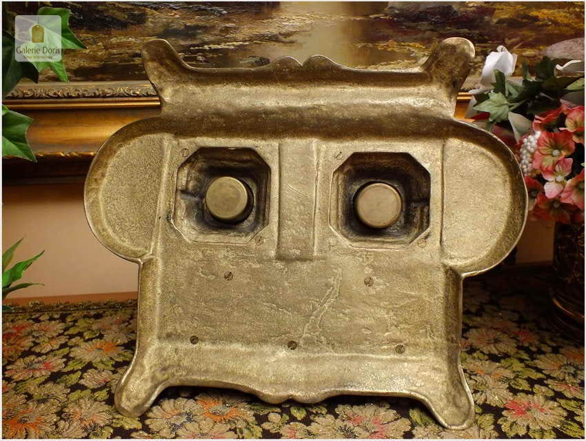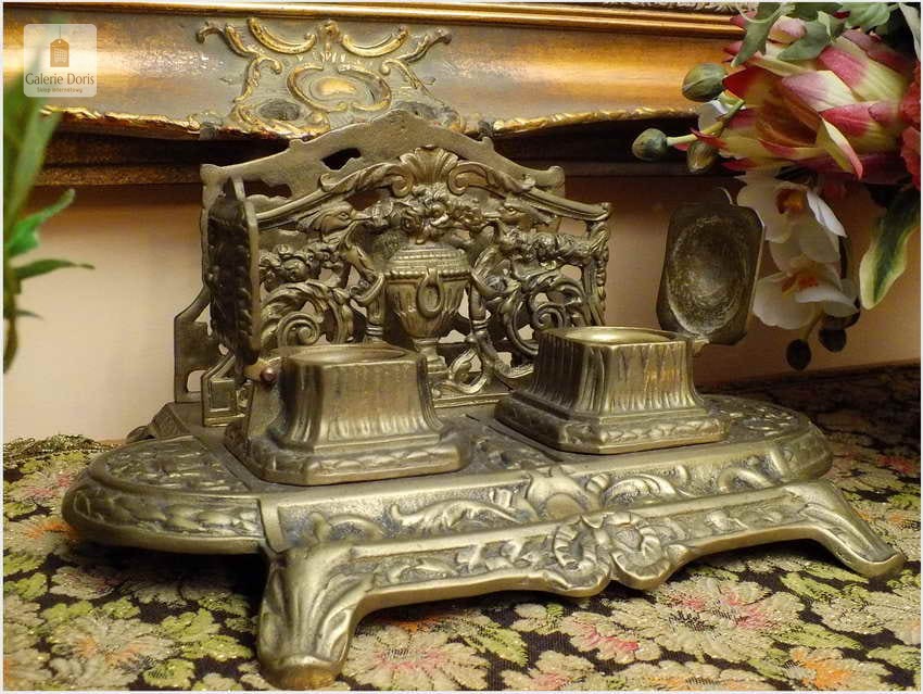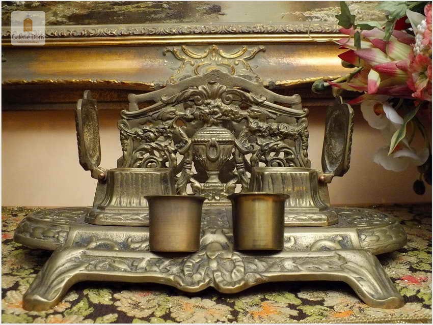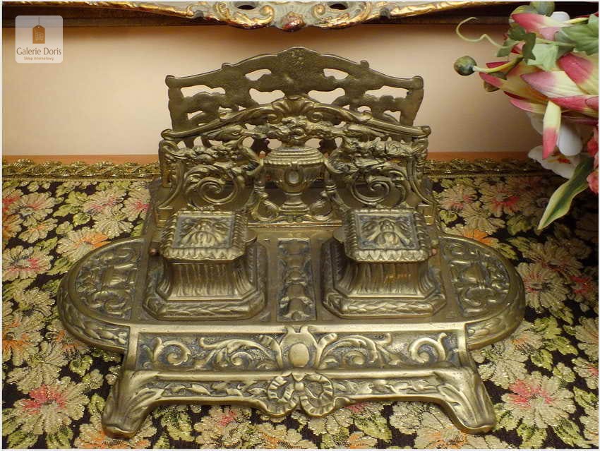 Ten niezwykle efektowny przedmiot na biurko polecam wszystkim Państwu, którzy lubią otaczać się pięknymi przedmiotami. Kałamarz świetnie się prezentuje, będzie cudowną ozdobą każdego biurka i z pewnością podkreśli prestiż właściciela. Wyjątkowy mosiężny egzemplarz. Stan przedmiotu dobry, bez uszkodzeń. Ten znakomity przedmiot posiada wkłady na atrament, będzie wysmakowanym akcentem wystroju gabinetu, biura lub biblioteki. Polecam jako wykwintną, stylową i elegancką, a przy tym funkcjonalną ozdobę, doskonale nadającą się na ekskluzywny, niebanalny prezent.