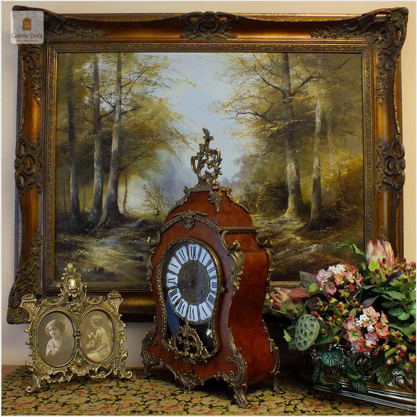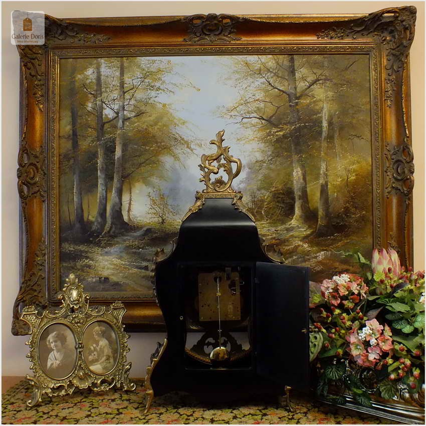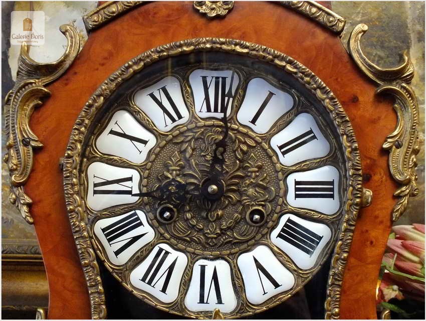 Przedmiotem sprzedaży jest zegar w stylu Charles André Boulle. Drewniana obudowa zegara wsparta na czterech wygiętych nóżkach z brązu, zwieńczona floralną aplikacją - brąz. Tarcza zegarowa okrągła, dekorowana reliefowym ornamentem, z emaliowanymi płytkami z rzymskim oznaczeniem godzin. Boczne ornamenty wtapiane z płytek mosiężnych. Wahadło w kształcie koła - mosiężne. Mechanizm z systemem bicia godzin i półgodzin (dwa młoteczki uderzają w dwa dzwonki dwu tonowo), regulator wahadłowy, Mechanizm zegara FHS Hermle- w pełni sprawny, system bicia godzin i półgodzin, chodzi 6-8 dni. Polecamy ten zegar jak z bajki. Zegar w stylu Charlesa Boulle wykonany w II połowie ubiegłego wieku - Bez zbędnych dodatkowych kosztów - rozpakowujesz i używasz ciesząc oko z dobrego wyboru. Mechanizm sprawny po przeglądzie u naszego zegarmistrza. Wszystkie elementy dekoracyjne z brązu.