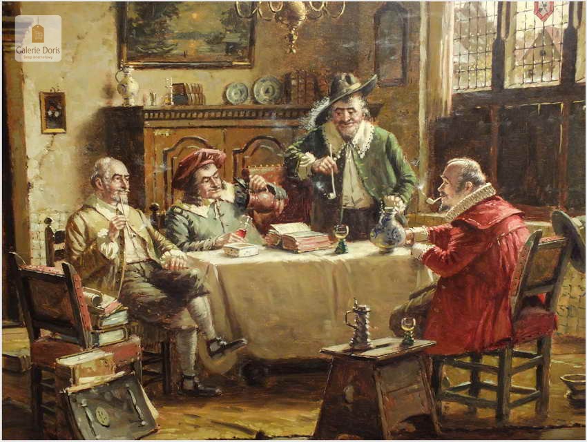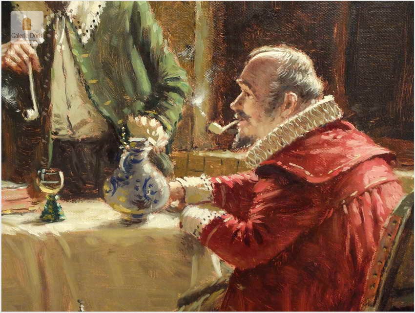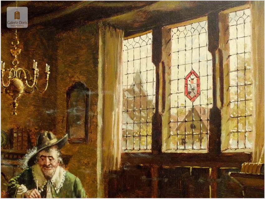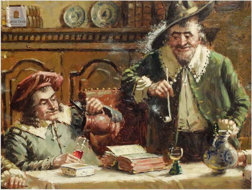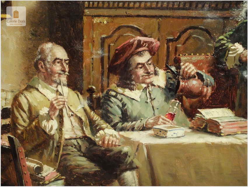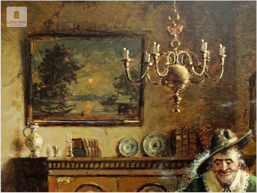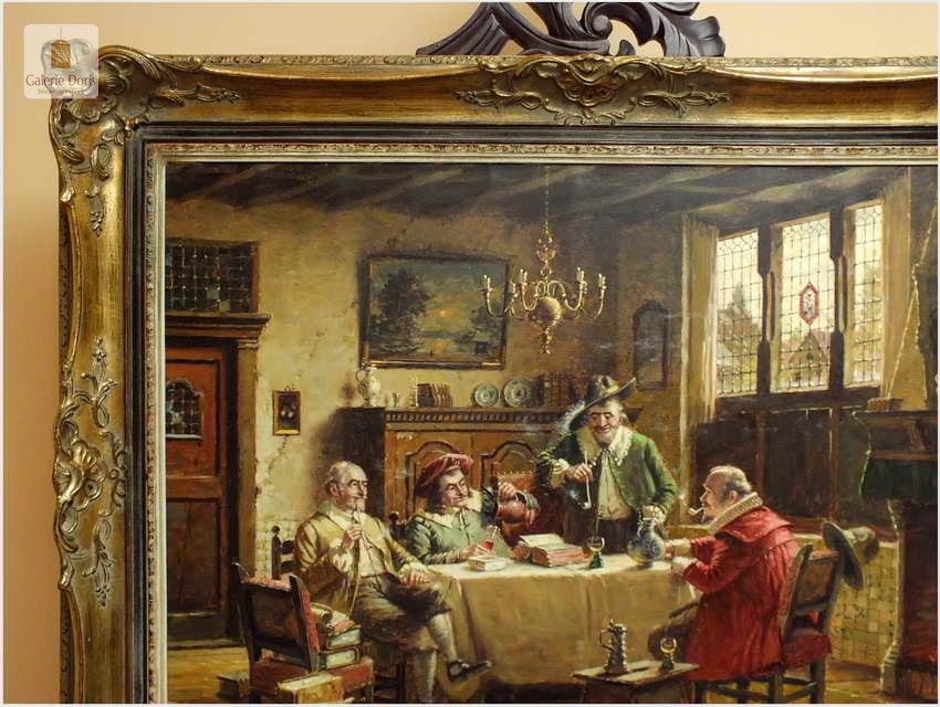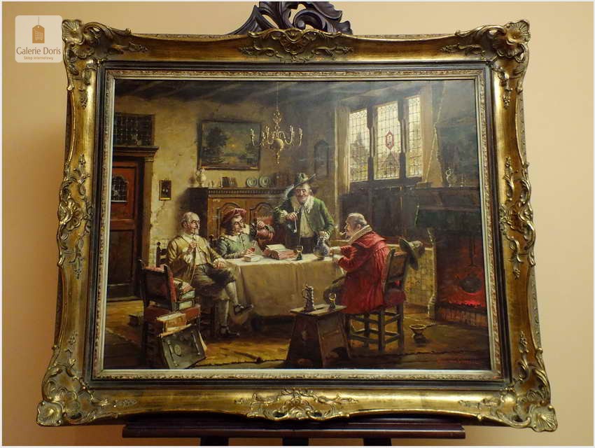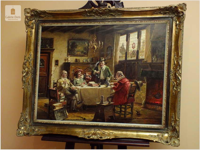 Polecam stary obraz olejny pędzla znanego malarza niemieckiego Hein Van Dorena. Zachwycająco oddał niesamowicie plastyczność malowanych postaci oraz ich otoczenia, podkreślona została finezyjnymi efektami światłocieniowymi a także wyśmienitą grą niuansów barwnych. Ten subtelnie malowany obraz cechuje znakomita technika malarska. Obraz bezpośrednio nawiązuje do dzieła XVII-wiecznego malarstwa. Oprawę malowidła stanowi przestrzenna, gruba rama wykonana z drewna. Złoconą ramę bogato dekorują kunsztowne sztukaterie. W rzeczywistości obraz jest jeszcze bardziej urzekający niż na załączonych poniżej zdjęciach. Stan płótna dobry, bez uszkodzeń - Obraz sygnowany jest w dolnym rogu. Do obrazu dołączamy numerowane hologramem zaświadczenie z Galerii.