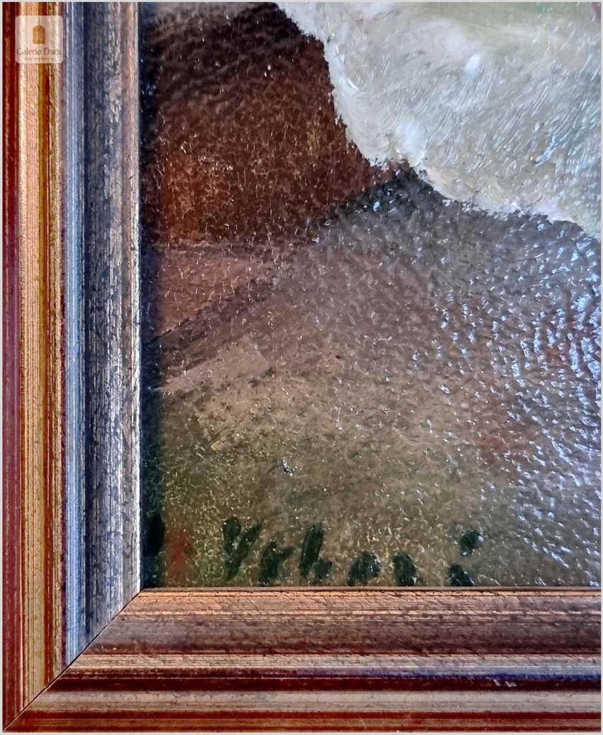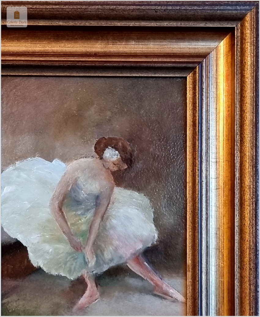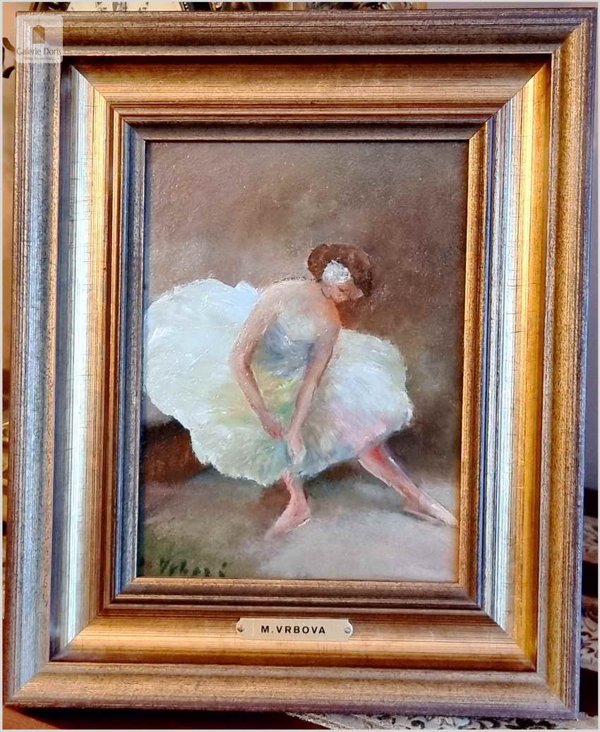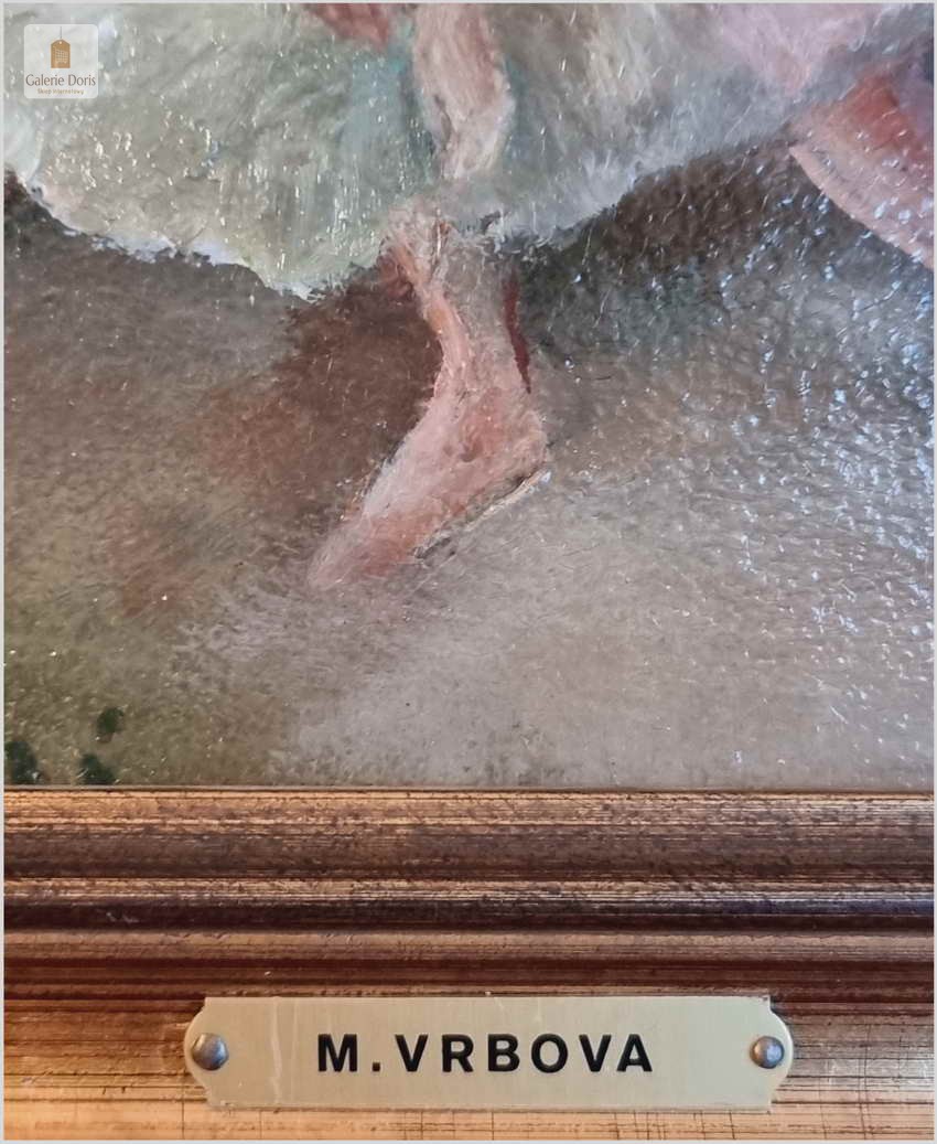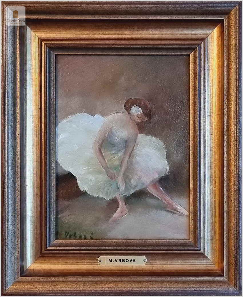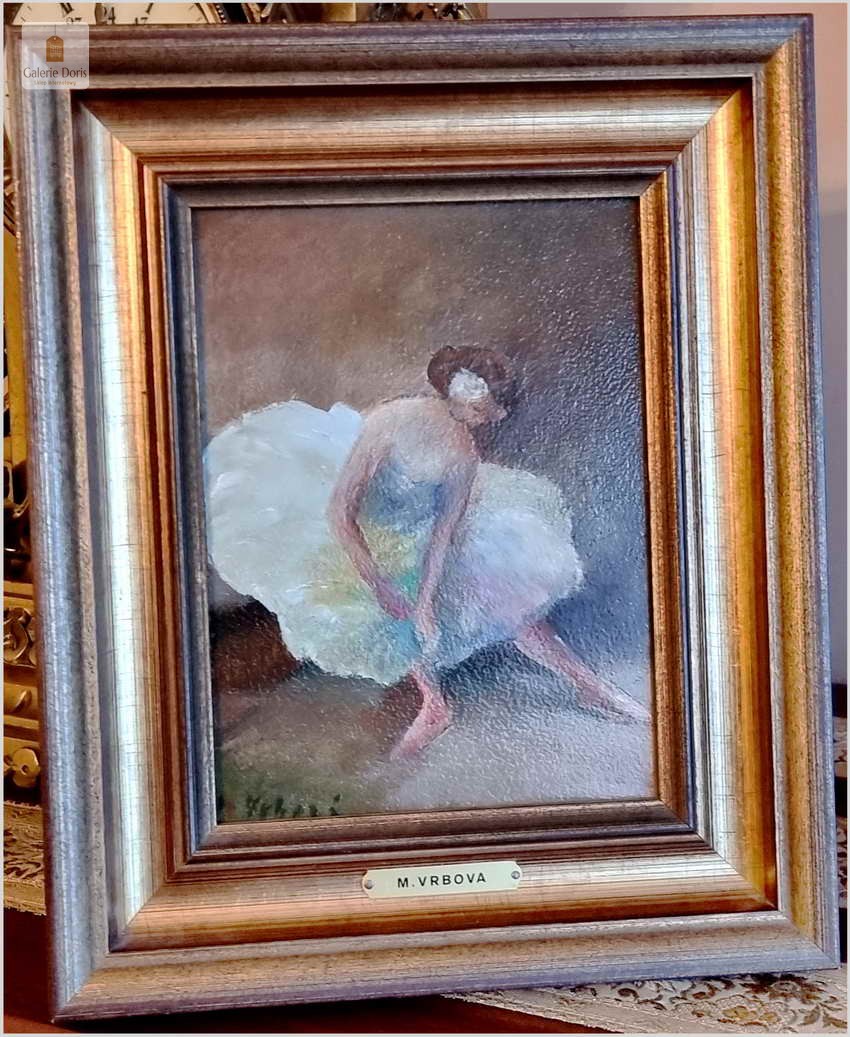 Obraz olejny malowany na płycie malarskiej, przedstawiający baletnicę. Obok ulubionych tancerek, scen baletowych i portretów malowała także pejzaże i miejskie motywy z Pragi, sceny religijne, martwe natury i kwiaty. W jej obrazach dostrzega się fascynację sztuką E. Degasa i inspiracje czerpane z malarstwa francuskich postimpresjonistów. Obraz bez uszkodzeń!