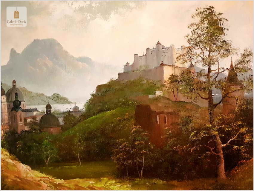 Polecamy bardzo duży wyjątkowo dekoracyjny obraz olejny na płótnie. Niezwykle piękny, romantyczny krajobraz, przedstawiający malowniczą dolinę zamków w Szwajcarii. Subtelnie malowany duży obraz olejny na płótnie. Wspaniale oddano partię nieba oraz rozległy widok na otaczające go góry. Bardzo ciekawa i nastrojowa kompozycja.