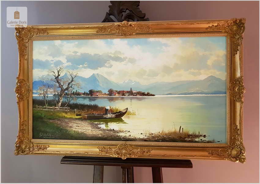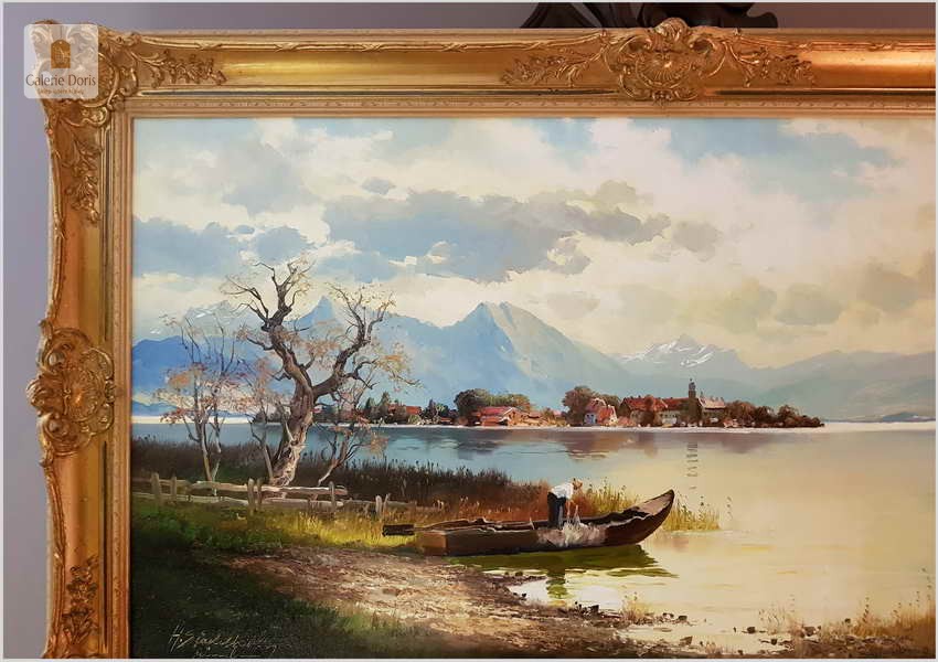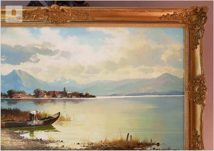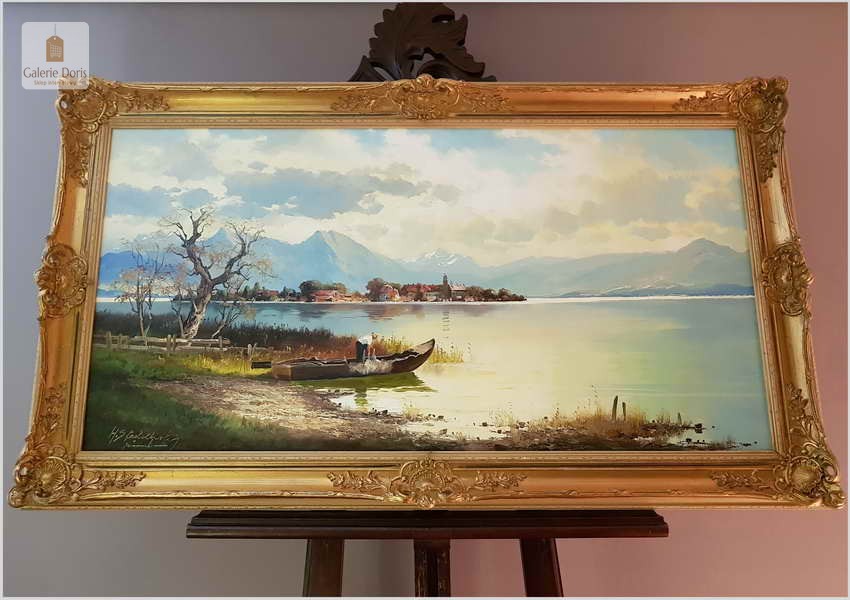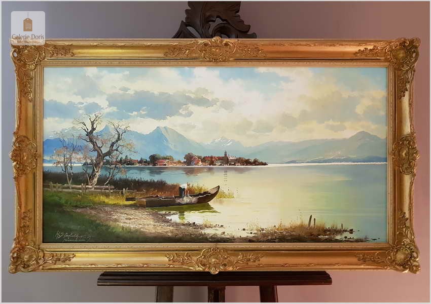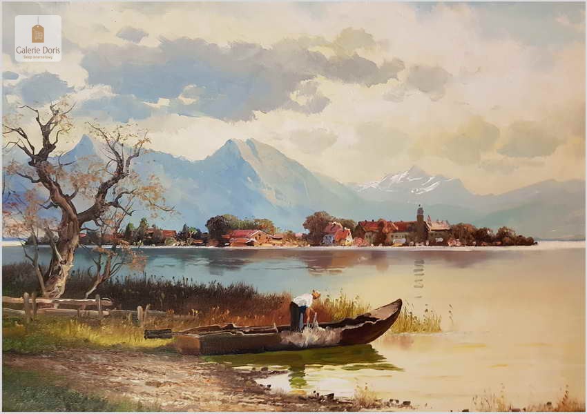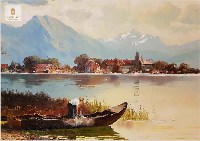 Polecamy niezwykle piękny stary obraz olejny przedstawiający rybaka w łodzi przycumowanej nad brzegiem jeziora Chiemsee,  z wyspą  Fraueninsel w tle. Jest to jedna z późniejszych prac, typowa dla malarza. Struktura farby wyraźnie wyczuwalna pod palcami. Obraz oprawiony jest w przestrzenną, grubą ramę wykonaną z drewna. Całość jest sygnowana u dołu obrazu. Obraz malowany na grubym płótnie malarskim. Malarstwo wysoko notowane w Artprice, Artnet, . Do obrazu dołączamy zaświadczenie Galerii z zawartym opisem z aukcji - Gwarantujemy profesjonalnie zabezpieczoną przesyłkę kurierem. Pragniemy zaznaczyć, że prace Helmuta Stadelhofera z rybakiem na tle jeziora Chiemsee są pracami najbardziej poszukiwanymi. Polecamy!