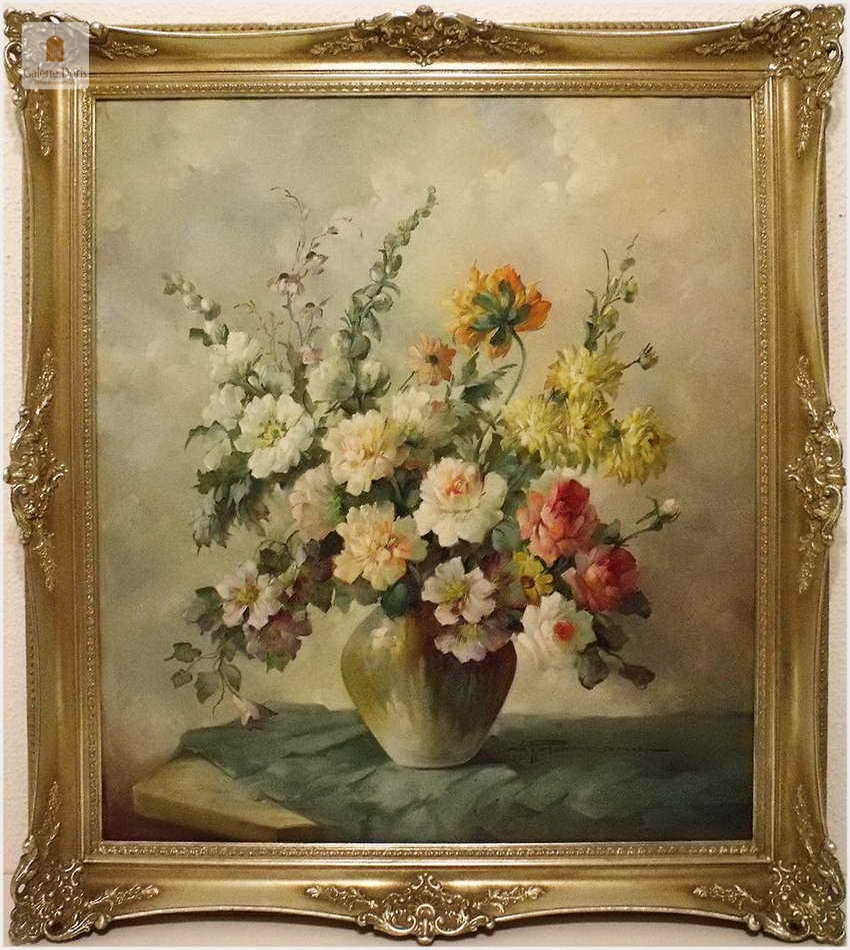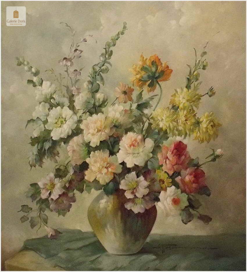Proponujemy Państwu dobrą pracę olejną, niemieckiej malarki martwych natur. Hedwig Petermann to malarka, która głównym tematem malarskim jaki uprawiała były subtelne a zarazem piękne kompozycje kwiatowe. Uczennica Wilhelma Ecksteina w Düsseldorfie. Malowała martwe natury z owocami i kwiatami, które wyróżniają się dobrą kompozycją, szlachetnym kolorytem, miękkością modelunku i łagodnym nastrojem.