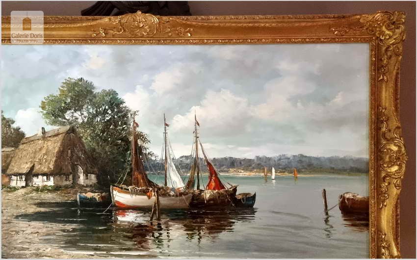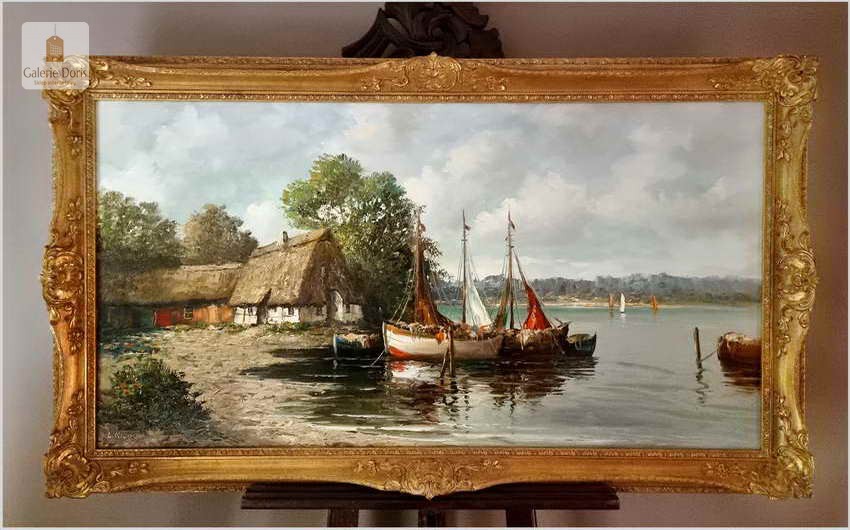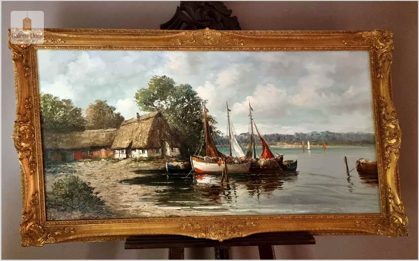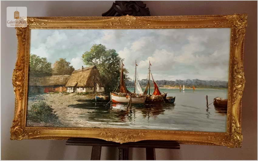 Duża panorama! Łodzie przy brzegu - Lothar Klein (*1911 Düsseldorf)