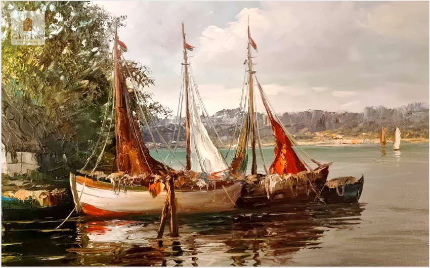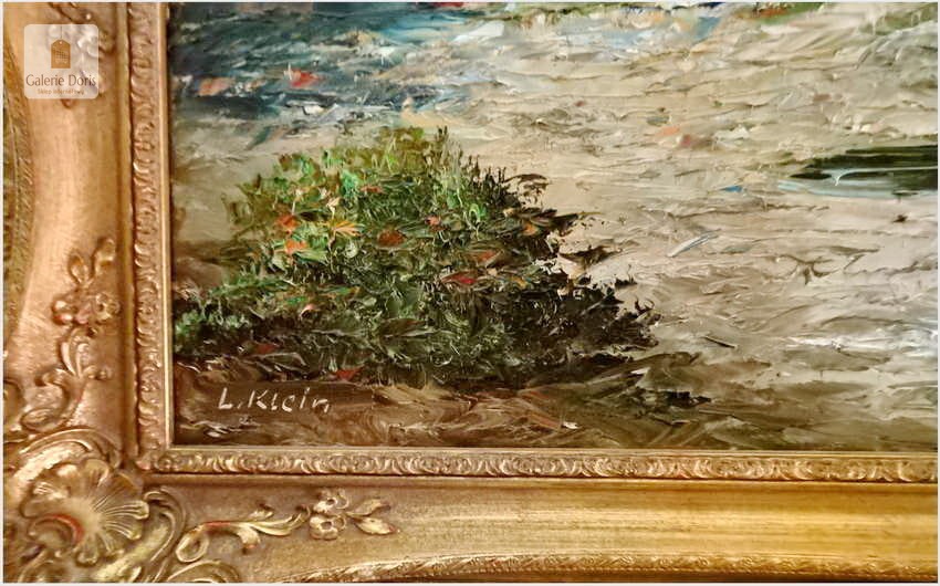 Przedstawiamy Państwu duży pejzaż z łodziami jako temat przewodni obrazu. Klein postrzegał krajobraz i malował z dużą wrażliwością i upodobaniem jak nikt inny. Jego niezwykle subtelne, nastrojowe, wyróżniające się mistrzowską grą świateł i cieni pejzaże jesienne i zimowe to prawdziwe dzieła sztuki. W niektórych kompozycjach Kleina przewagę zyskuje walor dekoracyjności. Przykładem może być obraz „Przejażdżka zimowa”, gdzie koronki ośnieżonych gałęzi tworzą skomplikowany ornament. Obraz jest w bardzo dobrej tonacji oraz w dobrym stanie. Polecamy!