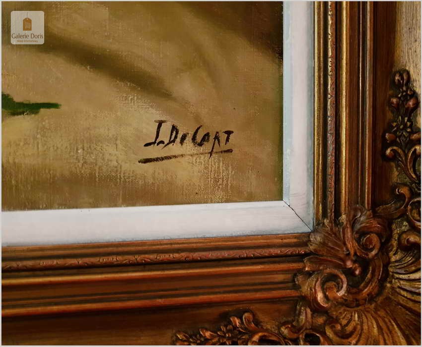 Oryginalny obraz olejny na płótnie wspaniałego postimpresjonisty Jules De Corte (1918-1999), przetrwał w swojej oryginalnej misternie szczegółowej i złoconej oprawie. Jules De Corte urodził się w Lamorbey w Wielkiej Brytanii. Studiował sztukę w Antwerpii, gdzie mieszkali jedni z największych flamandzkich mistrzów. Pamiętamy go szczególnie za jego bujne malarstwo pejzażowe i ciekawy punkt widzenia na dzieła ludzi. Obraz namalowany około połowy XXw.