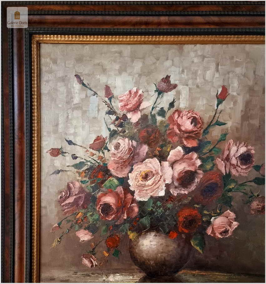 Jeśli chcą Państwo nadać swojemu mieszkaniu wyjątkowy charakter, stworzyć w nim klimat, który zainspiruje domowników i oczaruje gości, pierwszym krokiem w tym kierunku powinno być "ubranie" pustych ścian w obrazy olejne. Kwiaty będą tu najbardziej uniwersalnym motywem, który sprawdzi się wszędzie, od przedsionka, przez salon, kuchnię na sypialni kończąc. Przepiękny, duży stary obraz olejny namalowany na płótnie. Wspaniała martwa natura przedstawiająca ślicznie ułożone herbaciane róże w wazonie. Witalność kwiatów świetnie podkreśla również rozwibrowane tło obrazu. Oprawę obrazu stanowi szeroka brązowa gruba rama. Oprawa tego obrazu idealnie będzie współgrała ze starymi meblami w salonie -  Polecamy!