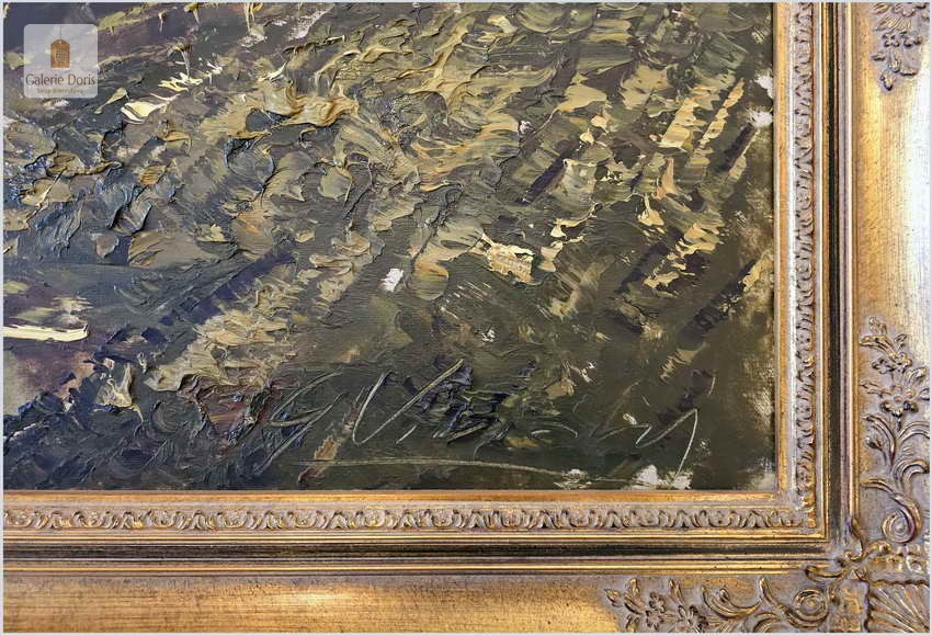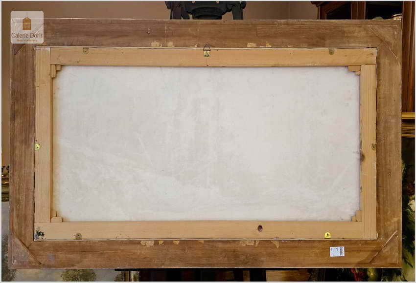 Obraz w bardzo dobrym stanie wizualnym i technicznym o dużych rozmiarach 140cm x 80cm. Zachwycająco oddał plastyczność malowanego otoczenia, całość podkreślona została finezyjnymi efektami światłocieniowymi a także wyśmienitą grą niuansów barwnych. Ten subtelnie malowany obraz cechuje znakomita technika malarska. Oprawę malowidła stanowi przestrzenna, gruba rama wykonana z drewna. Złoconą ramę bogato dekorują kunsztowne sztukaterie. Gwarantujemy profesjonalnie zabezpieczoną przesyłkę kurierem.