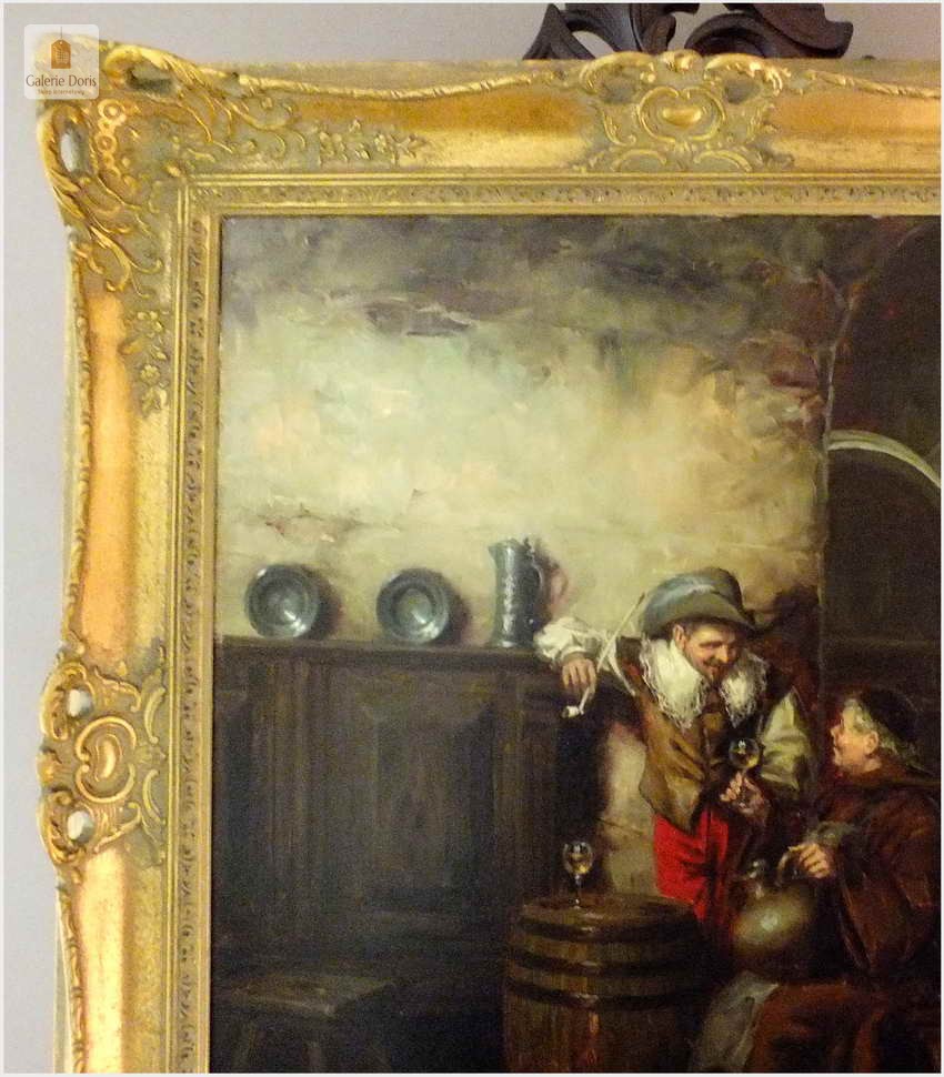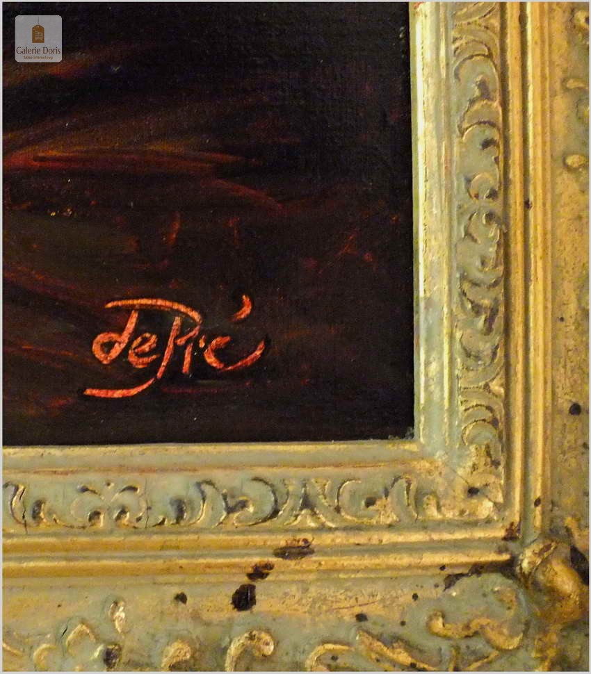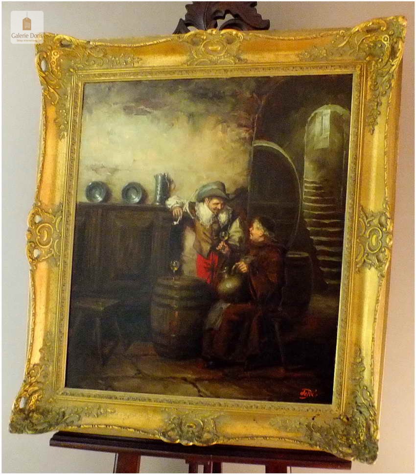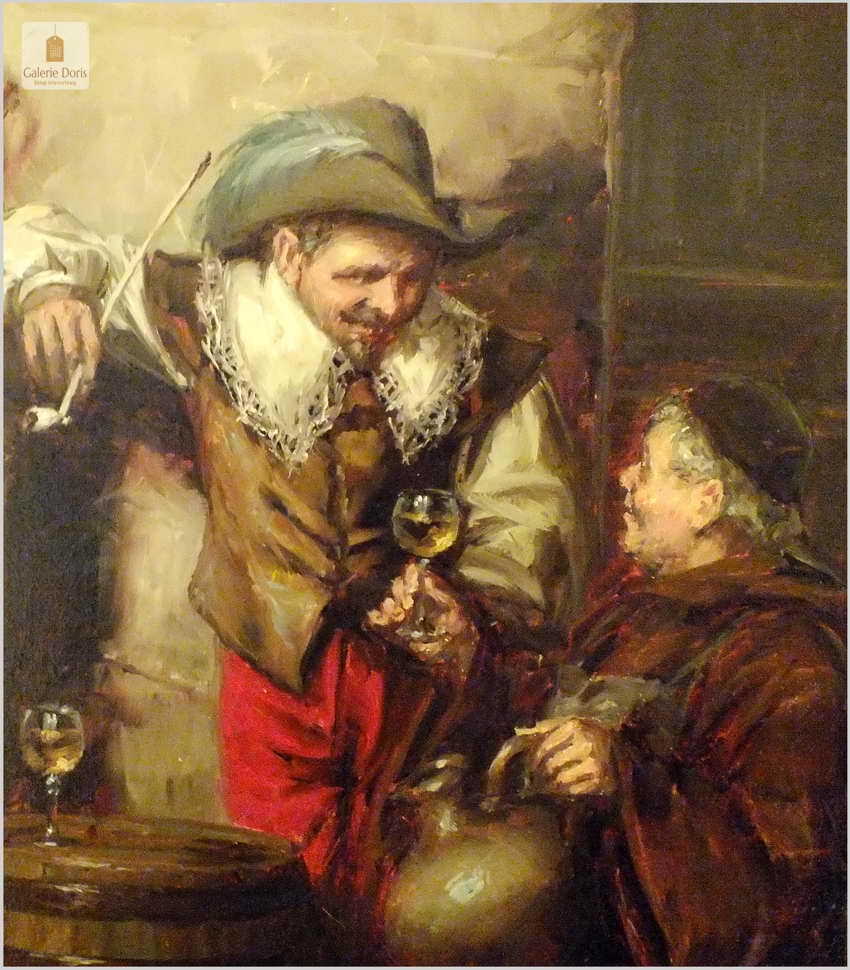 Polecamy stary obraz olejny pędzla znanego malarza niemieckiego Willi DePré. Zachwycająco oddał niesamowicie plastyczność malowanych postaci oraz ich otoczenia, całość podkreślona została finezyjnymi efektami światłocieniowymi a także wyśmienitą grą niuansów barwnych. Ten subtelnie malowany obraz cechuje znakomita technika malarska. Obraz bezpośrednio nawiązuje do dzieła XVII-wiecznego malarstwa. Oprawę malowidła stanowi przestrzenna, gruba rama wykonana z drewna. Złoconą ramę bogato dekorują kunsztowne sztukaterie. Obraz sygnowany jest w dolnym rogu ramy. Gwarantujemy profesjonalnie zabezpieczoną przesyłkę kurierem.