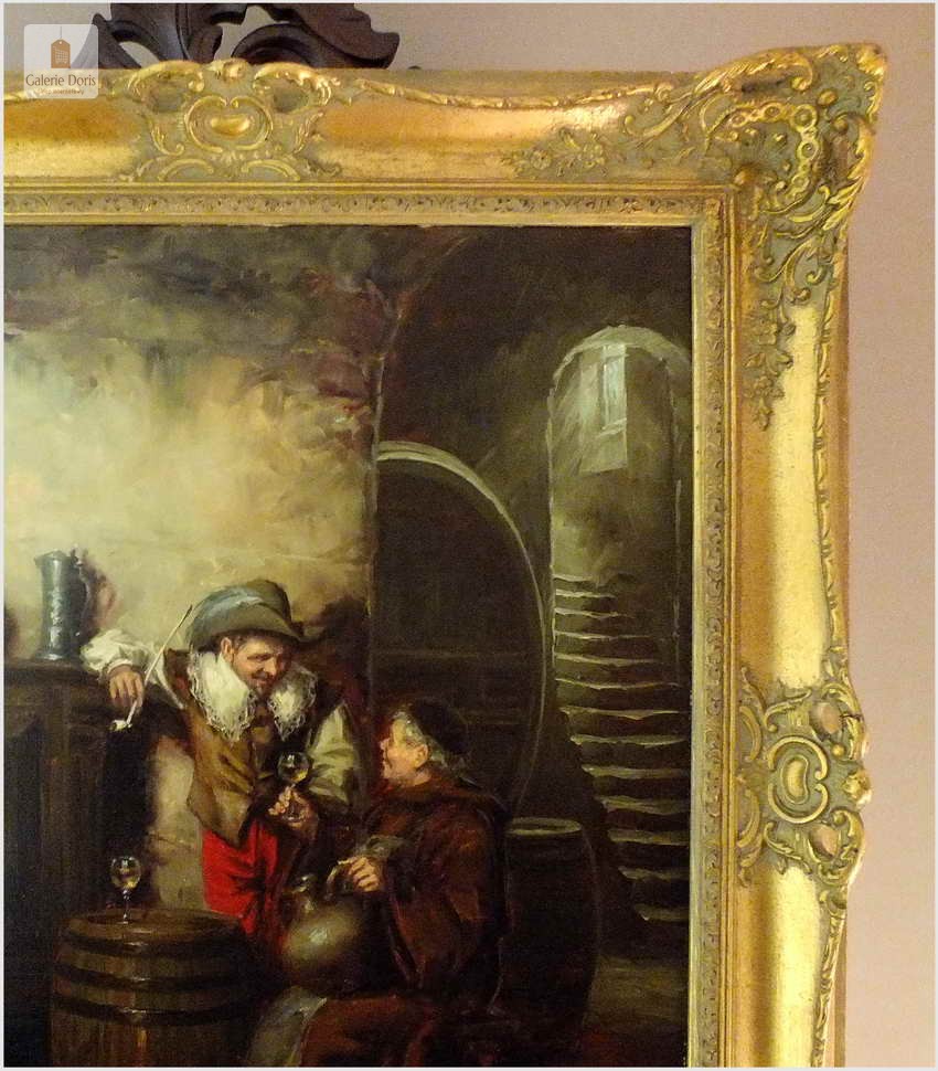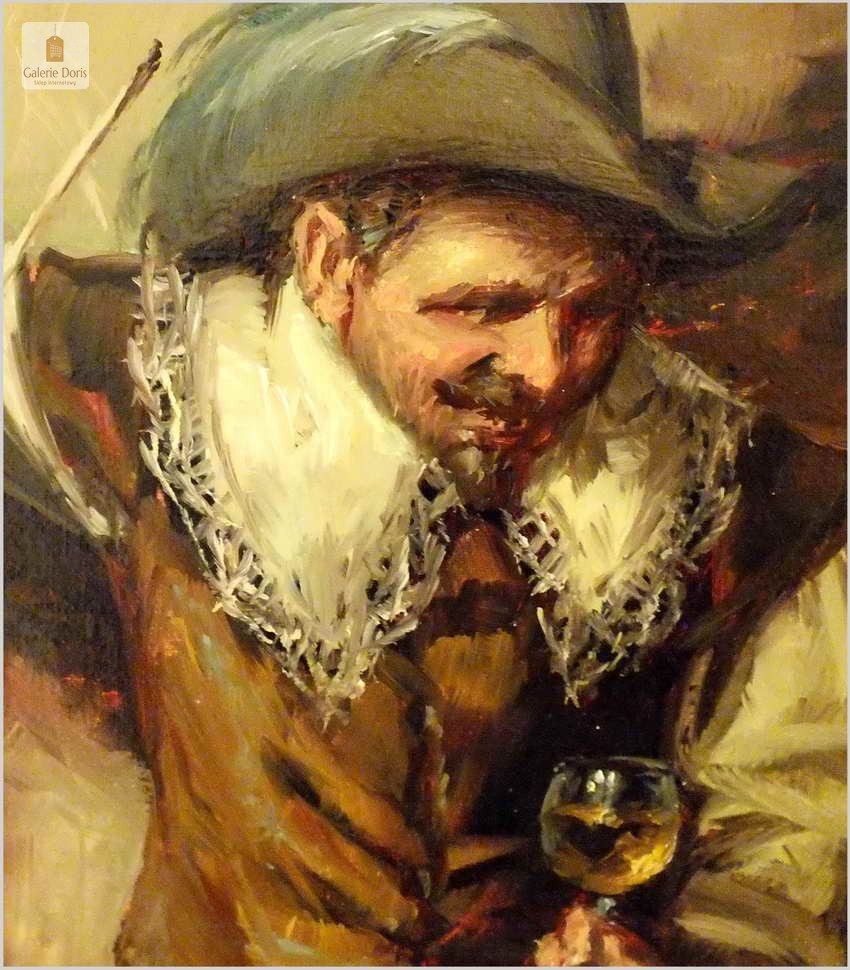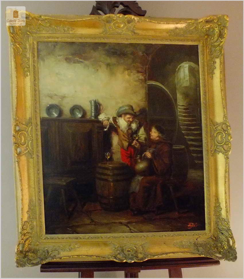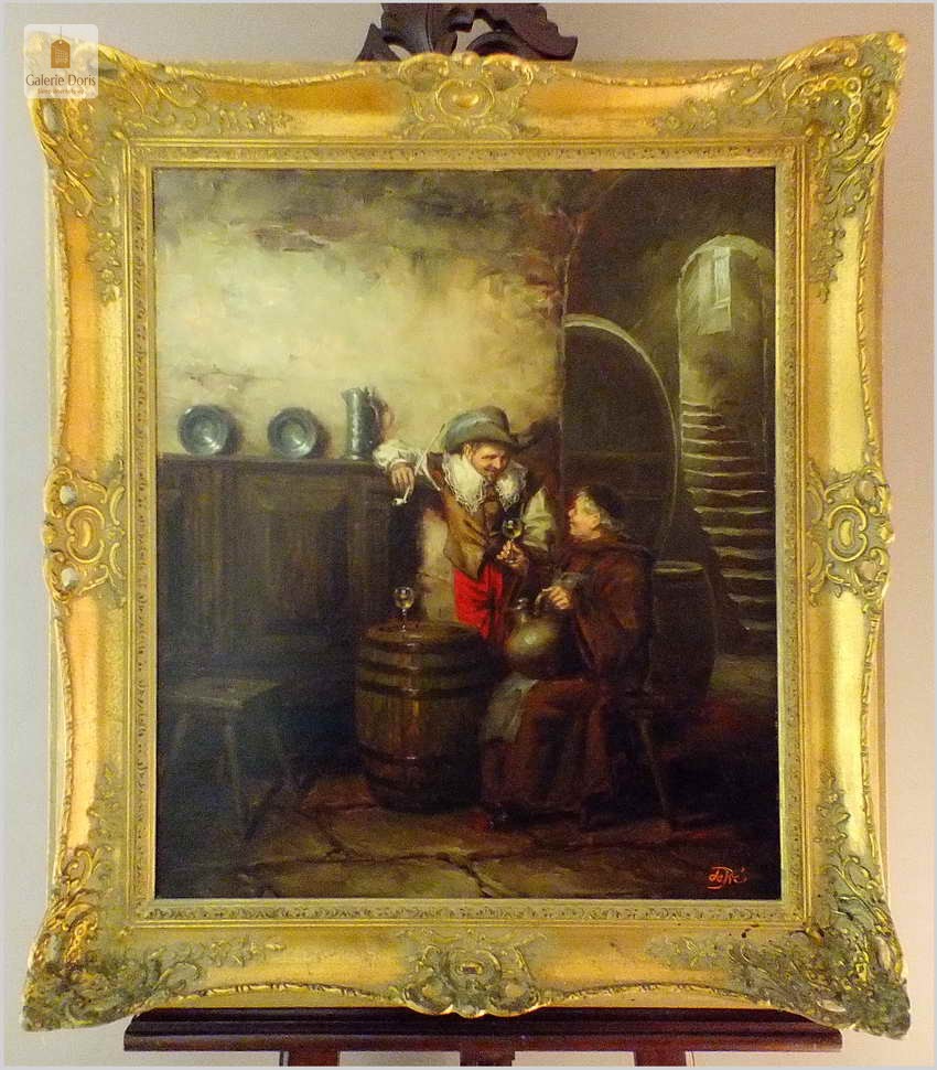 Polecamy stary obraz olejny pędzla znanego malarza niemieckiego Willi DePré. Zachwycająco oddał niesamowicie plastyczność malowanych postaci oraz ich otoczenia, całość podkreślona została finezyjnymi efektami światłocieniowymi a także wyśmienitą grą niuansów barwnych. Ten subtelnie malowany obraz cechuje znakomita technika malarska. Obraz bezpośrednio nawiązuje do dzieła XVII-wiecznego malarstwa. Oprawę malowidła stanowi przestrzenna, gruba rama wykonana z drewna. Złoconą ramę bogato dekorują kunsztowne sztukaterie. Obraz sygnowany jest w dolnym rogu ramy. Gwarantujemy profesjonalnie zabezpieczoną przesyłkę kurierem.