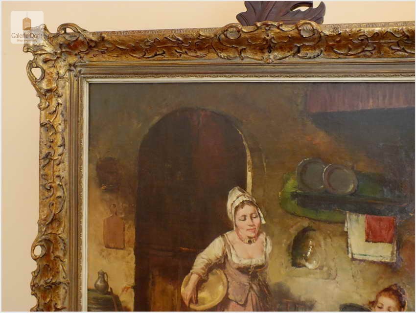 Gerhard Dickmeis (1918-1978): malarz niemiecki; studiował w Düsseldorfie. Malował pejzaże miejskie, portrety, martwe natury i przede wszystkim nie pozbawione humoru sceny rodzajowe o motywach i tematach chętnie podejmowanych przez wielu artystów niemieckich (Pijący wino, Gracze w karty, Cyganie i muzykanci, Próba wina itp). Obraz z połowy XX wieku, znanego artysty niemieckiego Gerharda Dickmeis, którego obrazy wystawiane są w liczących się galeriach malarstwa na całym świecie.