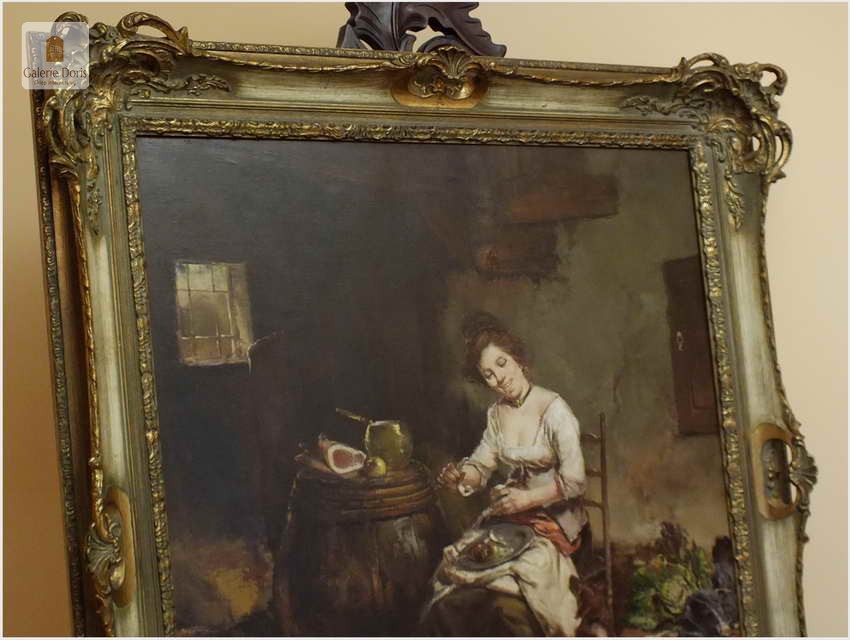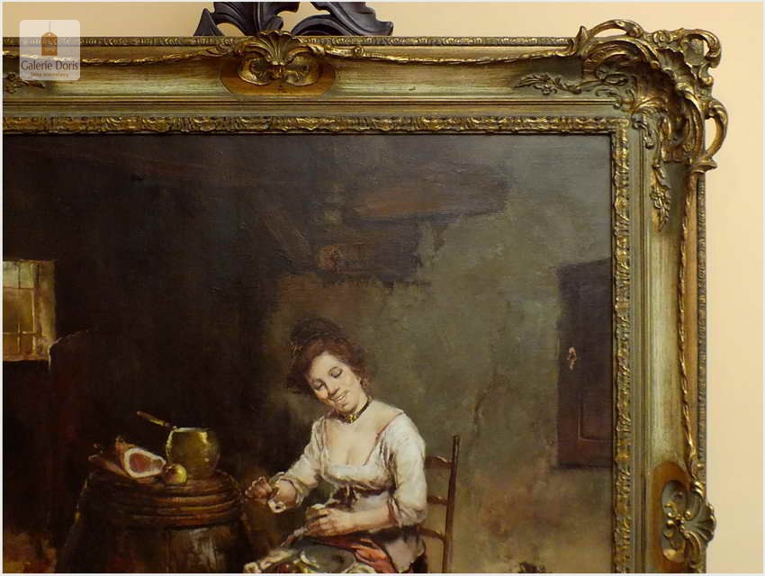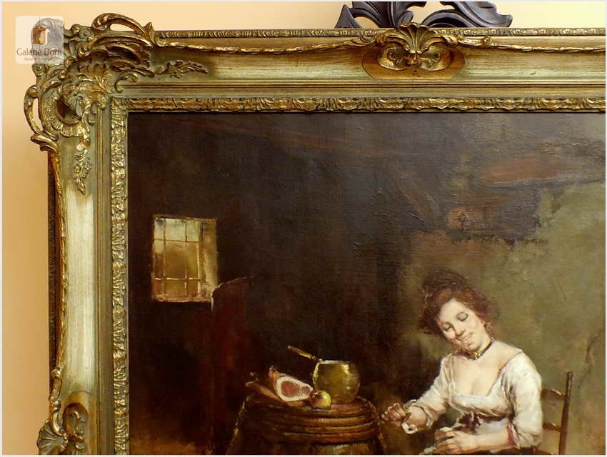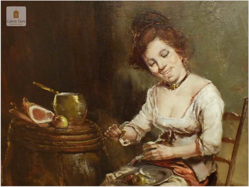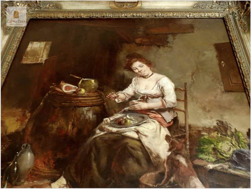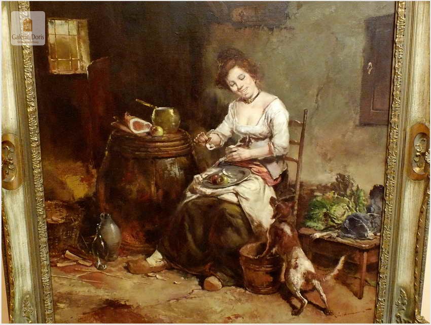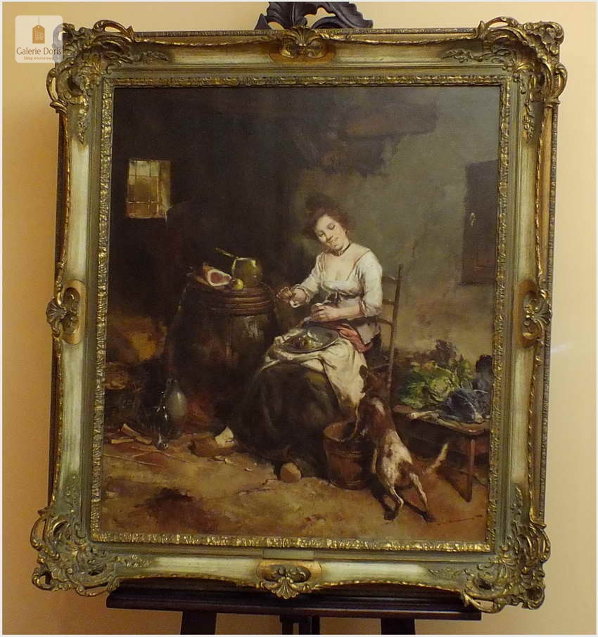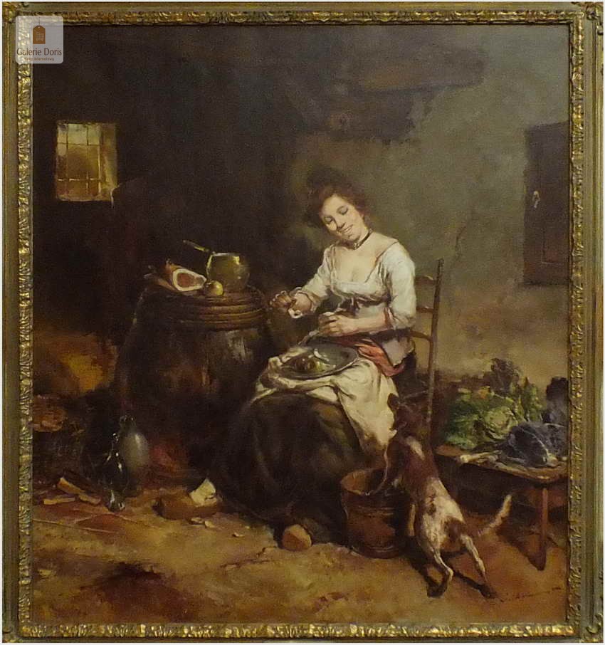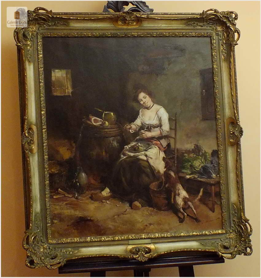 DICKMEIS, GERHARD Heinsberg 1918 - 1978 Jülich Magd mit Hund in der Speisekammer. Öl/Lwd., undeutl. signiert. 80x70cm. Zusammen mit dem Bild der Schönheit Rahmen.