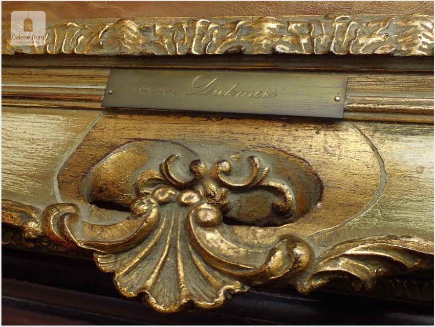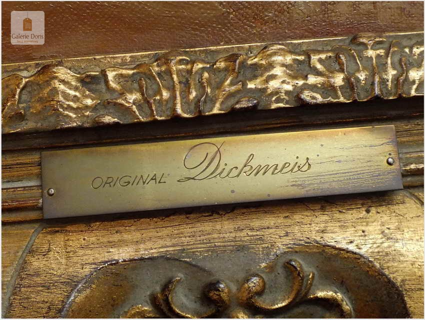 Gerhard Dickmeis (1918-1978): malarz niemiecki; studiował w Düsseldorfie. Malował pejzaże miejskie, portrety, martwe natury i przede wszystkim nie pozbawione humoru sceny rodzajowe o motywach i tematach chętnie podejmowanych przez wielu artystów niemieckich (Pijący wino, Gracze w karty, Cyganie i muzykanci, Próba wina itp). Obraz z połowy XX wieku, znanego artysty niemieckiego Gerharda Dickmeis, którego obrazy wystawiane są w liczących się galeriach malarstwa na całym świecie.