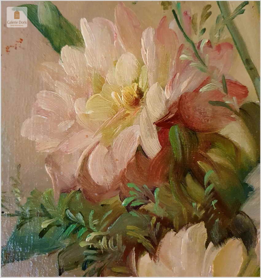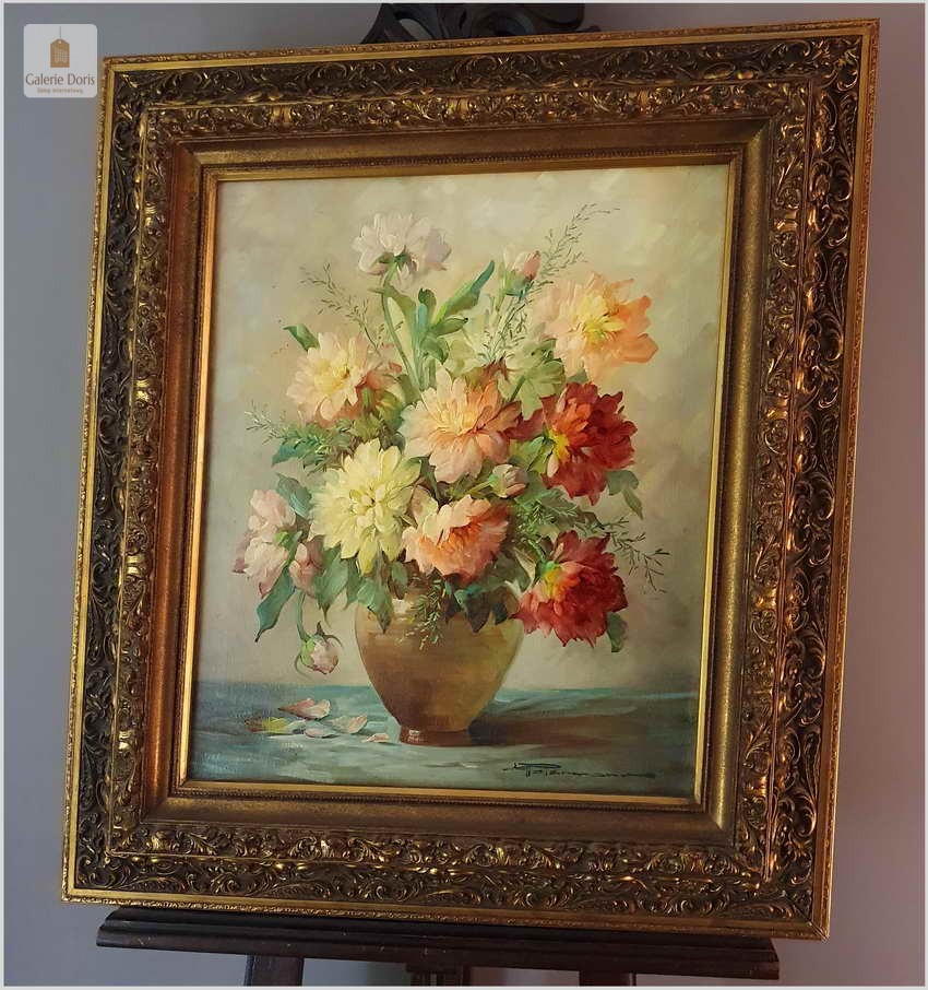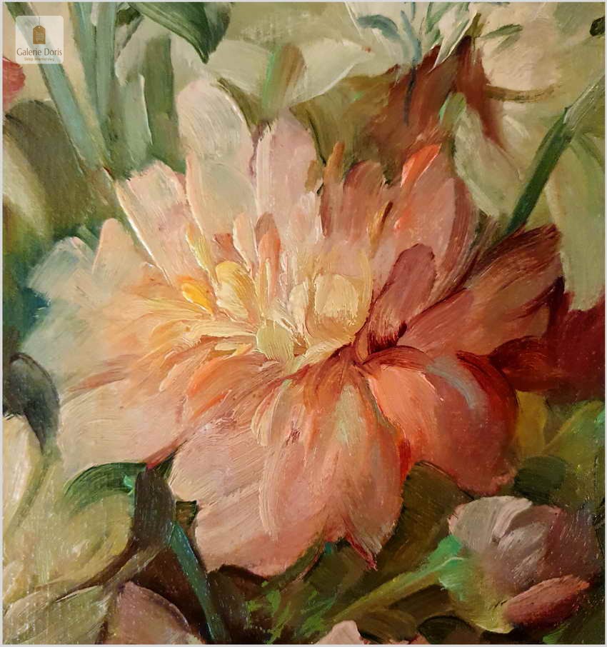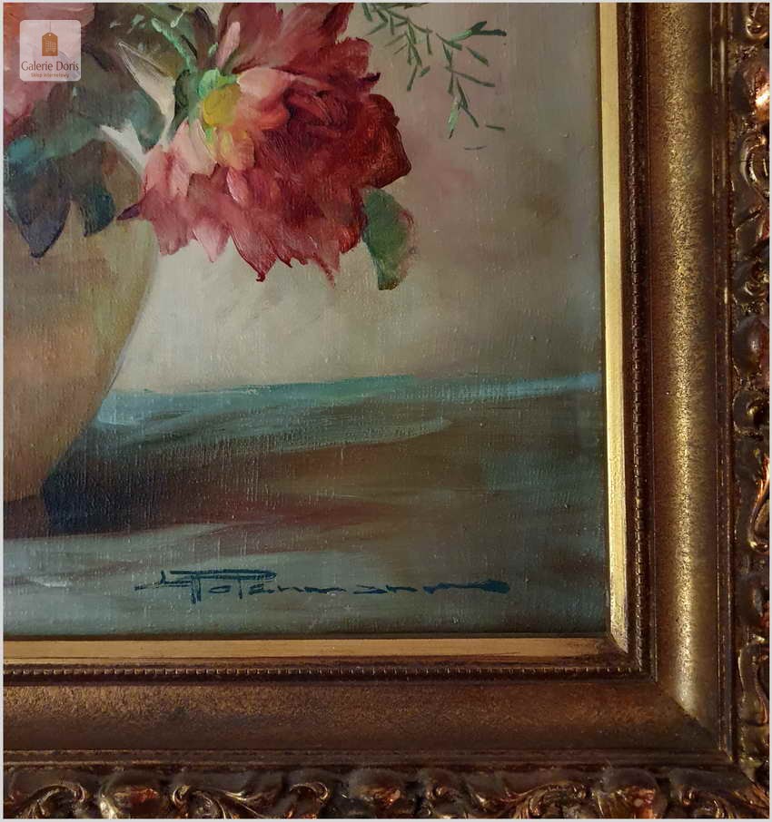 Proponujemy Państwu dobrą pracę olejną, niemieckiej malarki martwych natur. Hedwig Petermann to malarka, która głównym tematem malarskim jaki uprawiała były subtelne a zarazem piękne kompozycje kwiatowe. Uczennica Wilhelma Ecksteina w Düsseldorfie. Malowała martwe natury z owocami i kwiatami, które wyróżniają się dobrą kompozycją, szlachetnym kolorytem, miękkością modelunku i łagodnym nastrojem.
