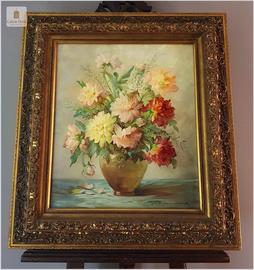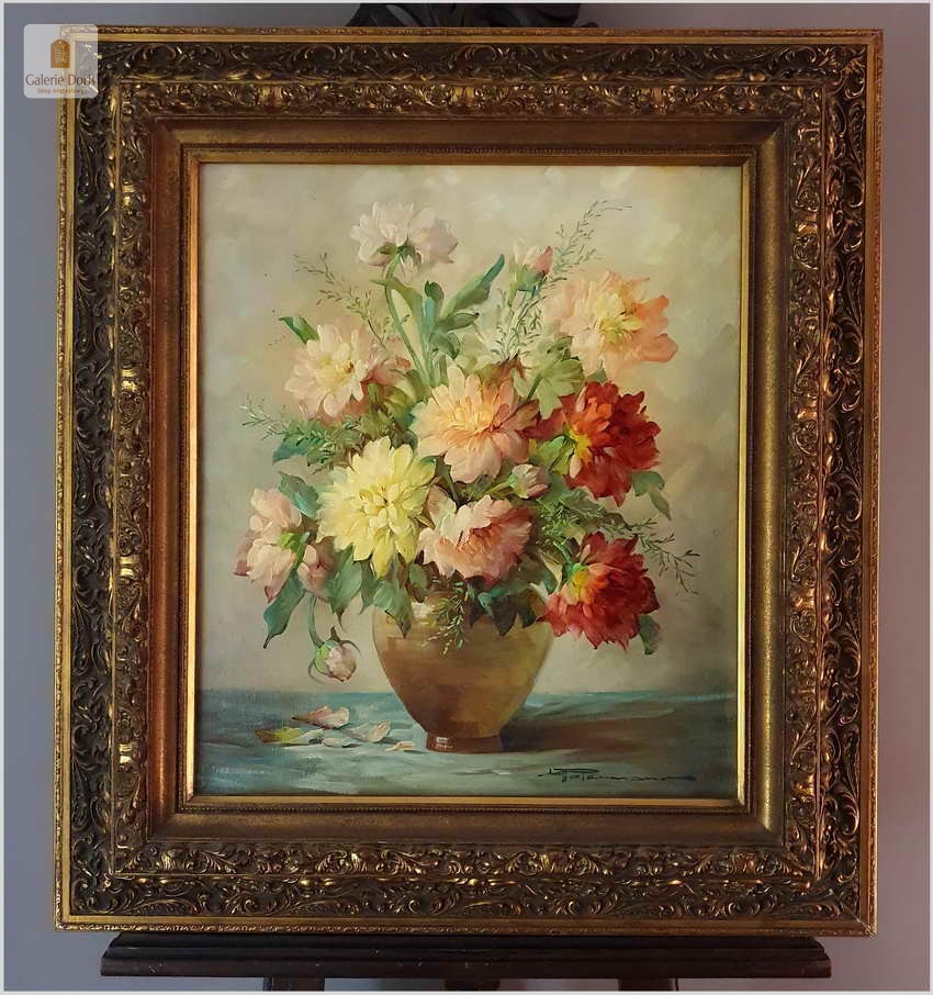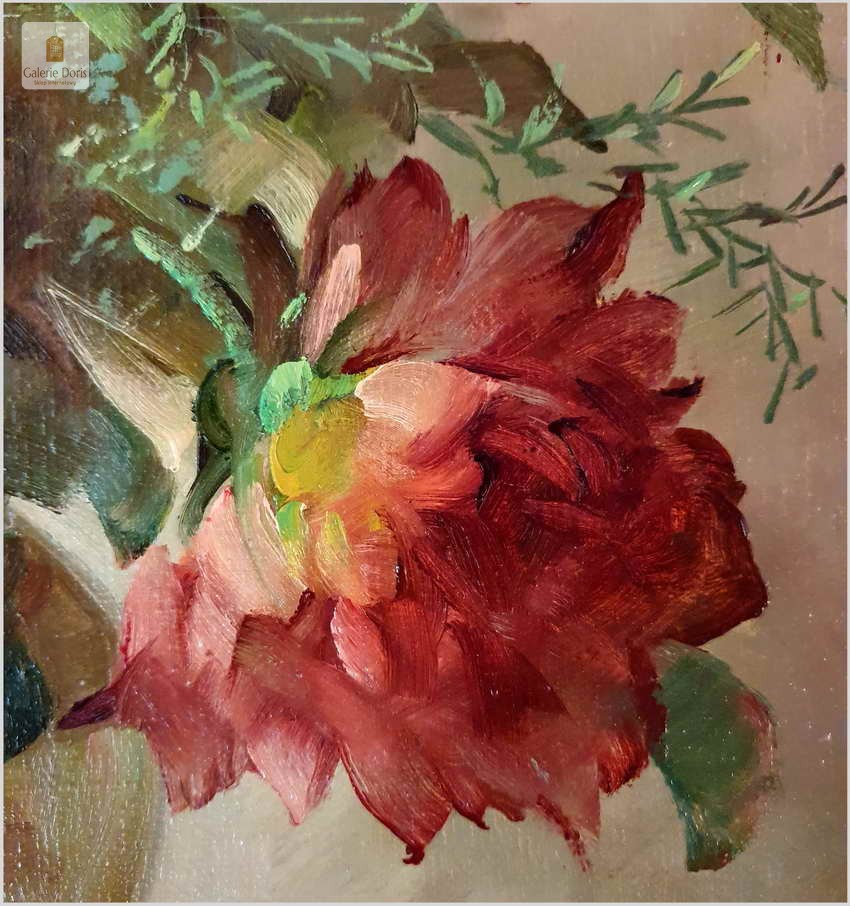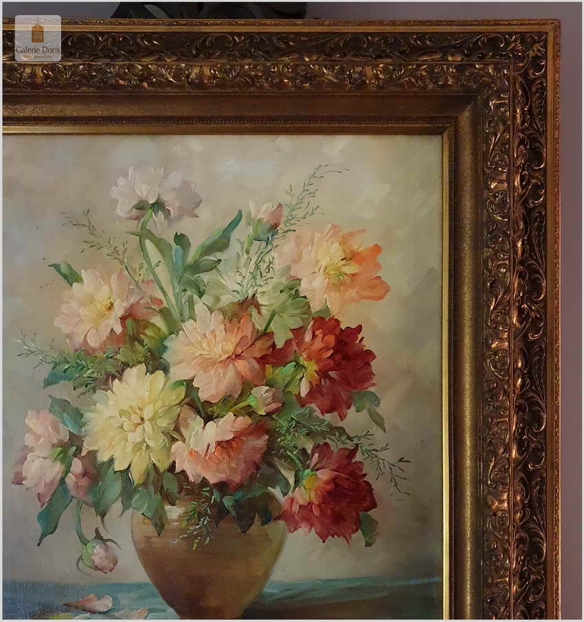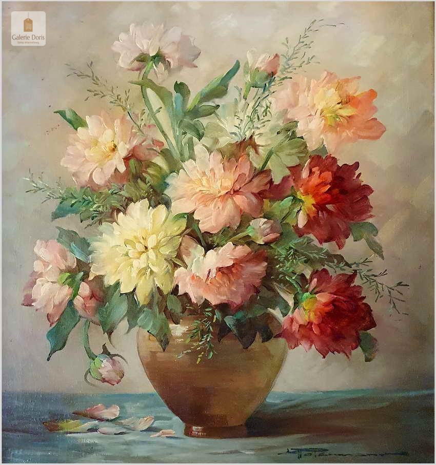 Proponujemy Państwu dobrą pracę olejną, niemieckiej malarki martwych natur. Hedwig Petermann to malarka, która głównym tematem malarskim jaki uprawiała były subtelne a zarazem piękne kompozycje kwiatowe. Uczennica Wilhelma Ecksteina w Düsseldorfie. Malowała martwe natury z owocami i kwiatami, które wyróżniają się dobrą kompozycją, szlachetnym kolorytem, miękkością modelunku i łagodnym nastrojem.