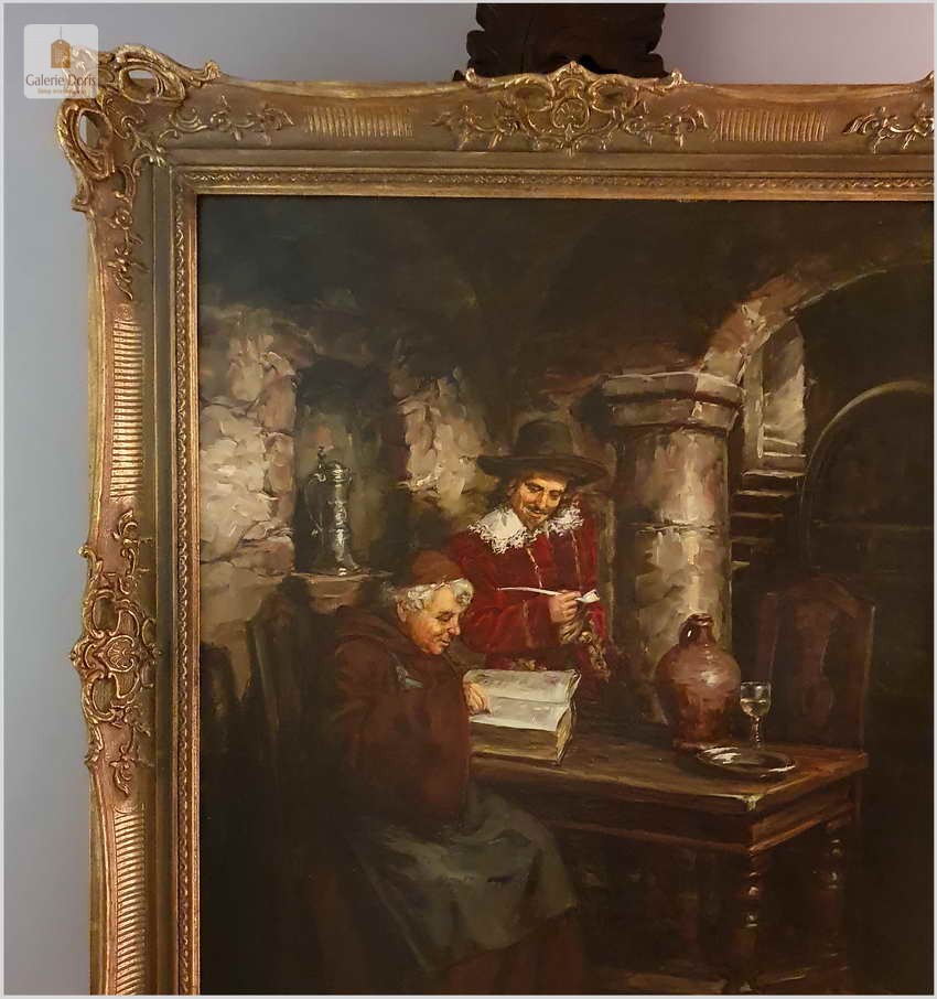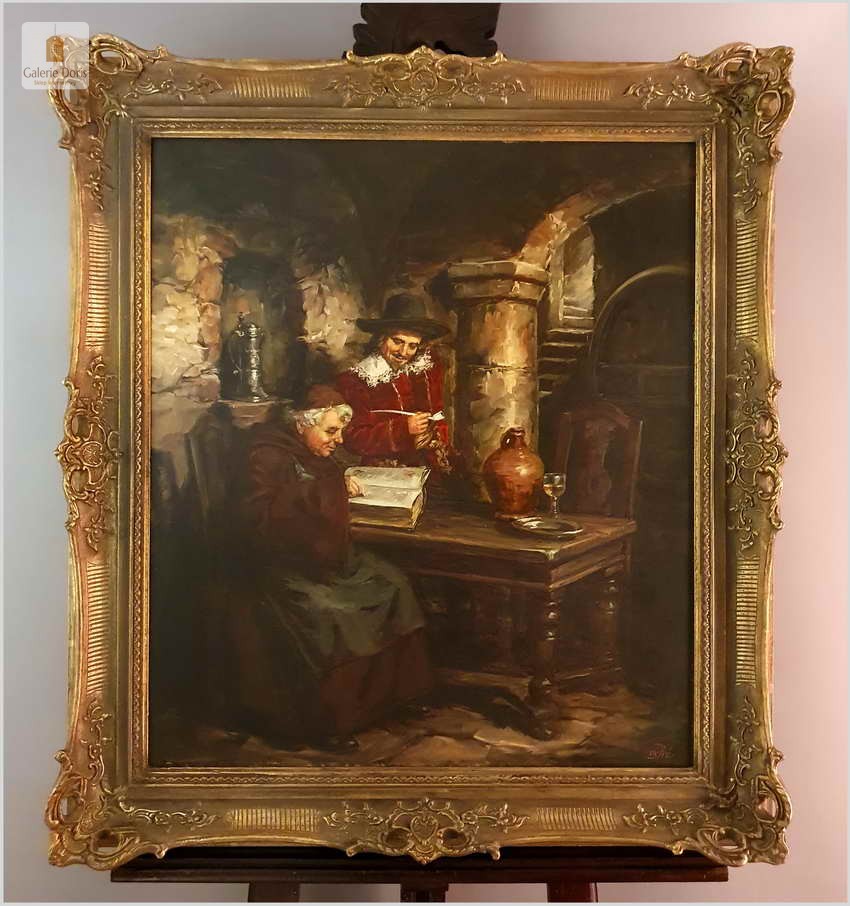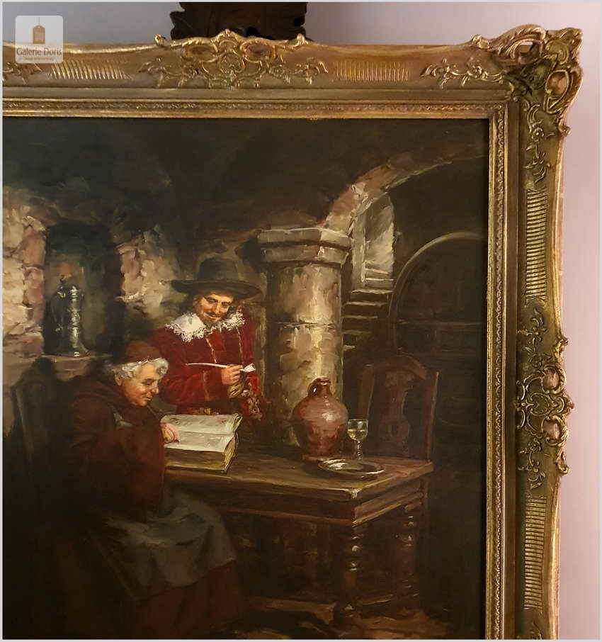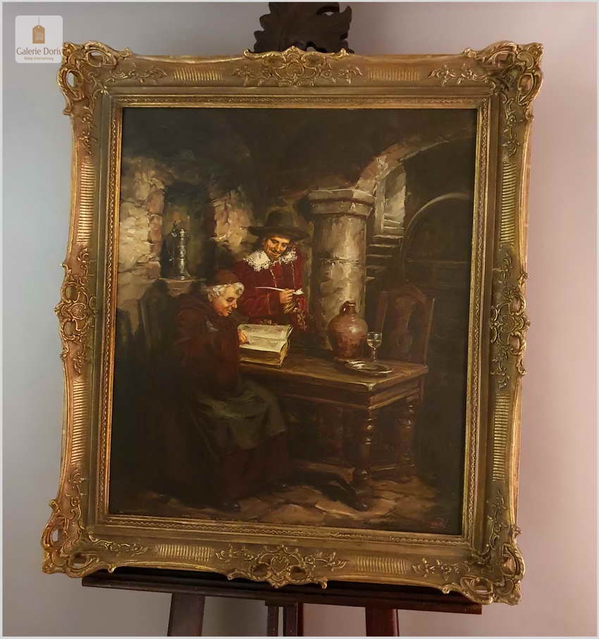 Polecamy stary obraz olejny pędzla znanego malarza niemieckiego Willi DePré. Zachwycająco oddał niesamowicie plastyczność malowanych postaci oraz ich otoczenia, całość podkreślona została finezyjnymi efektami światłocieniowymi a także wyśmienitą grą niuansów barwnych. Ten subtelnie malowany obraz cechuje znakomita technika malarska. Obraz bezpośrednio nawiązuje do dzieła XVII-wiecznego malarstwa. Oprawę malowidła stanowi przestrzenna, gruba rama wykonana z drewna. Obraz sygnowany jest w dolnym rogu ramy.