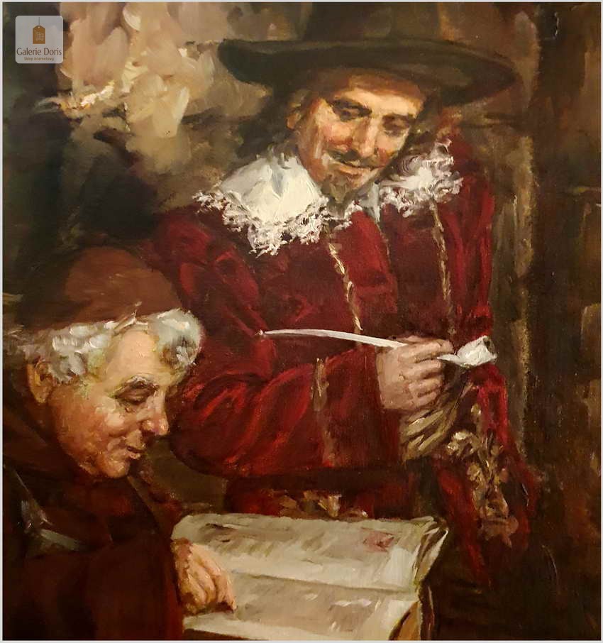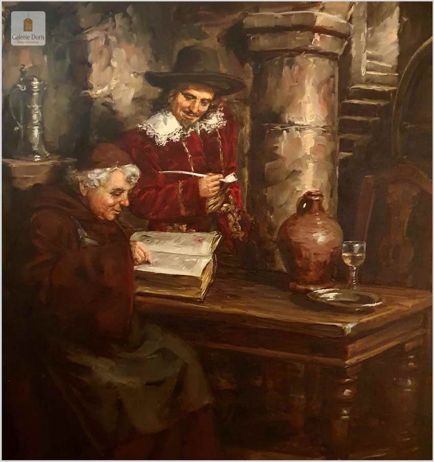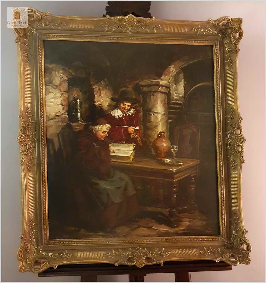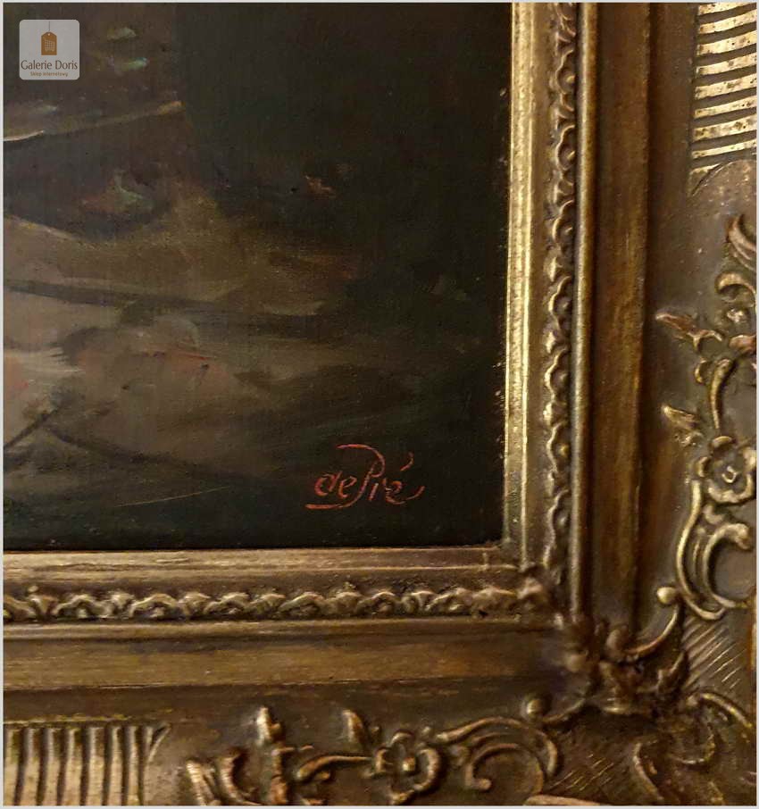Polecamy stary obraz olejny pędzla znanego malarza niemieckiego Willi DePré. Zachwycająco oddał niesamowicie plastyczność malowanych postaci oraz ich otoczenia, całość podkreślona została finezyjnymi efektami światłocieniowymi a także wyśmienitą grą niuansów barwnych. Ten subtelnie malowany obraz cechuje znakomita technika malarska. Obraz bezpośrednio nawiązuje do dzieła XVII-wiecznego malarstwa. Oprawę malowidła stanowi przestrzenna, gruba rama wykonana z drewna. Obraz sygnowany jest w dolnym rogu ramy.