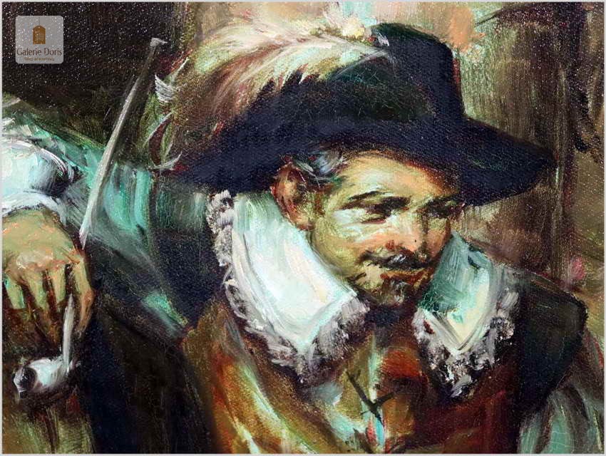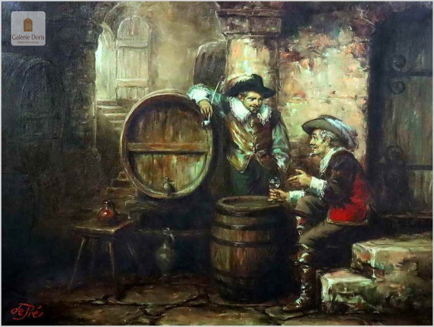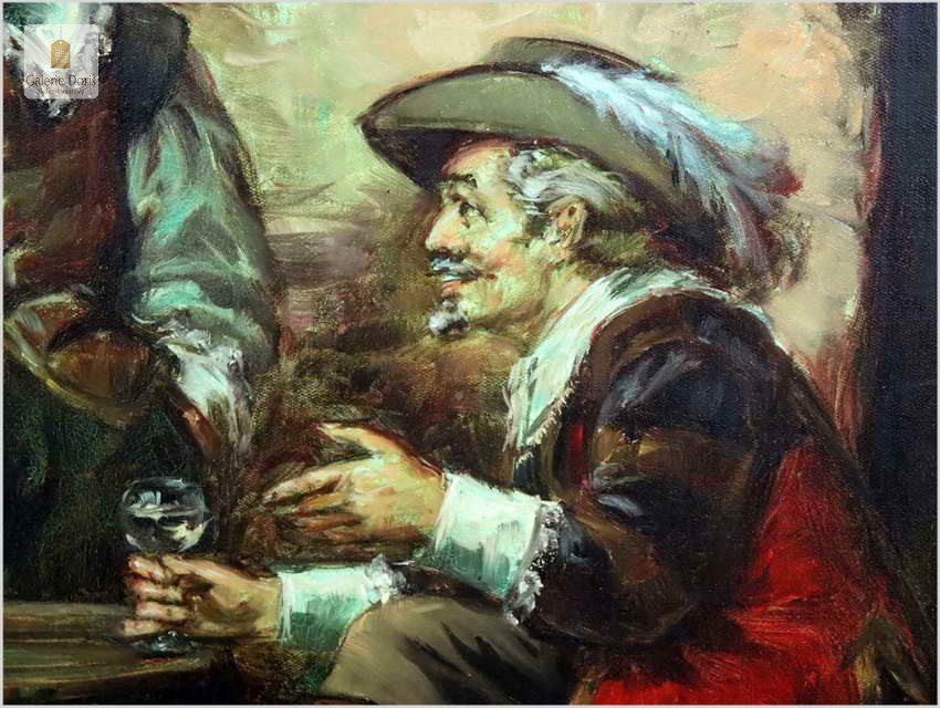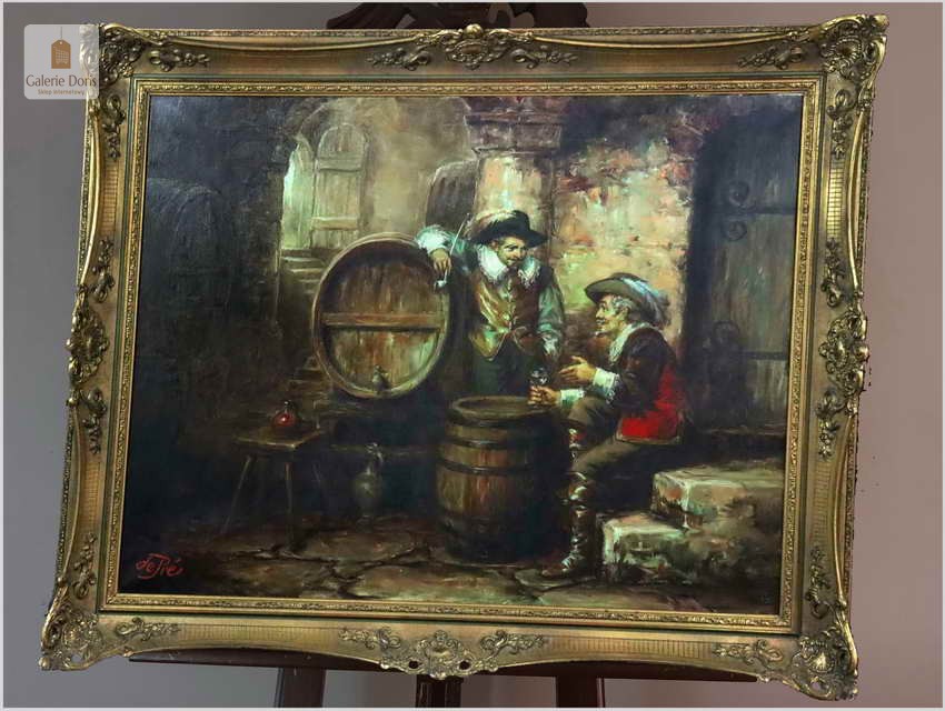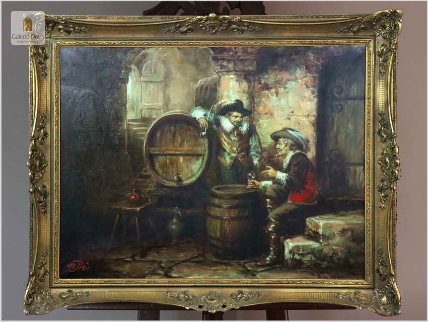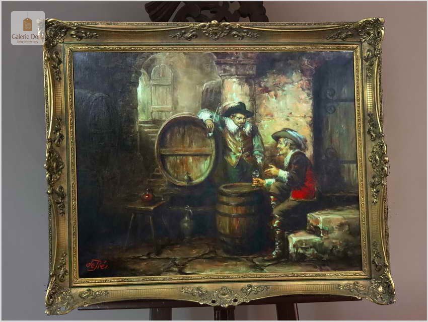 Polecamy stary obraz olejny pędzla znanego malarza niemieckiego Willi DePré. Zachwycająco oddał niesamowicie plastyczność malowanych postaci oraz ich otoczenia, całość podkreślona została finezyjnymi efektami światłocieniowymi a także wyśmienitą grą niuansów barwnych. Ten subtelnie malowany obraz cechuje znakomita technika malarska. Obraz bezpośrednio nawiązuje do dzieła XVII-wiecznego malarstwa. Oprawę malowidła stanowi przestrzenna, gruba rama wykonana z drewna. Obraz sygnowany jest w dolnym rogu ramy.