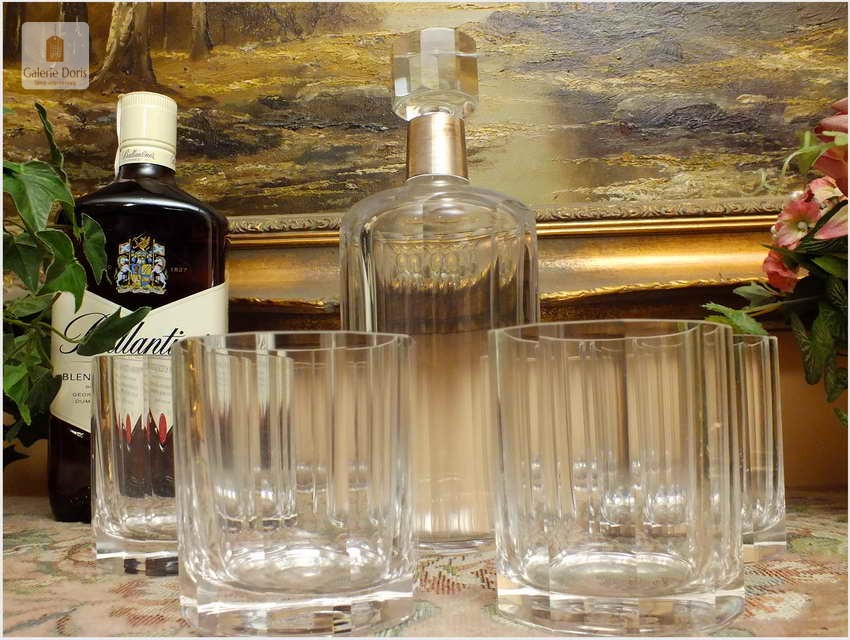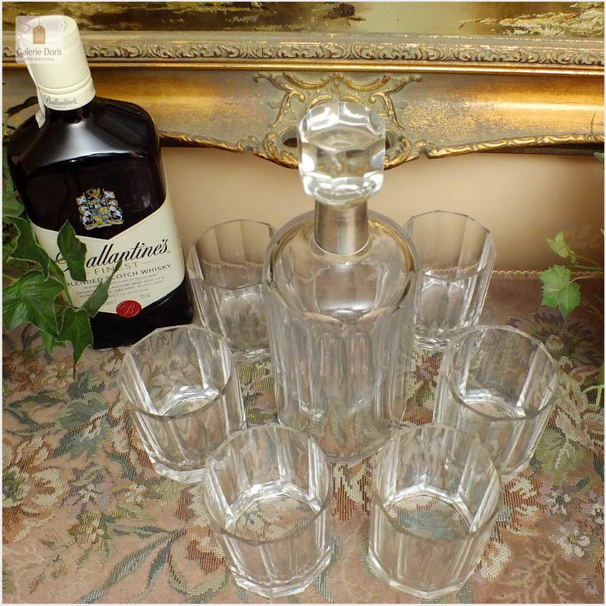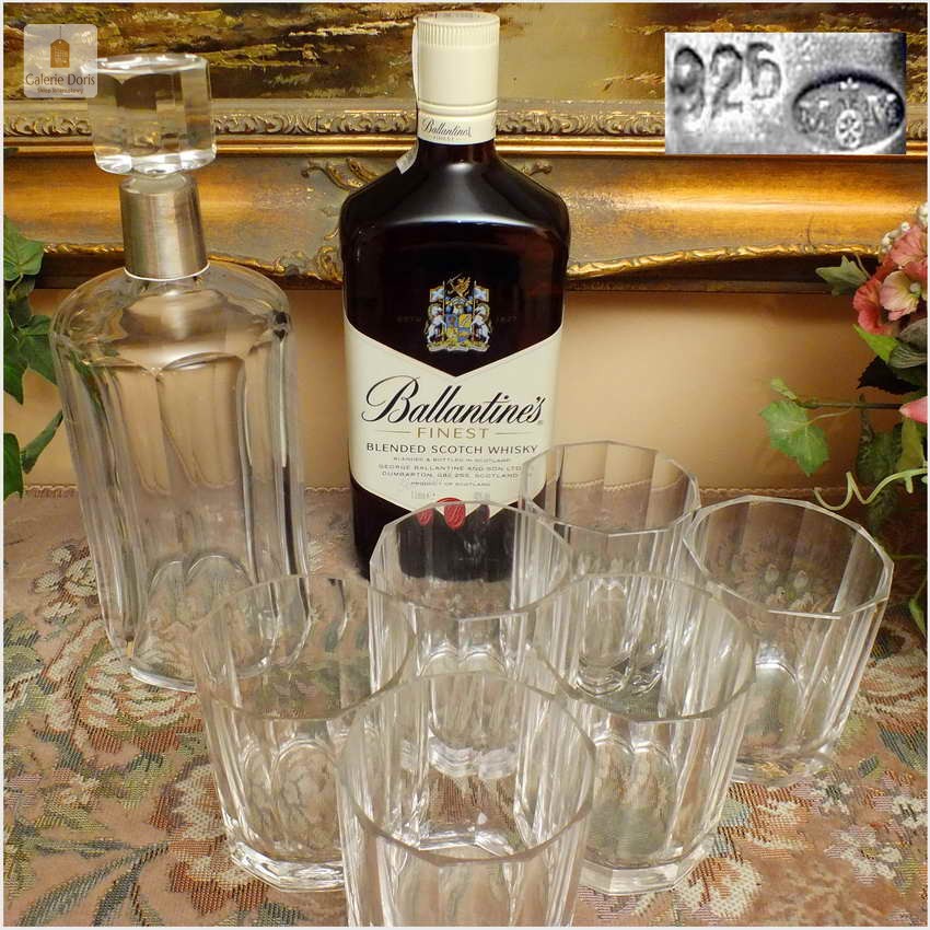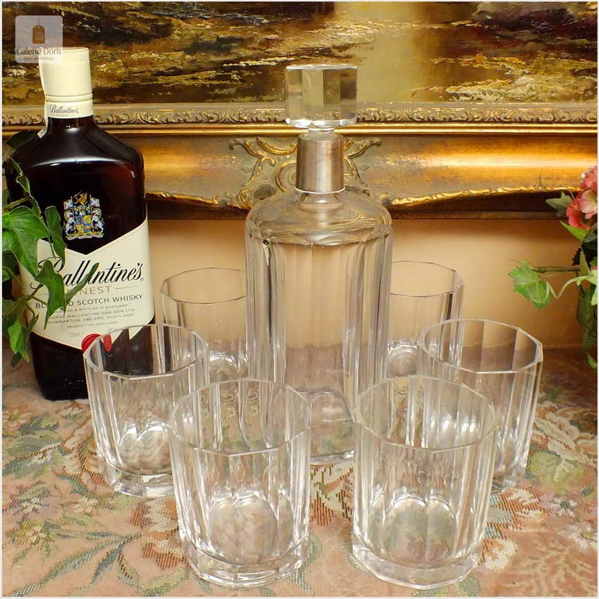 KARAFKA, SZEŚĆ SZKLANEK DO WHISKY ~ MARTIN MAYER 1888r. (srebro 925) / Specjalnie dla osób kochających wyjątkowy smak i zapach whisky przygotowaliśmy stosowne szklanki i karafkę idealną do picia powyższego trunku. Stary komplet bez uszkodzeń. Whisky, jak przystało na cenny trunek, wymaga odpowiedniego traktowania. Najlepszym miejscem do przechowywania jest zamknięty barek, nie lodówka czy zamrażarka jak w przypadku innych alkoholi. Podobnie sposób podawania – tu najlepiej sprawdzi się temperatura pokojowa i odpowiednie szklanki. Ta oferta składa się z karafki + sześć szklanek do Whisky. Polecamy!