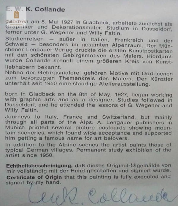 W Galerie Doris stosujemy sztywne i rzetelne reguły wystawiania dokumentów, ponieważ wierzymy w odpowiedzialność za słowo pisane. Pragniemy ostrzec przed praktykami niektórych galerii, które sugerują, że sprawdzenie dostępności certyfikatu do konkretnego obrazu jest zbędne, gdyż "wszystko u nich jest oryginalne". Argumentują to faktem, że obrazy są namalowane ręcznie – również te niezidentyfikowane. Jest to bezwartościowy dodatek marketingowy, mający na celu jedynie zwiększenie zysku sprzedażowego gdyż wystawiają certyfikat na obrazy niezidentyfikowane.