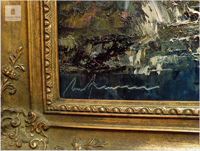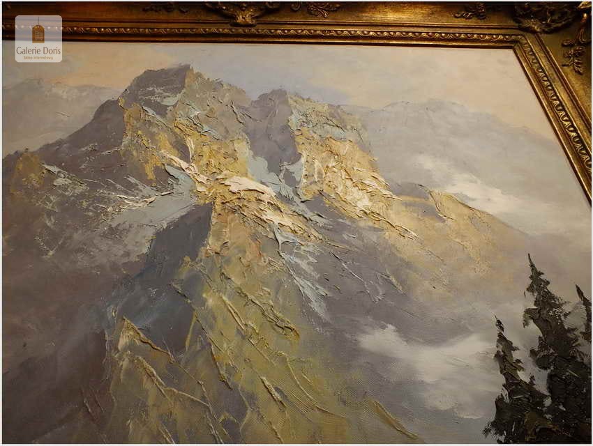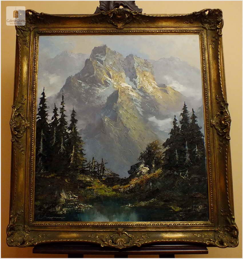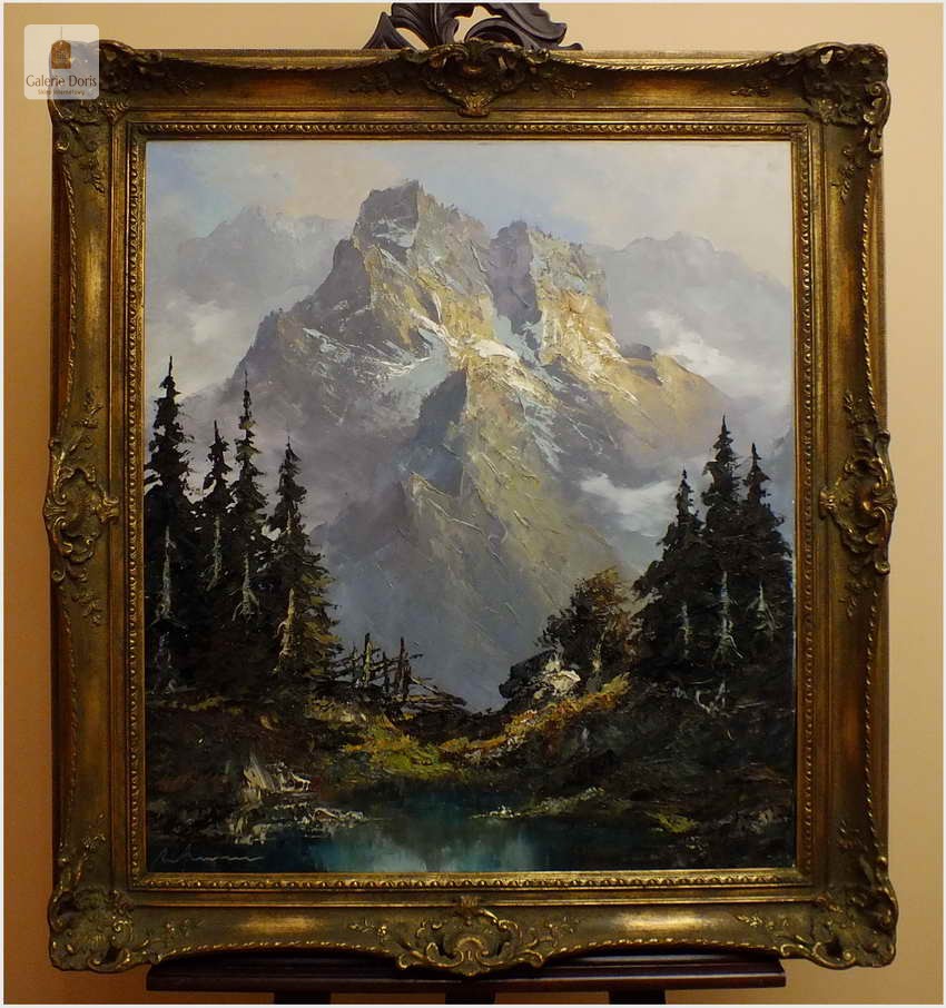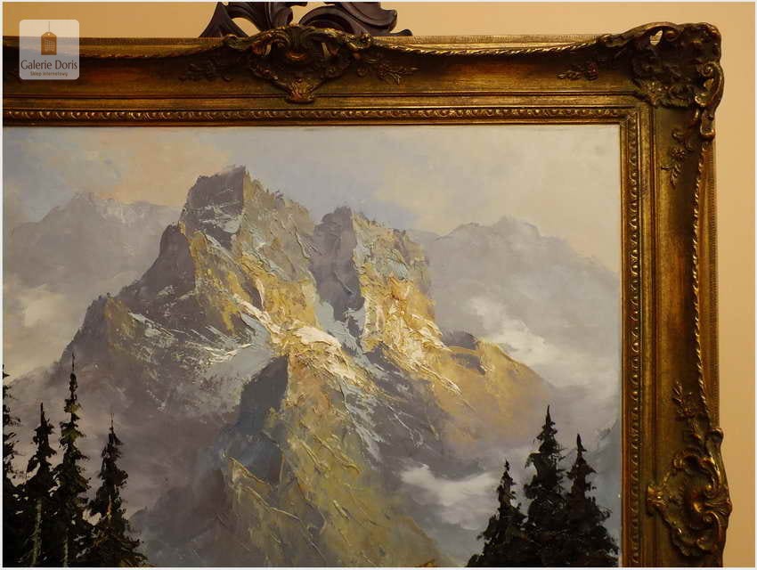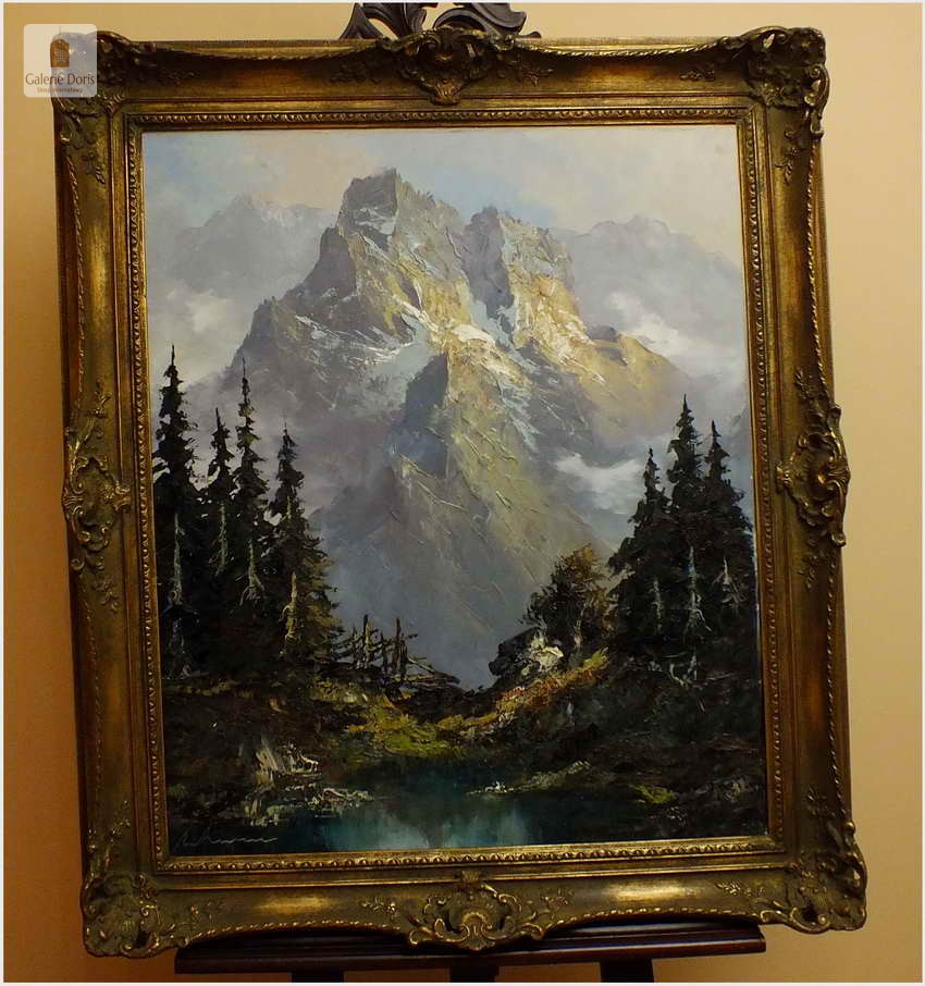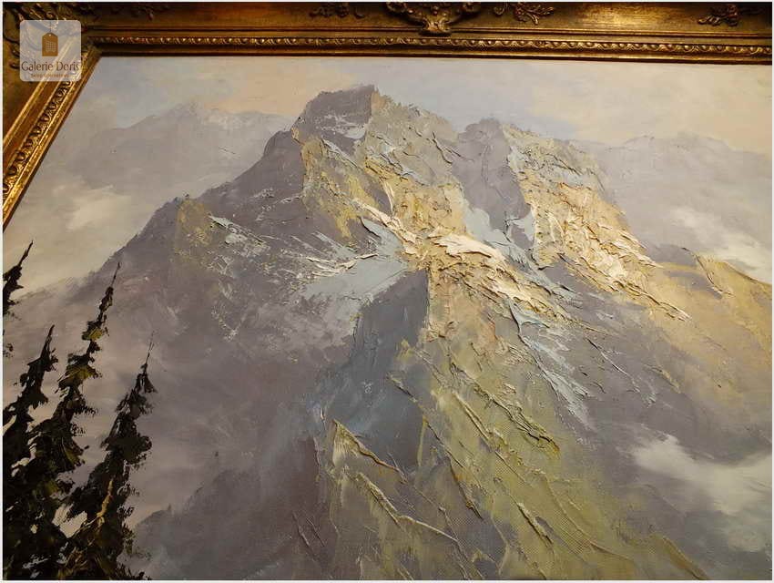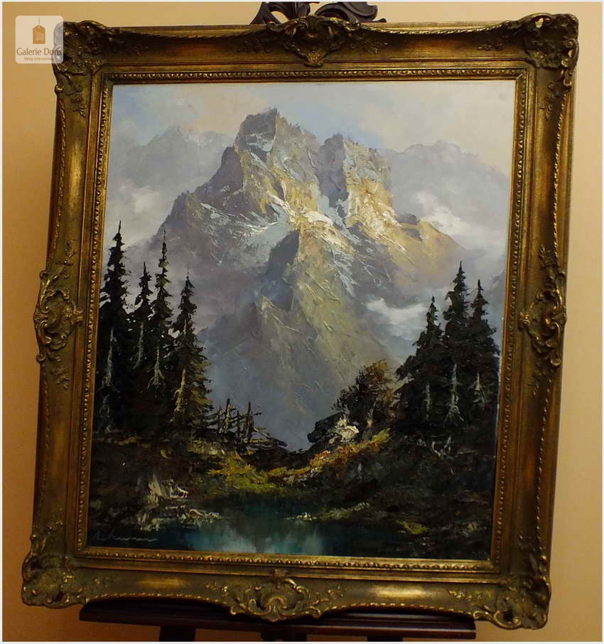 Polecamy obraz malowany techniką szpachlową olejem na płótnie znanego malarza niemieckiego Herberta Uerpmanna, obraz sygnowany w dolnym rogu. Po jakości i ruchach pędzla widać kunszt i profesjonalizm dzieła. Urodził się w Wuppertal-Bremen studiował w szkole artystycznej Barmen Wiethüchter u profesorów: Gustav i Ludwig Fahrenkrog, wiele wyjazdów studyjnych w całej Europie, Wielokrotnie katalogowany i wymieniony w odpowiednich prestiżowych katalogach o malarstwie. Malarz na obrazie ukazuje swoją fascynację do krajobrazów alpejskich. Wyraża to naturalnym kolorem, światłem oraz wirtuozerią szpachli i pędzla. Polecamy!