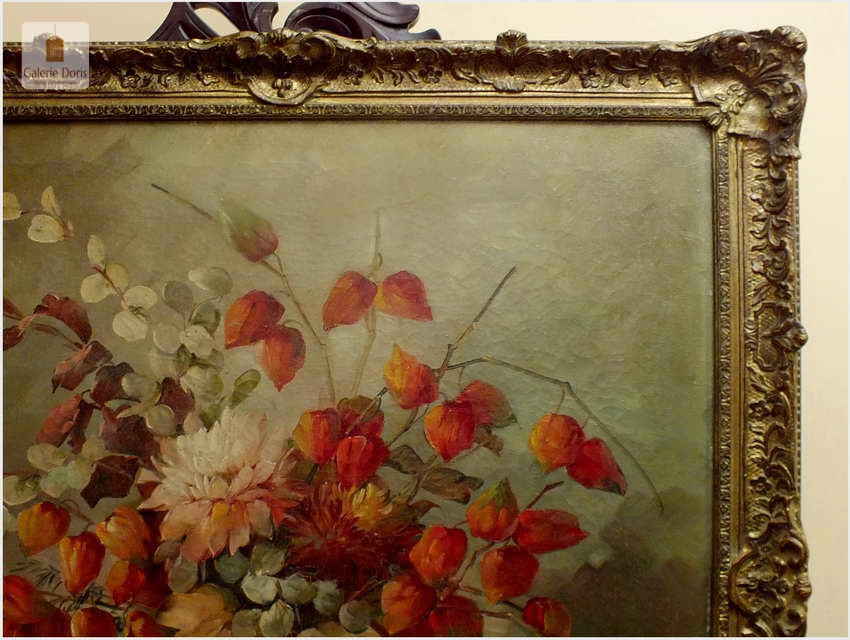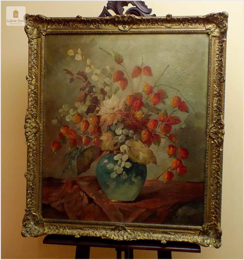 Proponujemy Państwu dobrą pracę olejną, niemieckiej malarki martwych natur. Hedwig Petermann to malarka, która głównym tematem malarskim jaki uprawiała były subtelne a zarazem piękne kompozycje kwiatowe. Uczennica Wilhelma Ecksteina w Düsseldorfie. Malowała martwe natury z owocami i kwiatami, które wyróżniają się dobrą kompozycją, szlachetnym kolorytem, miękkością modelunku i łagodnym nastrojem. Oferowany obraz to kompozycja wiosennych kwiatów z miechunką. Obraz bez uszkodzeń, praca stara przedwojenna posiadająca naturalną krakelurę. Poprzedni właściciel celem wzmocnienia płótna zagruntował rewers obrazu.