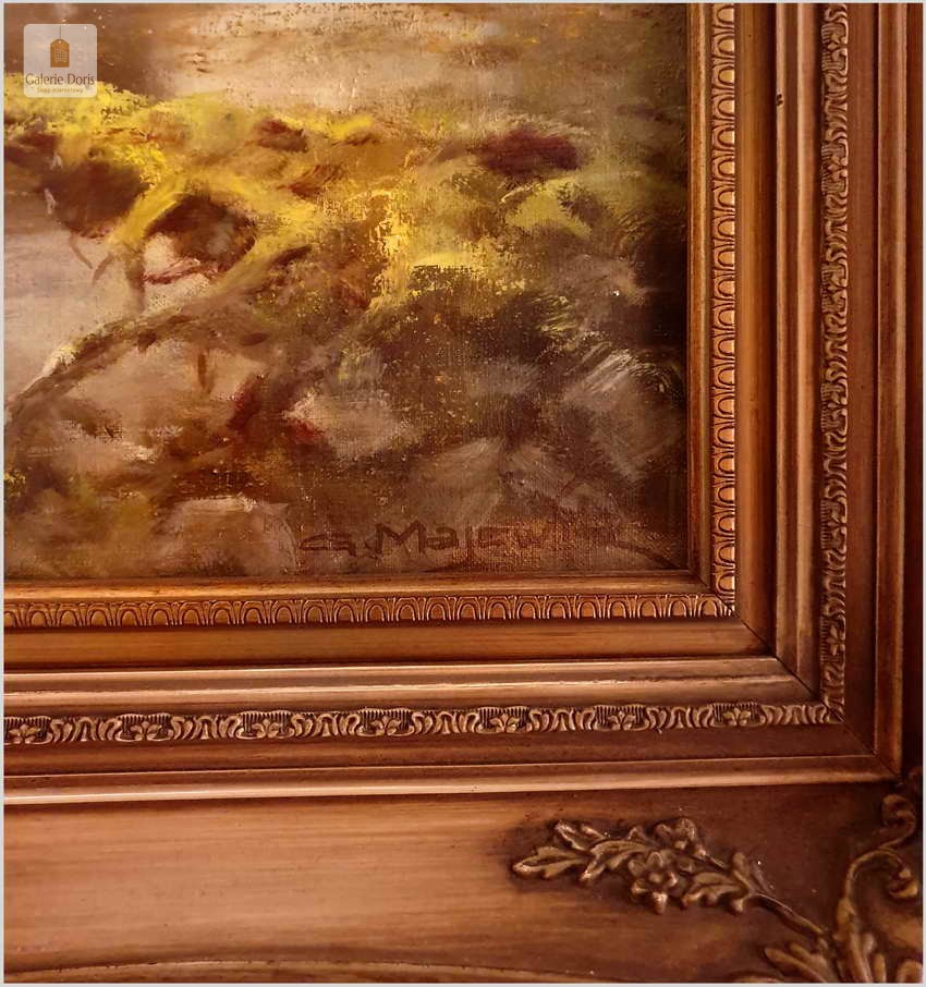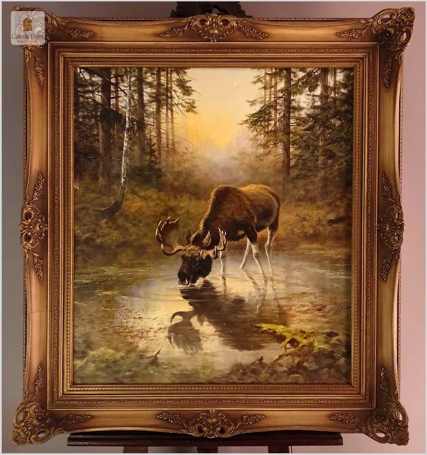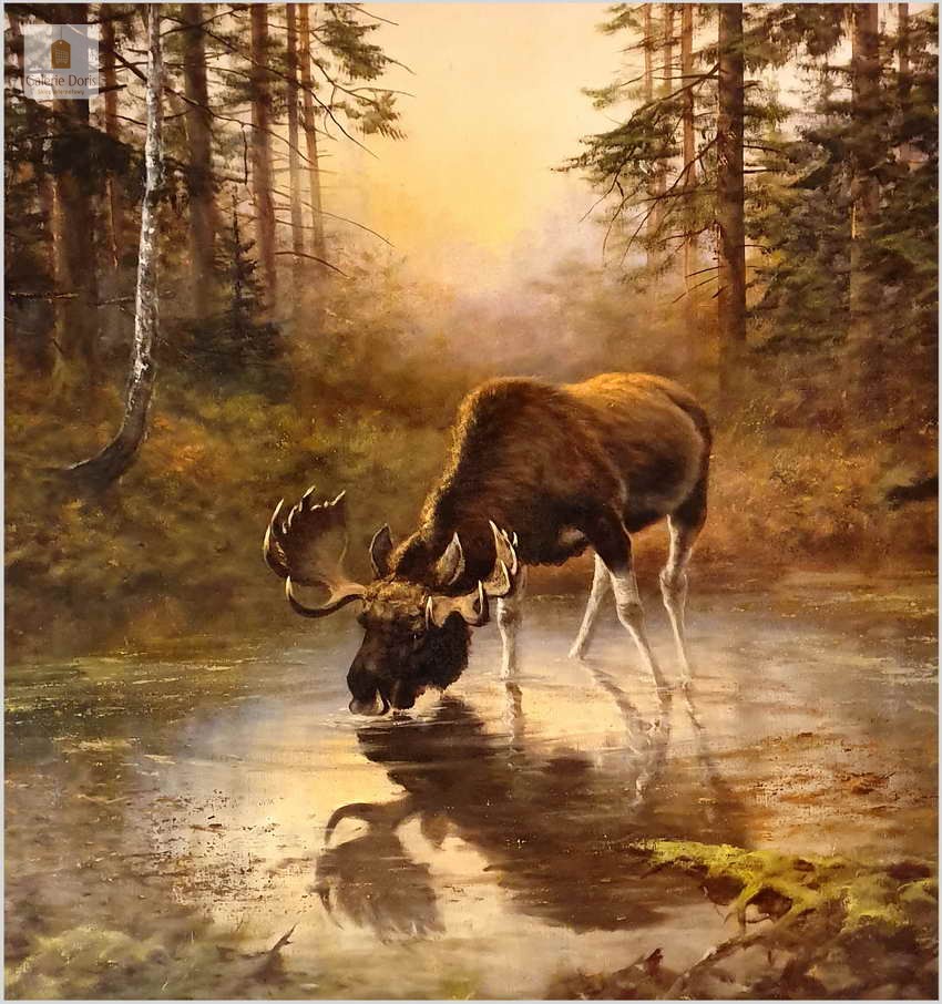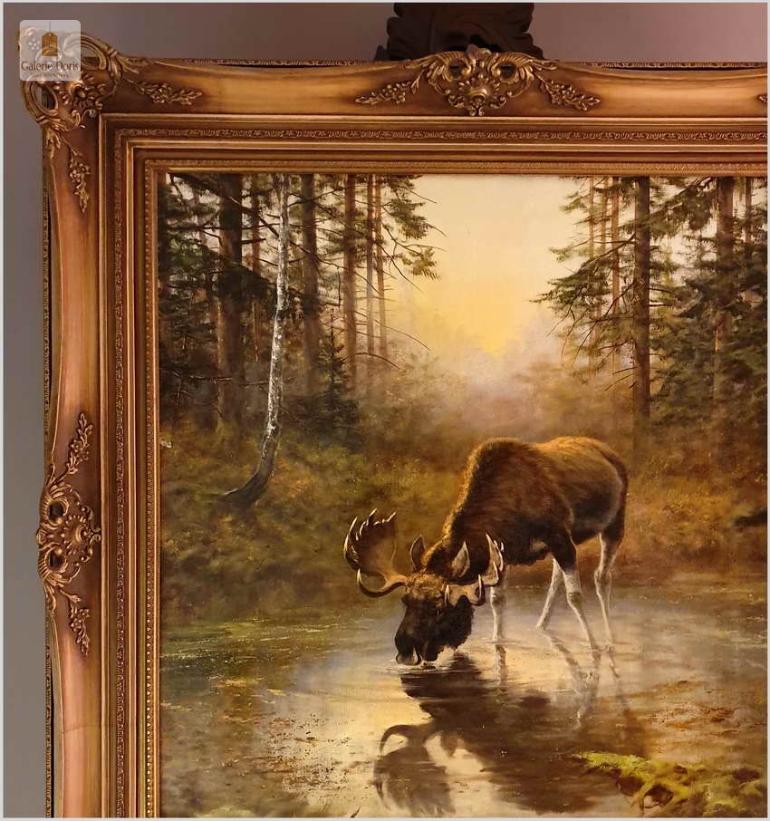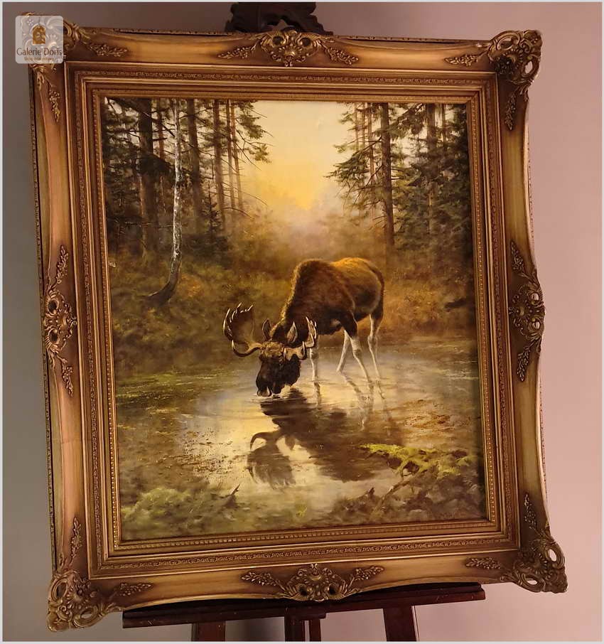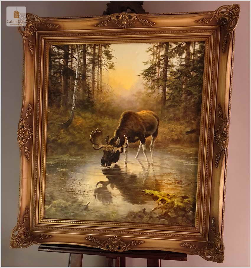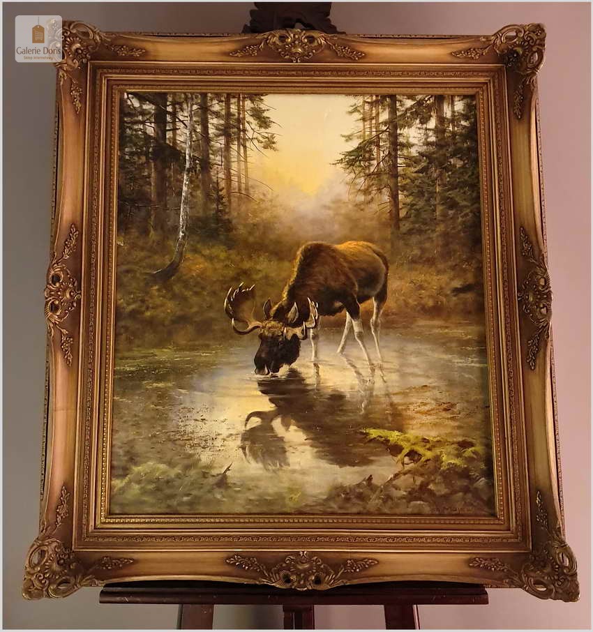 Przedstawiamy obraz olejny, który na wystawie w latach piędziesiątych XXw. zdobywał wyróżnienia w malarstwie animalistycznym. Bardzo dobra praca malarska. Obraz odznacza się dobrą perspektywą oraz wysmakowaną grą barw palety kolorystycznej. Oryginalny obraz olejny pędzla Georga Majewicza. W roli pierwszoplanowej dostojny łoś. Zwierzę to jest największy przedstawiciel rodziny jeleniowatych na świecie. Samiec łosia to byk, samica - klępa (czasami: łosza), a młode nazywamy cielakami lub łoszakami.  Poroże łosia (występuje wyłącznie u byków) może mieć kształt łopat, z niewielkimi wyrostkami, lub znacznie bardziej rozgałęzione, palczaste. Przy maksimum swojej wielkości (w okolicach 10 roku życia łosia), jego poroże może ważyć nawet 20 kilogramów! Łosie są z reguły samotnikami. Jedynie samice z młodymi na zimę mogą się zbierać w niewielkie grupy, ale samce cały rok żyją samotnie i dołączają do klęp jedynie na czas rui. Te wielkie zwierzęta nie są płochliwe. W przeciwieństwie do na przykład saren, które, jeśli się do nich za bardzo zbliżymy, szybko uciekają w bezpieczne miejsce, łosie co najwyżej nieśpiesznie usuną nam się z drogi. Obraz bez uszkodzeń, osadzony w oryginalną starą ramę z okresu wraz z certyfikatem oryginalności, gotowy do powieszenia - Polecamy!