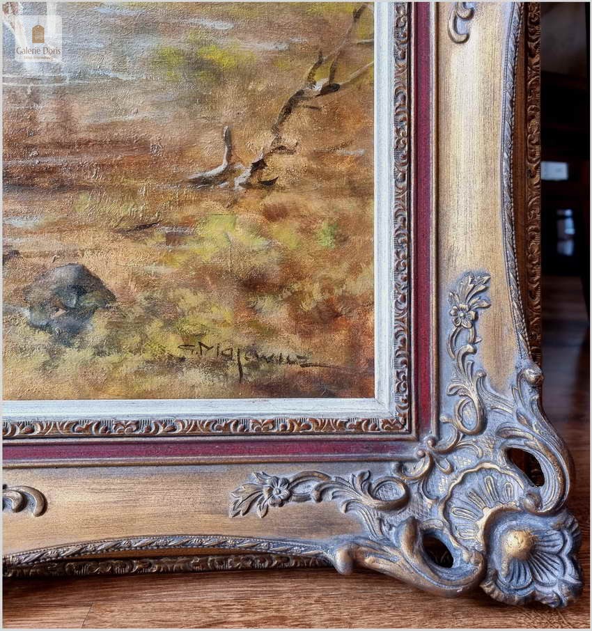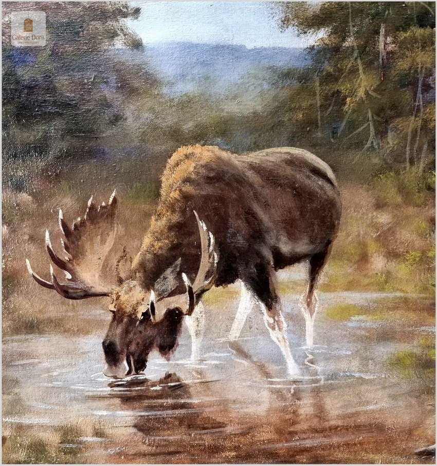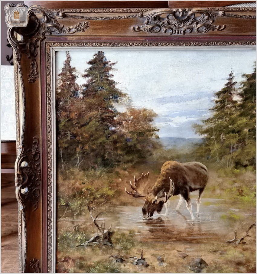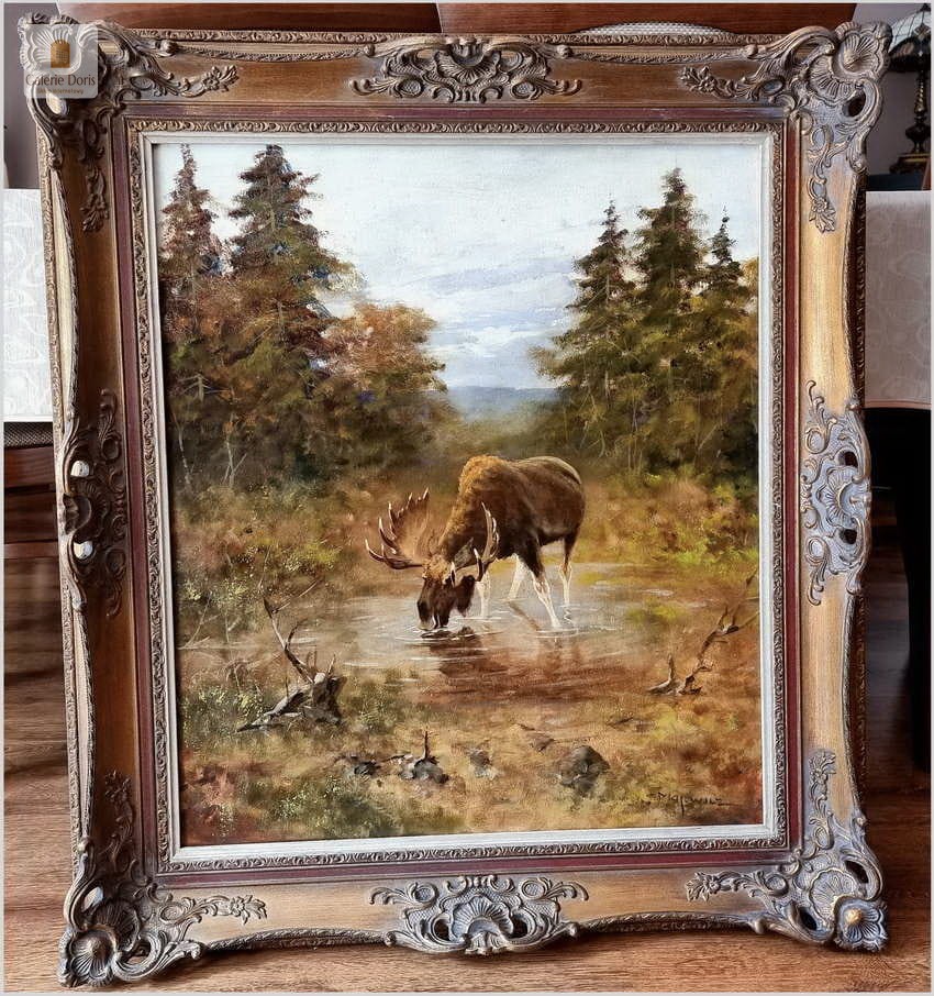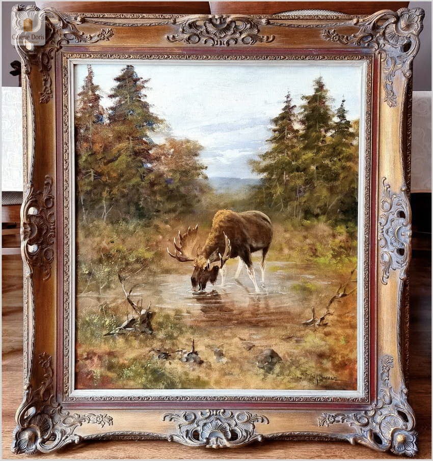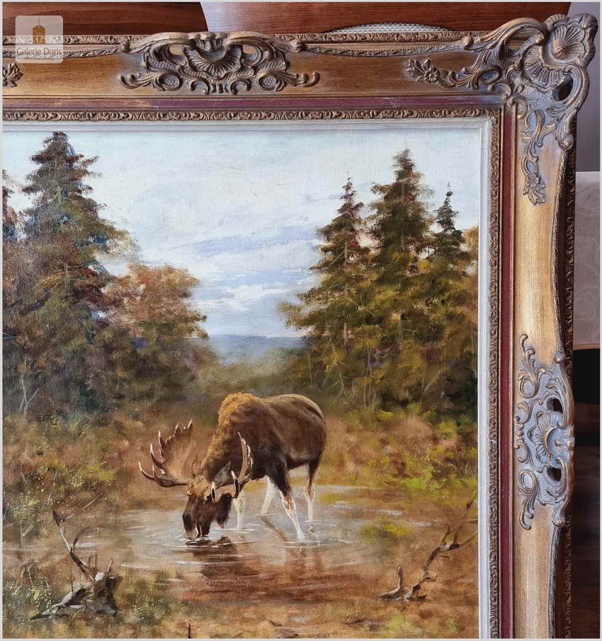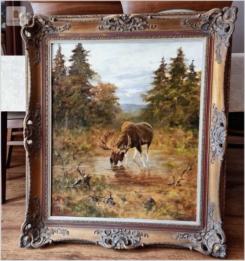 Bardzo dobra praca malarska. Obraz odznacza się dobrą perspektywą oraz wysmakowaną grą barw palety kolorystycznej. Oryginalny obraz olejny pędzla Georga Majewicza. W roli pierwszoplanowej dostojny łoś. Zwierzę to jest największy przedstawiciel rodziny jeleniowatych na świecie. Samiec łosia to byk, samica - klępa (czasami: łosza), a młode nazywamy cielakami lub łoszakami.  Poroże łosia (występuje wyłącznie u byków) może mieć kształt łopat, z niewielkimi wyrostkami, lub znacznie bardziej rozgałęzione, palczaste. Przy maksimum swojej wielkości (w okolicach 10 roku życia łosia), jego poroże może ważyć nawet 20 kilogramów! Łosie są z reguły samotnikami. Jedynie samice z młodymi na zimę mogą się zbierać w niewielkie grupy, ale samce cały rok żyją samotnie i dołączają do klęp jedynie na czas rui. Te wielkie zwierzęta nie są płochliwe. W przeciwieństwie do na przykład saren, które, jeśli się do nich za bardzo zbliżymy, szybko uciekają w bezpieczne miejsce, łosie co najwyżej nieśpiesznie usuną nam się z drogi. Obraz bez uszkodzeń, osadzony w oryginalną starą ramę z okresu wraz z certyfikatem oryginalności, gotowy do powieszenia - Polecamy!