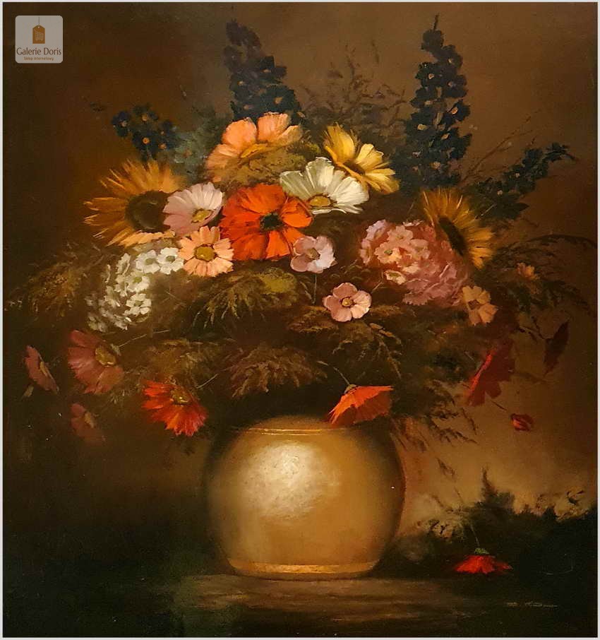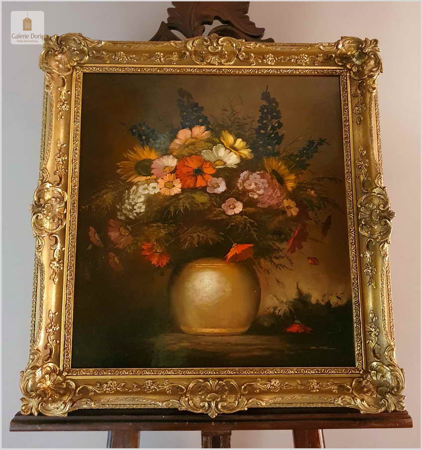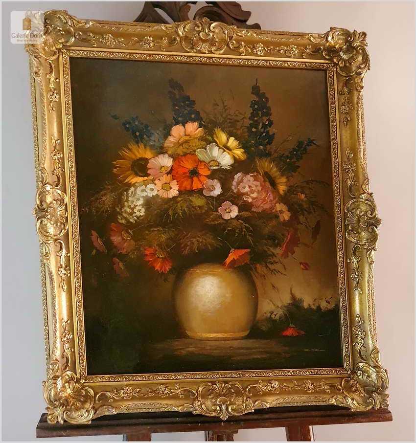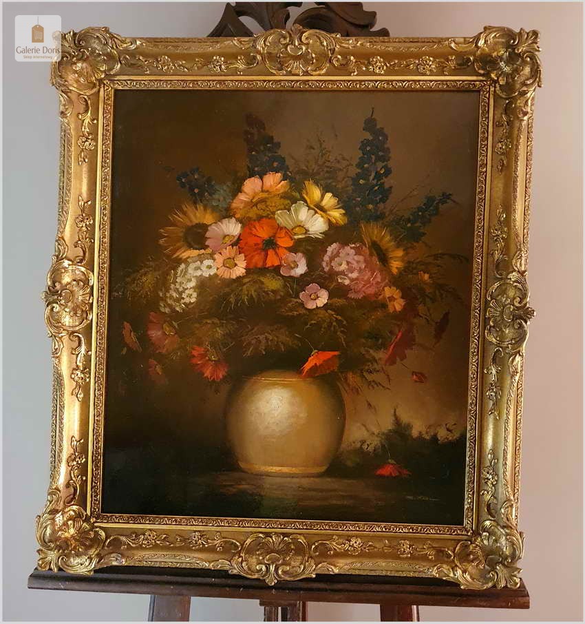 Oryginalny, niezwykle kunsztownie malowany obraz olejny na płycie, przedstawiający bukiet barwnych kwiatów w wazonie. Autorem tej pracy jest Niemiecka malarka Koll. Obraz malowany w technice pędzla, struktura nałożonej farby wyczuwalna pod palcami. Całość oprawiona w oryginalną, przestrzenną ramę.
